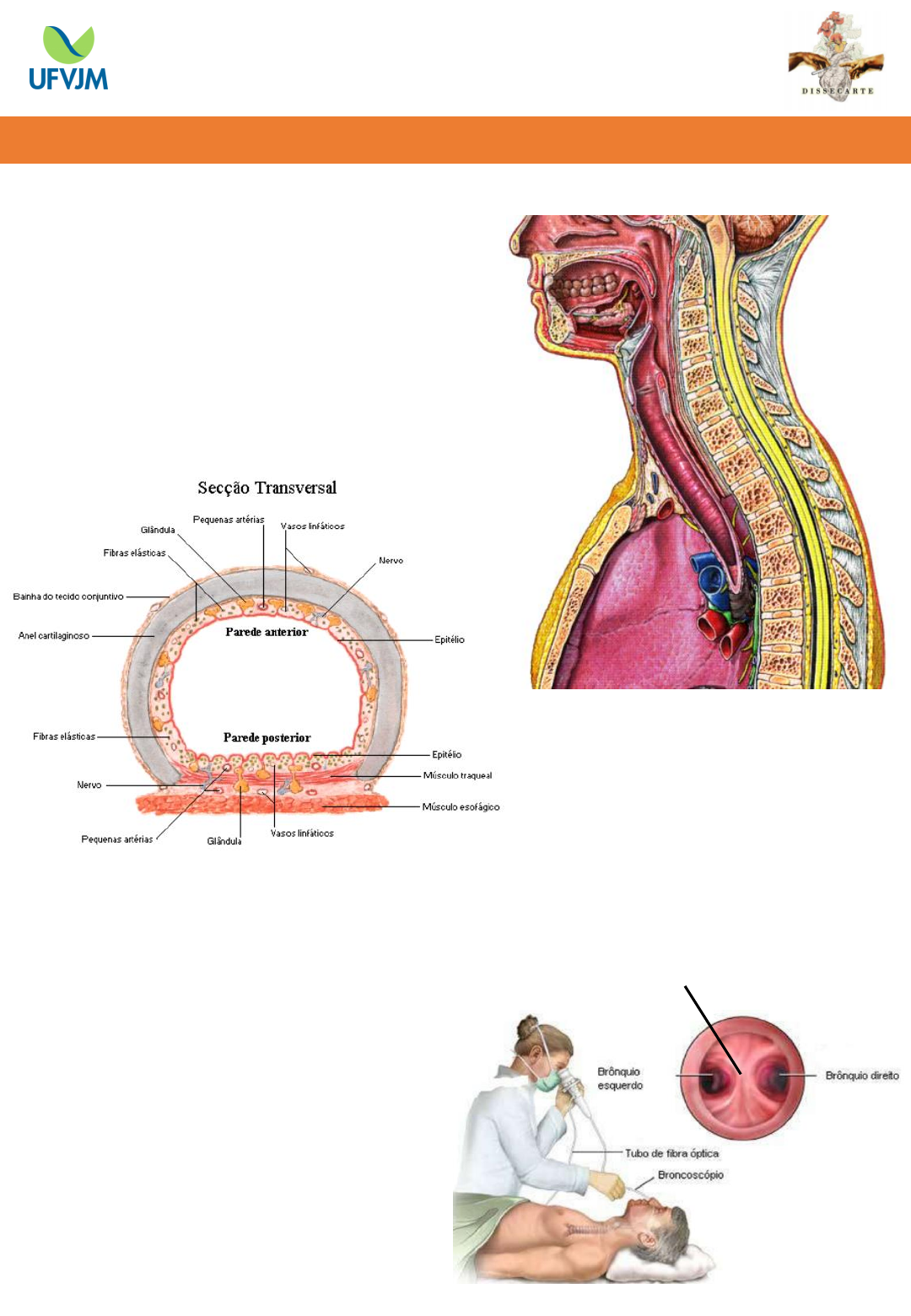 TRAQUEIA características • Órgão cervicotorácico: da IV VC a V VT; • Constitui-se de um tubo fibrocartilagíneo; Anterolateralmente: Anéis cartilaginosos incompletos = Anéis Traqueais Posteriormente: Musculo liso involuntário = Músculo Traqueal • Revestida internamente por mucosa • Ligamentos anulares: intercartilaginosos; • Carina: crista interna na bifurcação da traqueia, formada pela margem inferior da ultima cartilagem da traqueia. Ponto de referência durante a broncoscopia. Carina Parte cervical da traqueia Relações anteriores Pele; fáscias cervicais superficial e profunda; arco jugular; Mm. Esterno-hióideo e esternotireóideo; a 2ª à 4ª cartilagem são cruzadas pelo istmo da tireoide (acima: artéria anastomótica entre as Aa. Tireoideas superiores bilaterais / abaixo: fáscia pré-traqueal, as veias tireóideas inferiores, remanescentes tímicos e a artéria tireóidea ima - quando ela existe). Relações posteriores Esôfago. Relações laterais Lobos da tireóidea; Aa. carótida comum e tireóidea inferior; nervos laríngeos recorrentes. Parte torácica da traqueia Relações anteriores Mediastino superior: a traqueia localiza-se atrás do manúbrio esternal, das inserções dos músculos esterno-hioideo e esternotireóideo, dos remanescentes tímicos e da veia tireóidea inferior. As artérias braquiocefálica e carótida comum esquerda localizam-se à esquerda e à direita da traqueia, respectivamente, ao se dirigir superiormente pelo pescoço. A um nível inferior: o arco aórtico, as artérias braquiocefálica e carótida comum esquerda, a veia braquiocefálica esquerda, o plexo cardíaco profundo e alguns linfonodos. Relações posteriores Esôfago. Relações laterais • À direita: o pulmão direito e a pleura, a veia braquiocefálica direita, a veia cava superior, o nervo vago direito e a veia ázigos. • À esquerda: o arco da aorta e as artérias carótida comum, subclávia esquerda e o nervo laríngeo recorrente esquerdo relações irrigação • Artéria tireóidea inferior (principalmente); • Artéria tireóidea superior (ramos); • Artérias bronquiais rias bronquiais (ramos); • Artéria torácica interna (algumas vezes). Drenagem venosa Veias satélites das artérias para as veias tireóideas inferiores, esofágicas, mediastinais e ázigos. Drenagem Linfática • Parte cervical: - linfonodos pré-traqueais e paratraqueais - linfonodos cervicais profundos inferiores; • Parte torácica: - Linfonodos traqueobrônquicos Inervação Nervo laríngeo recorrente, ramos do plexo pulmonar e simpático (gânglio cervical inferior e I gânglio torácico).