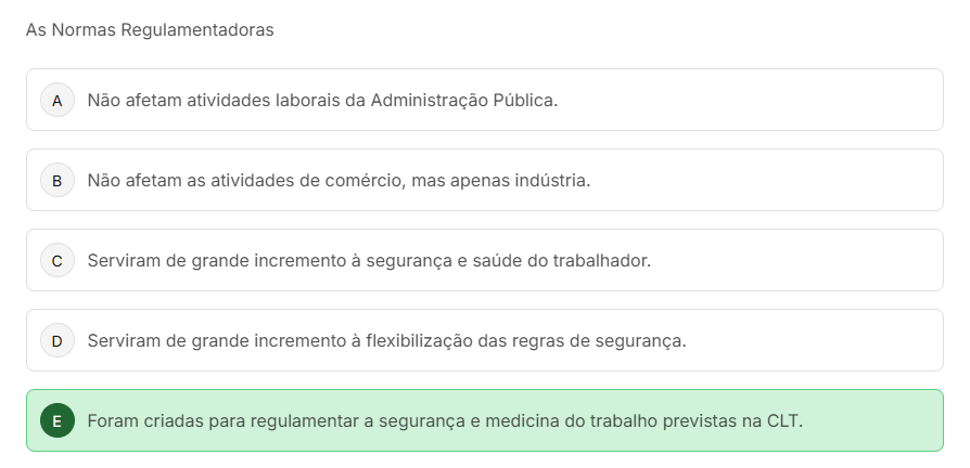 As Normas Regulamentadoras A Não afetam atividades laborais da Administração Pública. B Não afetam as atividades de comércio, mas apenas C Serviram de grande incremento à segurança e saúde do trabalhador. D Serviram de grande incremento à flexibilização das regras de segurança. E Foram criadas para regulamentar a segurança e medicina do trabalho previstas na CLT.