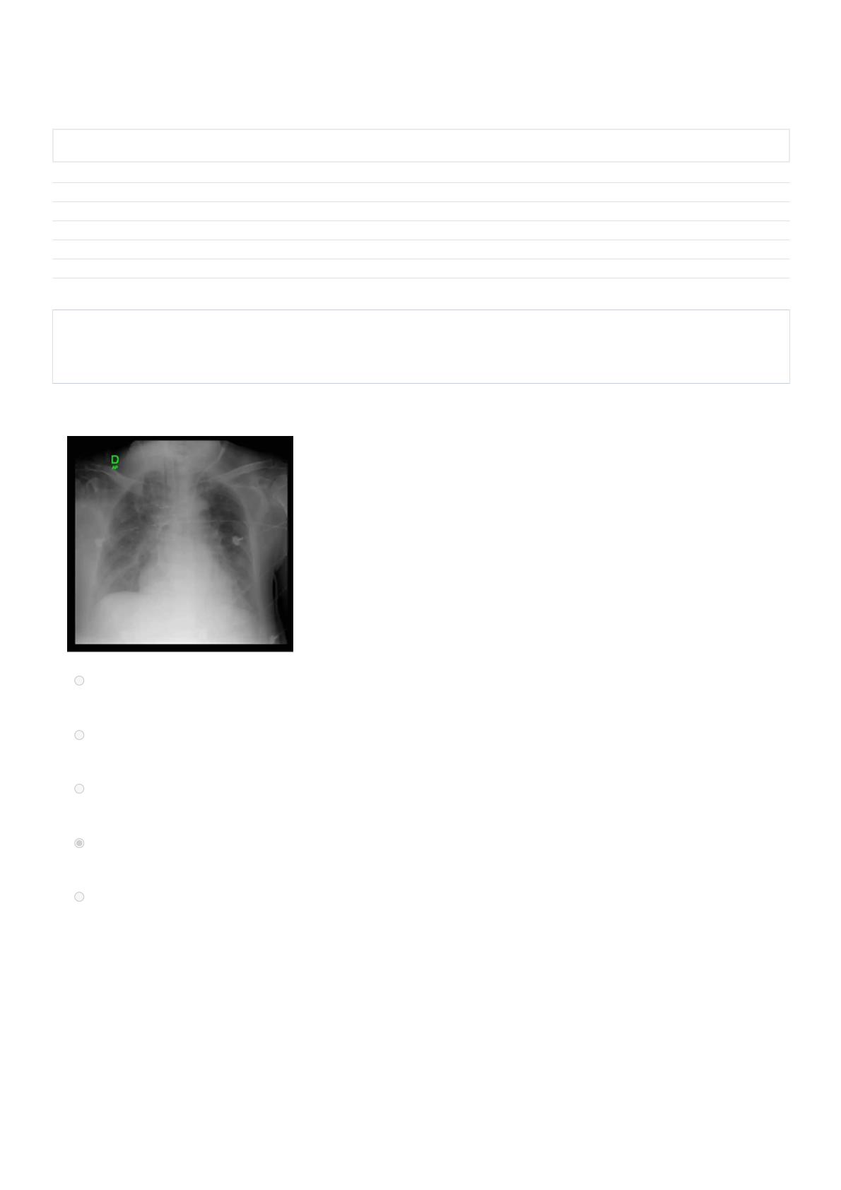 16/11/2021 18:48 2ª PROVA: Revisão da tentativa https://e-aula.ufpel.edu.br/mod/quiz/review.php?attempt=639704&cmid=494257 1/13 Painel / Meus cursos / 2021/1 - 07430005 - M1 - DIAGNÓSTICO POR IMAGEM / 16/11 2ª PROVA / 2ª PROVA Iniciado em terça, 16 nov 2021, 18:00 Estado Finalizada Concluída em terça, 16 nov 2021, 18:47 Tempo empregado 46 minutos 48 segundos Notas 20,00/20,00 Avaliar 10,00 de um máximo de 10,00(100%) Questão 1 Correto Atingiu 1,00 de 1,00 Os cateteres venosos profundos estão bem posicionados a. Há um dreno de tórax à direita b. Há pneumonia lobar grave c. O TOT está muito alto, é preciso reintroduzi-lo d. A área cardíaca parece aumentada e. Nenhuma correta Sua resposta está correta. A resposta correta é: A área cardíaca parece aumentada https://e-aula.ufpel.edu.br/my/ https://e-aula.ufpel.edu.br/course/view.php?id=9493 https://e-aula.ufpel.edu.br/course/view.php?id=9493#section-20 https://e-aula.ufpel.edu.br/mod/quiz/view.php?id=494257 16/11/2021 18:48 2ª PROVA: Revisão da tentativa https://e-aula.ufpel.edu.br/mod/quiz/review.php?attempt=639704&cmid=494257 2/13 Questão 2 Correto Atingiu 1,00 de 1,00 Paciente 30 anos, sexo masculino, com quadro de febre e tosse, evoluindo com anosmia. Chegou à emergência com sat 88%, taquipneico e febril. Foi realizada tomografia computadorizada do tórax. a. Atenuação em vidro fosco nos lobos superior e inferior direito. Covid-19 b. Nenhuma correta c. Consolidação no lobo inferior direito. Covid-19. d. Sinal do halo invertido no lobo inferior esquerdo. Covid-19 e. Consolidação no lobo superior direito. Pneumonia lobar. Sua resposta está correta. A resposta correta é: Atenuação em vidro fosco nos lobos superior e inferior direito. Covid-19 16/11/2021 18:48 2ª PROVA: Revisão da tentativa https://e-aula.ufpel.edu.br/mod/quiz/review.php?attempt=639704&cmid=494257 3/13 Questão 3 Correto Atingiu 1,00 de 1,00 os achados apontados nas figuras acima evidenciam: a. Consolidação, lesão expansiva, linfonodomegalia b. Linfonodomegalia, cavitação, consolidação c. Nenhuma correta d. Nódulos centrolobulares, lesão expansiva, linfonodomegalia e. Cavitação, derrame pleural, pneumotórax Sua resposta está correta. 16/11/2021 18:48 2ª PROVA: Revisão da tentativa https://e-aula.ufpel.edu.br/mod/quiz/review.php?attempt=639704&cmid=494257 4/13 Questão 4 Correto Atingiu 1,00 de 1,00 A resposta correta é: Nenhuma correta Sobre a questão número 3 a. Nenhuma das alternativas está correta b. A cavitação é melhor vista na janela de mediastino c. A linfonodomegalia é melhor vista na janela pulmonar d. O pneumotórax é bilateral e. O exame é com contraste Sua resposta está correta. A resposta correta é: Nenhuma das alternativas está correta 16/11/2021 18:48 2ª PROVA: Revisão da tentativa https://e-aula.ufpel.edu.br/mod/quiz/review.php?attempt=639704&cmid=494257 5/13 Questão 5 Correto Atingiu 1,00 de 1,00 Ainda sobre a questão número 3, a melhor hipótese diagnóstica é: a. Histoplasmose b. Tuberculose com disseminação hematogênica c. Nenhuma correta d. Broncopneumonia e. tuberculose com disseminação broncogênica Sua resposta está correta. A resposta correta é: tuberculose com disseminação broncogênica 16/11/2021 18:48 2ª PROVA: Revisão da tentativa https://e-aula.ufpel.edu.br/mod/quiz/review.php?attempt=639704&cmid=494257 6/13 Questão 6 Correto Atingiu 1,00 de 1,00 Para os seguintes diagnósticos necessitamos de angiotomografia: a. Covid-19 b. Embolia pulmonar c. Dissecção de aorta d. Nenhuma correta e. B e C estão corretas Sua resposta está correta. A resposta correta é: B e C estão corretas 16/11/2021 18:48 2ª PROVA: Revisão da tentativa https://e-aula.ufpel.edu.br/mod/quiz/review.php?attempt=639704&cmid=494257 7/13 Questão 7 Correto Atingiu 4,00 de 4,00 Observe as figuras e coloque os achados na ordem correta 16/11/2021 18:48 2ª PROVA: Revisão da tentativa https://e-aula.ufpel.edu.br/mod/quiz/review.php?attempt=639704&cmid=494257 8/13 Questão 8 Correto Atingiu 1,00 de 1,00 a. Neoplasia hepática, pneumotórax, obstrução de delgado, pneumoperitônio b. Nenhuma correta c. Esteatose hepática, pneumotórax, obstrução de delgado, pneumotórax d. Esteatose hepática, neoplasia pulmonar, pneumoperitônio, pneumotórax e. Esteatose hepática, pneumatocele, obstrução de colon, pneumotórax Sua resposta está correta. A resposta correta é: Nenhuma correta É sinal clássico de derrame pleural (1)Opacidade na base pulmonar (2)Parábola de Demoiseau(sinal do menisco) a. as duas estão certas b. somente a segunda está certa c. as duas estão erradas Sua resposta está correta. A resposta correta é: somente a segunda está certa 16/11/2021 18:48 2ª PROVA: Revisão da tentativa https://e-aula.ufpel.edu.br/mod/quiz/review.php?attempt=639704&cmid=494257 9/13 Questão 9 Correto Atingiu 1,00 de 1,00 Questão 10 Correto Atingiu 1,00 de 1,00 São causas de hemitórax opaco (1)pneumonia (2)derrame pleural maciço (3)atelectasia a. todas estão certas b. somente derrame pleural maciço c. todas estão erradas Sua resposta está correta. A resposta correta é: todas estão certas Qual o local onde se acumula primeiramente o derrame pleural (1)seio costo frênico posterior (2)seio costo frênico lateral (3)na janela aorto pulmonar a. somente 1 b. somente 2 c. todas estão certas Sua resposta está correta. A resposta correta é: somente 1 16/11/2021 18:48 2ª PROVA: Revisão da tentativa https://e-aula.ufpel.edu.br/mod/quiz/review.php?attempt=639704&cmid=494257 10/13 Questão 11 Correto Atingiu 1,00 de 1,00 Questão 12 Correto Atingiu 1,00 de 1,00 O nível hidro aéreo se forma quando a radiografia (1)é feita com raios X verticais (2)é feita com raios X horizontais (3)Quando coexistem em uma mesma cavidade ar e líquido, independente da orientação dos raios-X a. 1 & 3 estão certos b. 2 & 3 estão certos c. Somente 2 Sua resposta está correta. A resposta correta é: Somente 