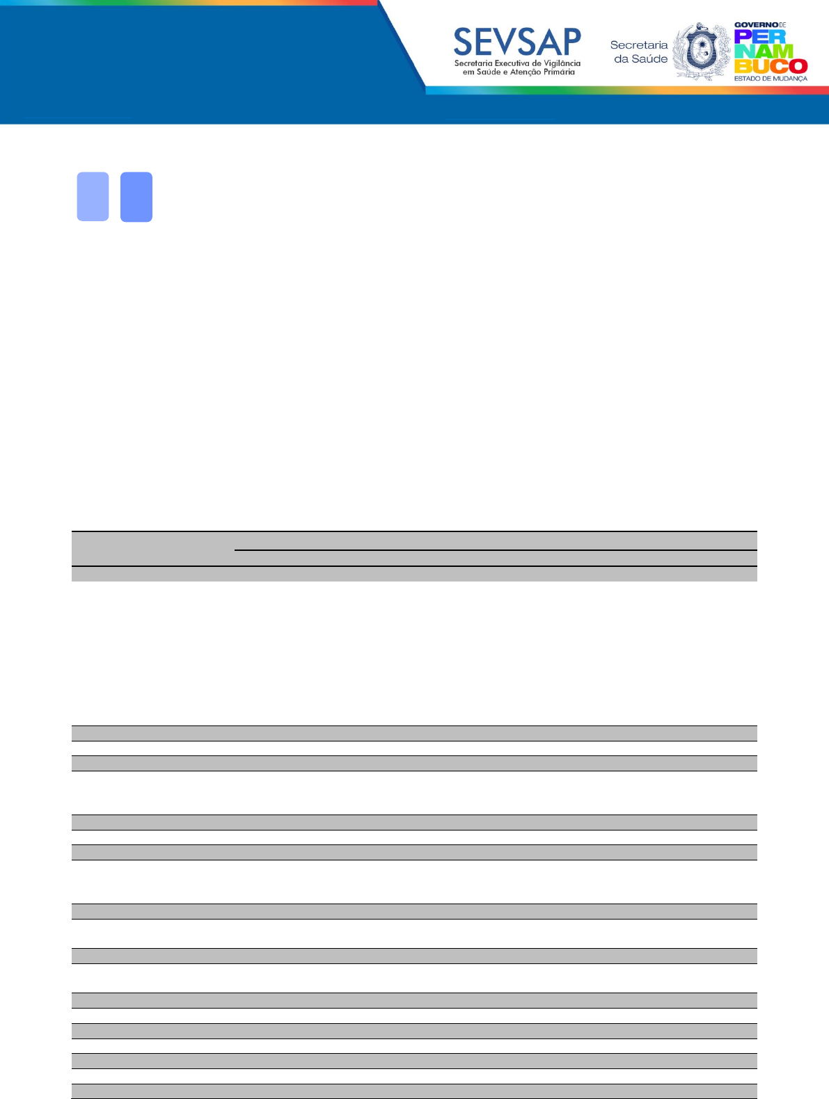 Informe Técnico – n° 36/2024 Doença Meningocócica Dados atualizados até: 13/09/2024 Período de Referência: SE 36/2024 (01 a 07/09/2024) Doença Meningocócica Informe Epidemiológico SE 36/2024 Casos Em 2024, até o momento foram notificados 19 casos de doença meningocócica, desses, 10 foram confirmados, 08 descartados e 01 em investigação. No mesmo período em 2023, foram notificados 22 casos, desses, 13 foram confirmados e 09 descartados. Em todo o ano de 2023, foram notificados 39 casos de doença meningocócica, desses, 21 foram confirmados e 18 descartados. Tabela 01. Número de casos de Doença Meningocócica por classificação final, município e Geres no mesmo período. Pernambuco, 2023 – 2024 (até SE 36)¹ Fonte: SIDI/SES-PE. Nota: 1 Dados provisórios sujeitos à revisão. ² Não houve registros de casos nos municípios/Geres não referidos. Município Geres 2 Notificado Confirmado Descartado Em investigação 2023 2024 2023 2024 2023 2024 2023 2024 I Geres 10 11 7 6 3 5 - - Araçoiaba 1 - - - 1 - - - Cabo 1 - 1 - - - - - Camaragibe - 1 - - - 1 - - Chã Grande - 1 - 1 - - - - Igarassu 2 - 2 - - - - - Itapissuma 1 - 1 - - - - - Jaboatão dos Guararapes 2 2 1 2 1 - - - Olinda - 1 - - - 1 - - Paulista 1 - 1 - - - - - Recife 2 6 1 3 1 3 - - II Geres 1 - - - 1 - - - Limoeiro 1 - - - 1 - - - IV Geres 1 2 1 1 - - - 1 Agrestina 1 - 1 - - - - - St ª Maria do Cambucá - 1 - 1 - - - - Sanharó - 1 - - - - - 1 V Geres 1 - - - 1 - - - Garanhuns 1 - - - 1 - - - VI Geres 2 3 2 2 - 1 - - Arcoverde 1 - 1 - - - - - Buique 1 1 1 1 - - - - Venturosa - 2 - 1 - 1 - - VIII Geres 4 1 2 1 2 - - - Lagoa Grande 4 - 2 - 2 - - - Petrolina - 1 - 1 - - - - X Geres 2 - 1 - 1 - - - Itapetim 1 - - - 1 - - - Santa Terezinha 1 - 1 - - - - - IX Geres - 1 - - - 1 - - Araripina - 1 - - - 1 - - XI Geres 1 - - - 1 - - - Serra Talhada 1 - - - 1 - - - XII Geres - 1 - - - 1 - - Aliança - 1 - - - 1 - - PE 22 19 13 10 9 8 - 1 Informe Técnico – n° 36/2024 Doença Meningocócica Dados atualizados até: 13/09/2024 Período de Referência: SE 36/2024 (01 a 07/09/2024) Gráfico 01. Diagrama de controle de casos suspeitos de Doença Meningocócica por SE. Pernambuco, 2024 (até SE 36) 1 Fonte: CDI/SIDI/DGVE/SEVSAP/SES-PE. Nota: 1 Dados provisórios sujeitos à revisão. Tabela 02. Distribuição dos casos confirmados de DM por faixa etária. Pernambuco, 2024 (até SE 36) 1 Faixa etária (em anos) 2024 Nº % 60 1 10 Total 10 100 Fonte: SIDI/SES-PE. Nota: 1 Dados provisórios sujeitos à revisão. Óbitos No ano de 2024, até o momento (SE 36), houve 02 óbitos pela doença em uma criança de 07 anos e em uma senhora de 85 anos, ambas do sexo feminino, residente do município de Recife (I Geres) e Venturosa (VI Geres), respectivamente. No ano de 2023, até a SE 36 houve registro de 02 óbitos, residentes do município de Jaboatão dos Guararapes e de Arcoverde. Em todo o ano de 2023 foram registrados 03 óbitos, 02 do município de Jaboatão dos Guararapes e 01 do município de Arcoverde. 0 1 2 3 4 1 2 3 4 5 6 7 8 9 10 11 12 13 14 15 16 17 18 19 20 21 22 23 24 25 26 27 28 29 30 31 32 33 34 35 36 N º d e c a s o s Zona de Controle Zona de Alerta 2024 Informe Técnico – n° 36/2024 Doença Meningocócica Dados atualizados até: 13/09/2024 Período de Referência: SE 36/2024 (01 a 07/09/2024) EXPEDIENTE Governadora de Pernambuco Raquel Teixeira Lyra Lucena Vice Governadora de Pernambuco Priscila Krause Branco Secretária Estadual de Saúde Zilda do Rego Cavalcanti Secretário-Executivo de Vigilância em Saúde e Atenção Primária Bruno Issao Matos Ishigami Diretor Geral de Vigilância Epidemiológica Lucas Rafael de Castro Caheté Superintendente de Imunizações e Vigilância das Doenças Imunopreveníveis Jeane Tavares Coordenadora de Vigilância das Doenças Imunopreveníveis Jéssyk Ferreira Equipe Técnica - Vigilância Epidemiológica das Meningites Roseane Serrano CONTATOS Fones: (81) 3184-0224 E-mail: meningite.pe@gmail.com Endereço:Rua Dona Maria Augusta Nogueira, 519. Bongi, Recife-PE, CEP: 50751-530 Elaboração Roseane Serrano Revisão Final Ana Antunes /Jéssyk Ferreira Periodicidade Semanal Projeto Gráfico Rafael Azevedo de Oliveira Disponível para download em: https://www.cievspe.com/informes-sevsap