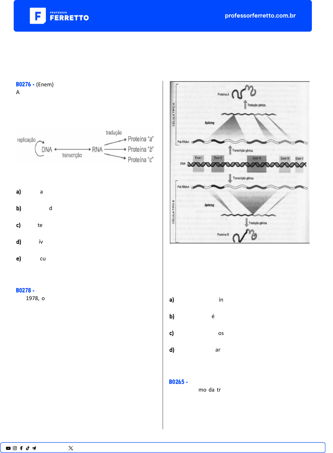 Biologia Molecular e Engenharia Genética Ácidos Nucleicos - Transcrição e RNA B0276 - (Enem) A figura seguinte representa um modelo de transmissão da informação gené�ca nos sistemas biológicos. No fim do processo, que inclui a replicação, a transcrição e a tradução, há três formas proteicas diferentes denominadas a, b e c. Depreende-se do modelo que a) a única molécula que par�cipa da produção de proteínas é o DNA. b) o fluxo de informação gené�ca, nos sistemas biológicos, é unidirecional. c) as fontes de informação a�vas durante o processo de transcrição são as proteínas. d) é possível obter diferentes variantes proteicas a par�r de um mesmo produto de transcrição. e) a molécula de DNA possui forma circular e as demais moléculas possuem forma de fita simples linearizadas. B0278 - (Uern) Em 1978, o gene�cista Walter Gilbert propôs os termos exon para designar as regiões de um gene que codifica uma sequência de aminoácidos, e intron para designar as regiões de um gene não traduzidas, localizadas entre os exons. A Ciência es�ma que seja de 30 mil o número de genes da espécie humana, no entanto o número de proteínas diferentes esteja es�mado entre 100 mil a 120 mil. Isso ocorre devido ao(a) a) união de proteínas recém-sinte�zadas, formando novos compostos. b) splicing, isto é, cortes e montagens diferentes do mesmo RNA-mensageiro. c) genes que, a�vos em uma célula, podem estar ina�vados em outra. d) diferença da carga gené�ca nos �pos de células diferenciados. B0265 - (Uece) No mecanismo da transcrição, uma das fitas do DNA (a fita molde) é transcrita em RNA mensageiro pela ação de 1@professorferretto @prof_ferretto a) um pep�deo sinalizador iniciador. b) dois RNAs ribossômicos acoplados. c) uma enzima denominada RNA polimerase dependente de DNA. d) uma associação de RNAs ribossômicos com vários RNAs transportadores. B0273 - (Fcm-Jp) A transcrição produz uma cópia fiel do filamento molde do gene; se o gene con�ver introns, o transcrito primário incluirá cópias deles; entretanto os introns precisam ser removidos e as regiões de exons do transcrito ligadas umas às outras, antes que ocorra a tradução. Esse processo é denominado: a) Me�lação. b) Adição. c) Permutação (Crossing-over). d) Ligação gênica (Linkage). e) Recomposição (Splicing). B0279 - (Unifor) A figura abaixo ilustra o paradoxo do número de genes: muitos organismos menos complexos que o Homo sapiens têm tantos ou mais genes que este. A expecta�va, diante do sequenciamento do genoma humano, era a revelação da complicada receita necessária à construção de uma pessoa. Acreditava-se na descoberta de aproximadamente 100 mil genes que jus�ficassem o mesmo número de proteínas produzidas pela espécie humana. AMARAL, P. P. R. e NAKAYA, H. I. DNA não-codificador. In: Ciência Hoje. v. 38, n.228 julho 2006. (com adaptações) Com base nas informações acima, é possível concluir que: a) As complexidades morfológica e fisiológica de uma espécie estão diretamente relacionadas ao tamanho do genoma e ao número de genes. b) O maior número de genes observado no Arroz (Oriza sa�va) o torna um organismo mais complexo do que o Camundongo (Mus musculus). c) Quanto mais complexo o organismo, menor o número de genes presente no seu genoma, como se observa na Mosca-das-frutas (Drosofila melanogaster). d) Os genes do Protozoário (Trypanossoma cruzi) podem ser editados de várias formas, o que o torna um organismo mais complexo do que a Mosca-das-frutas (Drosofila melanogaster). e) Quanto mais complexo o organismo, maior probabilidade de ter se tornado assim ao sinte�zar várias proteínas a par�r de um único gene. B0280 - (Enem) Define-se genoma como o conjunto de todo o material gené�co de uma espécie, que, na maioria dos casos, são as moléculas de DNA. Durante muito tempo, especulou- se sobre a possível relação entre o tamanho do genoma – medido pelo número de pares de bases (pb) – , o número de proteínas produzidas e a complexidade do organismo. As primeiras respostas começam a aparecer e já deixam claro que essa relação não existe, como mostra a tabela abaixo. Internet: www.cbs.dtu.dk e . De acordo com as informações acima, 2@professorferretto @prof_ferretto a) o conjunto de genes de um organismo define o seu DNA. b) a produção de proteínas não está vinculada à molécula de DNA. c) o tamanho do genoma não é diretamente proporcional ao número de proteínas produzidas pelo organismo. d) quanto mais complexo o organismo, maior o tamanho de seu genoma. e) genomas com mais de um bilhão de pares de bases são encontrados apenas nos seres vertebrados. B0274 - (Upe) Analise a figura a seguir: Disponível em: h�p://www.clker.com/inc/svgedit/svg- editor.html?paramurl=/inc/clean.html?id=49537 (Adaptado) Correlacione o texto abaixo com a figura. A polimerase do RNA, ao percorrer uma unidade de transcrição no (1), transcreve tanto exons quanto introns, produzindo uma molécula, o (2). Ainda no núcleo, o processo de splicing é realizado por várias par�culas cons�tuídas por proteínas e pequenas moléculas de RNA, as (3), que irão formar o (4), responsável pelos cortes e pelas emendas de introns e de exons, respec�vamente. Após a eliminação dos (5), o (6) estará com sua informação gené�ca devidamente editada e poderá passar para o citoplasma, onde se reunirá aos ribossomos para ser traduzido em polipep�dio. Assinale a alterna�va que contém os termos que preenchem corretamente os espaços (1), (2), (3), (4), (5) e (6). a) (1) DNA, (2) pré-RNA mensageiro, (3) ribonucleoproteínas, (4) spliciossomo, (5) introns, (6) RNA mensageiro. b) (1) DNA, (2) RNA mensageiro, (3) ribonucleases, (4) polipep�dio, (5) exons, (6) polipep�dio. c) (1) Pré-RNA mensageiro, (2) DNA, (3) ribonucleoproteínas, (4) spliciossomo, (5) introns, (6) RNA mensageiro. d) (1) RNA