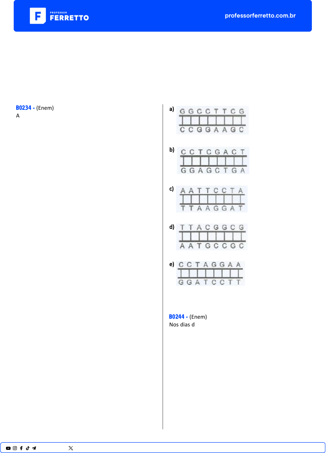 ENEM Biologia Molecular e Engenharia Genética Ácidos Nucleicos - DNA e Replicação B0234 - (Enem) A reação em cadeia da polimerase (PCR, na sigla em inglês) é uma técnica de biologia molecular que permite replicação in vitro do DNA de forma rápida. Essa técnica surgiu na década de 1980 e permi�u avanços cien�ficos em todas as áreas de inves�gação genômica. A dupla hélice é estabilizada por ligações hidrogênio, duas entre as bases adenina (A) e �mina (T) e três entre as bases guanina (G) e citosina (C). Inicialmente, para que o DNA possa ser replicado, a dupla hélice precisa ser totalmente desnaturada (desenrolada) pelo aumento da temperatura, quando são desfeitas as ligações hidrogênio entre as diferentes bases nitrogenadas. Qual dos segmentos de DNA será o primeiro a desnaturar totalmente durante o aumento da temperatura na reação de PCR? a) b) c) d) e) B0244 - (Enem) Nos dias de hoje, podemos dizer que pra�camente todos os seres humanos já ouviram em algum momento falar sobre o DNA e seu papel na hereditariedade da maioria dos organismos. Porém, foi apenas em 1952, um ano antes da descrição do modelo do DNA em dupla hélice por Watson e Crick, que foi confirmado sem sombra de dúvidas que o DNA é material gené�co. No ar�go em que Watson e Crick descreveram a molécula de DNA, eles sugeriram um modelo de como essa molécula deveria se replicar. Em 1958, Meselson e Stahl realizaram experimentos u�lizando isótopos pesados de nitrogênio que foram incorporados às bases nitrogenadas para avaliar como se daria a replicação da molécula. A par�r 1@professorferretto @prof_ferretto dos resultados, confirmaram o modelo sugerido por Watson e Crick, que �nha como premissa básica o rompimento das pontes de hidrogênio entre as bases nitrogenadas. GRIFFITHS, A. J. F. et al. Introdução à Gené�ca. Rio de Janeiro: Guanabara Koogan, 2002. Considerando a estrutura da molécula de DNA e a posição das pontes de hidrogênio na mesma, os experimentos realizados por Meselson e Stahl a respeito da replicação dessa molécula levaram à conclusão de que a) a replicação do DNA é conserva�va, isto é, a fita dupla filha é recém-sinte�zada e o filamento parental é conservado. b) a replicação de DNA é dispersiva, isto é, as fitas filhas contêm DNA recém-sinte�zado e parentais em cada uma das fitas. c) a replicação é semiconserva�va, isto é, as fitas filhas consistem de uma fita parental e uma recém- sinte�zada. d) a replicação do DNA é conserva�va, isto é, as fitas filhas consistem de moléculas de DNA parental. e) a replicação é semiconserva�va, isto é, as fitas filhas consistem de uma fita molde e uma fita codificadora. B0237 - (Enem) Em 1950, Erwin Chargaff e colaboradores estudavam a composição química do DNA e observaram que a quan�dade de adenina (A) é igual à de �mina (T), e a quan�dade de guanina (G) é igual à de citosina (C) na grande maioria das fitas duplas de DNA. Em outras palavras, esses cien�stas descobriram que o total de purinas (A + G) e o total de pirimidinas (C + T) eram iguais. Um professor trabalhou esses conceitos em sala de aula e apresentou como exemplo uma fita simples de DNA com 20 adeninas, 25 �minas, 30 guaninas e 25 citosinas. Qual a quan�dade de cada um dos nucleo�deos, quando considerada a dupla fita de DNA formada pela fita simples exemplificada pelo professor? a) Adenina: 20; Timina: 25; Guanina: 25; Citosina: 30. b) Adenina: 25; Timina: 20; Guanina: 45; Citosina: 45. c) Adenina: 45; Timina: 45; Guanina: 55; Citosina: 55. d) Adenina: 50; Timina: 50; Guanina: 50; Citosina: 50. e) Adenina: 55; Timina: 55; Guanina: 45; Citosina: 45. B0226 - (Enem) Um fabricante afirma que um produto disponível comercialmente possui DNA vegetal, elemento que proporcionaria melhor hidratação dos cabelos. Sobre as caracterís�cas químicas dessa molécula essencial à vida, é correto afirmar que o DNA a) de qualquer espécie serviria, já que têm a mesma composição. b) de origem vegetal é diferente quimicamente dos demais, pois possui clorofila. c) das bactérias poderia causar mutações no couro cabeludo. d) dos animais encontra-se sempre enovelado e é de di�cil absorção. e) de caracterís�cas básicas, assegura sua eficiência hidratante. 2@professorferretto @prof_ferretto