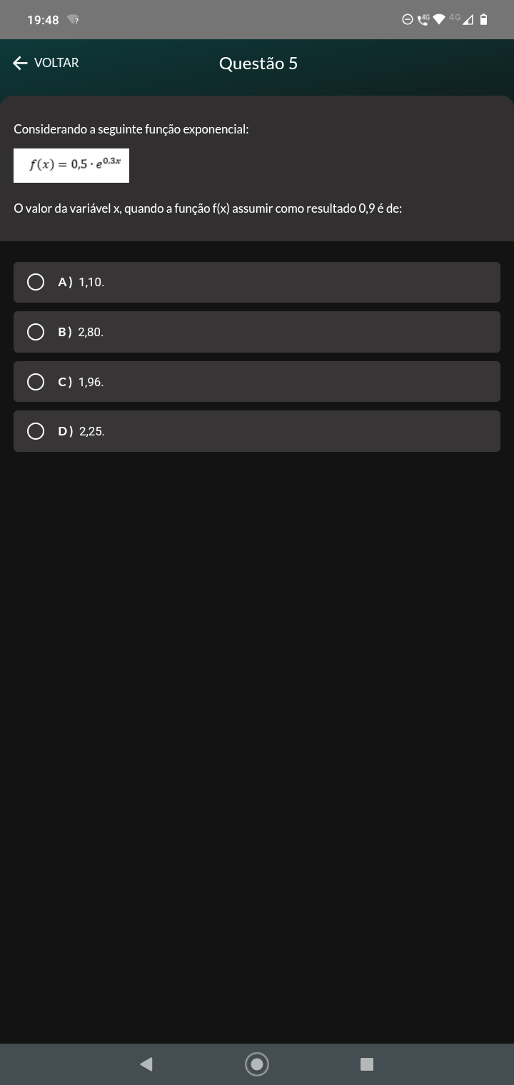 VOLTAR Questão 5 Considerando a seguinte função exponencial: O valor da variável X, quando a função f(x) assumir como resultado 0,9 é de: A) 1,10. B) C) 1,96. D) 2,25.