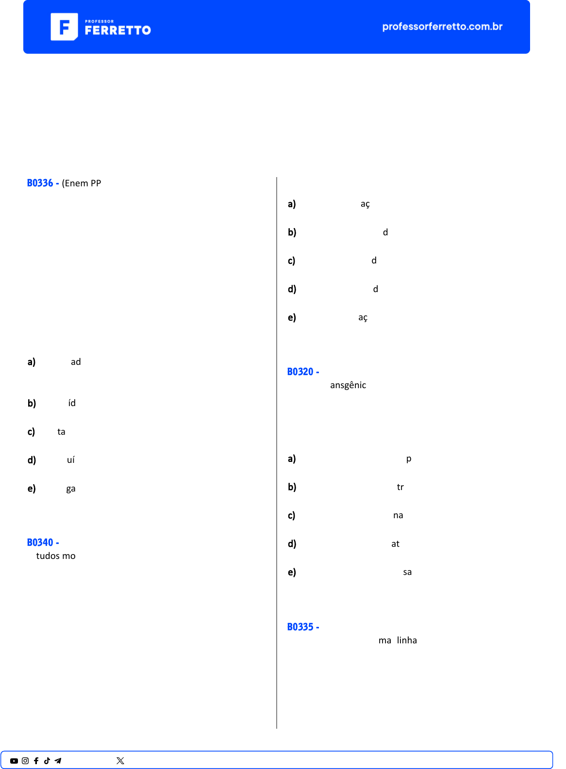 ENEM Biologia Molecular e Engenharia Genética Engenharia Genética B0336 - (Enem PPL) Após a germinação, normalmente, os tomates produzem uma proteína que os faz amolecer depois de colhidos. Os cien�stas introduziram, em um tomateiro, um gene an�ssen�do (imagem espelho do gene natural) àquele que codifica a enzima "amolecedora". O novo gene an�ssen�do bloqueou a síntese da proteína amolecedora. SIZER, F.;WHITNEY, E. Nutrição: conceitos e controvérsias. Barueri: Manole, 2002 (adaptado). Um bene�cio ao se obter o tomate transgênico foi o fato de o processo biotecnológico ter a) aumentado a coleção de proteínas que o protegem do apodrecimento, pela produção da proteína an�ssen�do. b) diminuído a necessidade do controle das pragas, pela maior resistência conferida pela nova proteína. c) facilitado a germinação das sementes, pela falta da proteína que o leva a amolecer. d) subs�tuído a proteína amolecedora por uma inver�da, que endurece o tomate. e) prolongado o tempo de vida do tomate, pela falta da proteína que o amolece. B0340 - (Enem) Estudos mostram que através de terapia gênica é possível alterar a composição e aumentar a resistência dos músculos. Nos músculos normais, quando há necessidade de reparos, as células-satélite são atraídas por sinais químicos emi�dos pela lesão, se reproduzem e se fundem às fibras musculares, aumentando, assim, o seu volume. O mecanismo é regulado pela miosta�na, uma proteína que “ordena” que as células-satélite parem de se reproduzir. Scien�fic American Brasil. N° 27, ago. 2004 Uma técnica de terapia gênica consis�ndo na injeção de um gene que codifica uma proteína capaz de bloquear a ação da miosta�na na fibra muscular provocaria a) maior proliferação de células-satélite e de fibras musculares. b) menor produção de células-satélite e de fibras musculares. c) menor produção de miofibrilas e de fibras musculares atrofiadas. d) maior produção de células-satélite e diminuição do volume de fibras musculares. e) maior proliferação de células-satélite e aumento do volume de fibras musculares. B0320 - (Enem) O milho transgênico é produzido a par�r da manipulação do milho original, com a transferência, para este, de um gene de interesse re�rado de outro organismo de espécie diferente. A caracterís�ca de interesse será manifestada em decorrência a) do incremento do DNA a par�r da duplicação do gene transferido. b) da transcrição do RNA transportador a par�r do gene transferido. c) da expressão de proteínas sinte�zadas a par�r do DNA não hibridizado. d) da síntese de carboidratos a par�r da a�vação do DNA do milho original. e) da tradução do RNA mensageiro sinte�zado a par�r do DNA recombinante. B0335 - (Enem) A Embrapa possui uma linhagem de soja transgênica resistente ao herbicida IMAZAPIR. A planta está passando por testes de segurança nutricional e ambiental, processo que exige cerca de três anos. Uma linhagem de soja transgênica requer a produção inicial de 200 plantas resistentes ao herbicida e destas são selecionadas as dez mais “estáveis”, com maior capacidade de gerar 1@professorferretto @prof_ferretto descendentes também resistentes. Esses descendentes são subme�dos a doses de herbicida três vezes superiores às aplicadas nas lavouras convencionais. Em seguida, as cinco melhores são separadas e apenas uma delas é levada a testes de segurança. Os riscos ambientais da soja transgênica são pequenos, já que ela não tem possibilidade de cruzamento com outras plantas e o perigo de polinização cruzada com outro �po de soja é de apenas 1%. A soja transgênica, segundo o texto, apresenta baixo risco ambiental porque a) a resistência ao herbicida não é estável e assim não passa para as plantas-filhas. b) as doses de herbicida aplicadas nas plantas são 3 vezes superiores às usuais. c) a capacidade da linhagem de cruzar com espécies selvagens é inexistente. d) a linhagem passou por testes nutricionais e após três anos foi aprovada. e) a linhagem ob�da foi testada rigorosamente em relação a sua segurança. B3884 - (Enem) A Agência Nacional de Vigilância Sanitária (Anvisa) aprovou um produto de terapia gênica no país, indicado para o tratamento da distrofia hereditária da re�na. O procedimento é recomendado para crianças acima de 12 meses e adultos com perda de visão causada pela mutação do gene humano RPE65. O produto, elaborado por engenharia gené�ca, é composto por um vírus, no qual foi inserida uma cópia do gene normal humano RPE65 para corrigir o funcionamento das células da re�na. ANVISA. Disponível em: www.gov.br/anvisa. Acesso em: 4 dez. 2021 (adaptado). O sucesso dessa terapia advém do fato de que o produto favorecerá a a) correção do código gené�co para a tradução da proteína. b) alteração do RNA ribossômico ligado à síntese da proteína. c) produção de mutações benéficas para a correção do problema. d) liberação imediata da proteína normal na região ocular humana. e) expressão do gene responsável pela produção da enzima normal. B3918 - (Enem PPL) Um gene�cista observou que determinada plantação era sensível a um �po de praga que atacava as flores da lavoura. Ao mesmo tempo, ele percebeu que uma erva daninha que crescia associada às plantas não era destruída. A par�r de técnicas de manipulação gené�ca, em laboratório, o gene da resistência à praga foi inserido nas plantas cul�vadas, resolvendo o problema. Do ponto de vista da biotecnologia, como essa planta resultante da intervenção é classificada? a) Clone. b) Híbrida. c) Mutante. d) Dominante. e) Transgênica. B3936 - (Enem PPL) A sequência de etapas indicadas na figura representa o processo conhecido como a) mutação. b) clonagem. c) crossing-over. d) terapia gênica. e) transformação gené�ca. 2@professorferretto @prof_ferrett