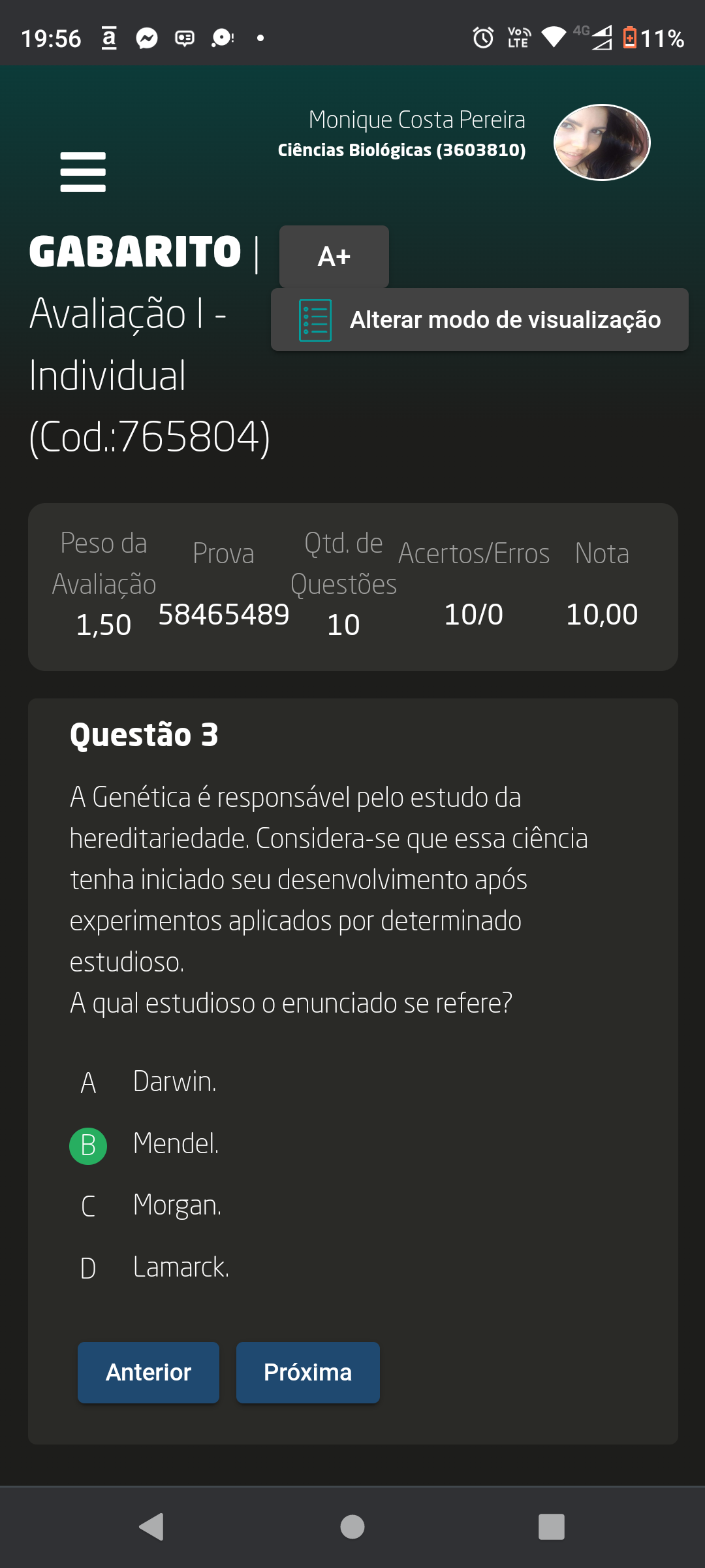 a 4G 19:56 LTE 11% Monique Costa Pereira Ciências Biológicas (3603810) GABARITO A+ Avaliação I - Alterar modo de visualização Individual (Cod.:765804) Peso da Prova Qtd. de Acertos/Erros Nota Avaliação Questões 1,50 58465489 10 10/0 10,00 Questão 3 A Genética é responsável pelo estudo da hereditariedade. Considera-se que essa ciência tenha iniciado seu desenvolvimento após experimentos aplicados por determinado estudioso. A qual estudioso enunciado se refere? A Darwin. B Mendel. Morgan. D Lamarck. Anterior Próxima