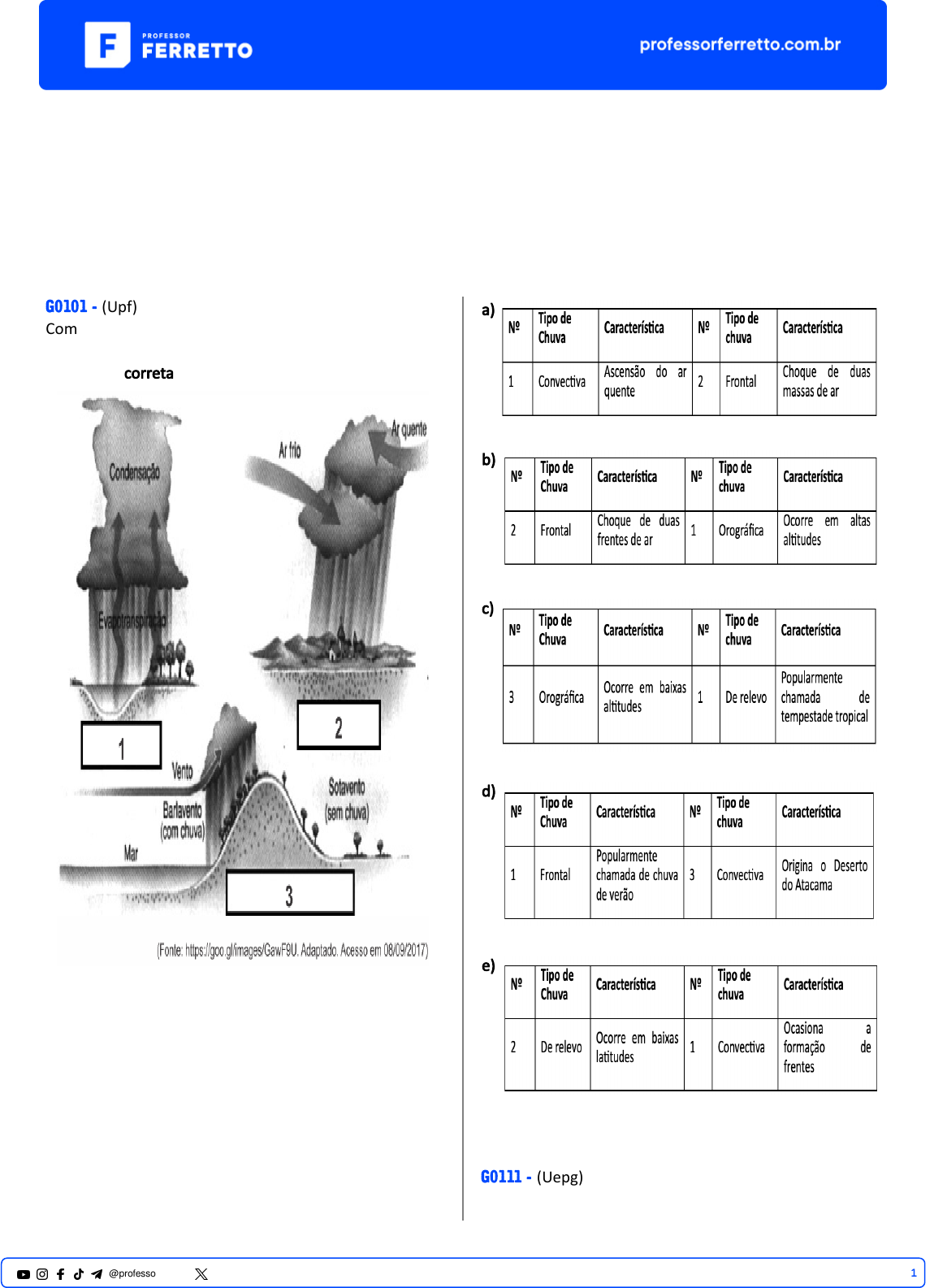 Vestibulares Atmosfera Elementos do Clima G0101 - (Upf) Com base no infográfico que segue e nos seus conhecimentos sobre os �pos de chuva, assinale a alterna�va correta. a) b) c) d) e) G0111 - (Uepg) 1@professorferretto @prof_ferretto (Adaptado) Com relação aos elementos �sicos do planeta, assinale o que for correto. I. O ar aquecido se eleva nas regiões de baixas pressões, condensam a umidade e provocam seca. Nas regiões de altas pressões, o ar desce em direção à super�cie, tem reduzida a sua umidade rela�va e provoca chuvas. II. Massas de ar frias se deslocam para regiões mais quentes enquanto massas de ar quentes se deslocam para regiões mais frias, o mesmo acontecendo com as correntes marí�mas quentes e frias nos oceanos. III. Os ventos, as massas de ar e as correntes marí�mas ajudam a manter o equilíbrio térmico do planeta, pois sem esses elementos as regiões equatoriais ficariam muito mais quentes e as regiões polares muito mais frias. IV. As águas frias, por serem menos densas do que as águas quentes, tendem a se deslocar pela super�cie dos oceanos com tendência global de resfriamento das águas oceânicas. V. Correntes marí�mas quentes não chegam às altas la�tudes devido às grandes diferenças de densidade entre as águas quentes e frias. Está(ão) correto(s) apenas: a) I b) II c) I e V d) II e III e) II e IV G0123 - (Uepb) Associe os fenômenos climá�cos citados na coluna 1 às suas respec�vas caracterís�cas descritas na coluna 2. A sequência correta da enumeração é a) 4 – 2 – 5 – 1 – 3 b) 3 – 2 – 1 – 5 – 4 c) 2 – 1 – 3 – 5 – 4 d) 5 – 2 – 4 – 1 – 3 e) 1 – 3 – 2 – 4 – 5 G0114 - (Upf) 2@professorferretto @prof_ferretto Associe as figuras I, II e III às caracterís�cas das chuvas (__) A evaporação e a ascensão de ar úmido e o resfriamento adiabá�co desse ar provocam esse �po de chuva comum no verão. (__) Resultam do encontro de duas massas de ar, com caracterís�cas diferentes, uma fria e a outra quente. (__) Quando nuvens encontram obstáculos como serras ou montanhas, ocasionando o seu resfriamento e provocando condensação e precipitação. A sequência correta de preenchimento dos parênteses, de cima para baixo, é: a) I, II, III. b) III, I, II. c) III, II, I. d) I, III, II. e) II, III, I. G0104 - (Fgv) Observe a imagem a seguir. Considerando a circulação geral da atmosfera, é correto afirmar que as massas de ar a) convergem para a área equatorial por apresentar baixa pressão. b) divergem da área equatorial por apresentar baixa pressão. c) convergem para as áreas subtropicais por apresentarem alta pressão. d) divergem das áreas subpolares por apresentarem alta pressão. e) convergem para as áreas polares por apresentarem baixa pressão. G0103 - (Uem) (Adaptado) Sobre a dinâmica dos fenômenos meteorológicos e suas consequências na Terra, assinale o que for correto. I. A circulação do ar com diferenças de temperatura entre os con�nentes e os oceanos e os períodos diurno e noturno pode ocasionar a formação de brisas. II.As chuvas frontais ocorrem do choque entre uma massa de ar frio e uma massa de ar quente. III.A chuva orográfica ou de relevo é causada pelo aumento da temperatura das nuvens, pois elas se chocam com as montanhas. 3@professorferretto @prof_ferretto IV.O nevoeiro se forma da diluição da neve com as gotas do vapor de água por meio da ascensão ver�cal do ar. V. A geada ocorre quando o resfriamento do ar é intenso e rápido, ou seja, quando o vapor de água passa direto para o estado sólido. Está(ão) correto(s) apenas: a) I b) I e II c) I, II e V d) II, III e IV e) II, III e V G0116 - (Uepg) (Adaptada) Sobre os �pos de nuvens e de chuvas, suas caracterís�cas e ocorrências, assinale o que for correto. I. As nuvens cumulo, que possuem crescimento ver�cal, podem evoluir para cumulonimbus, que podem gerar tempestades e granizo. II. Cirrus são nuvens altas, formadas por cristais de gelo e que, por si, não apresentam precipitações. III. Chuvas convec�vas cons�tuem-se basicamente de garoa, sem presença de tempestades, normalmente formadas com a entrada de massa de ar frio dos oceanos. IV. A chuva de relevo, também conhecida como orográfica, forma-se quando massas de ar úmidas sobem barreiras de relevo, baixando sua temperatura e condensando, formando nuvens e precipitação. V. As chuvas frontais, com massa de ar quente, ocorridas no Brasil são provenientes do oceano Atlân�co, já que as massas de ar carregadas de umidade da Amazônia precipitam apenas na própria região amazônica. Estão corretos apenas: a) I, II e IV b) I, II e V c) I, III e IV d) II e V e) II, III e IV G0109 - (Uepg) (Adaptado) Sobre pluviosidade e �pos de chuvas, assinale o que for correto. I. As chuvas de monções ocorrem em áreas tropicais do planeta, trazendo umidade dos oceanos para os con�nentes, muito visíveis no sul e sudeste asiá�cos. II.Quando o vapor da água se aquece por convecção formando nuvens, sobretudo cumulus nimbus podem surgir chuvas convec�vas, normalmente de forte intensidade. III.As chuvas relacionadas aos furacões na Terra são aquelas que se formam em porções con�nentais do hemisfério norte. Só exis�u uma tempestade registrada que formou furacão no hemisfério sul (Catarina – Brasil – 2004). IV.Chuvas frontais são aquelas em que há encontro de duas massas de ar dis�ntas, uma quente e uma fria, por exemplo. V. Em regiões onde o relevo se eleva e massas de ar úmidas sobem, podem formar-se chuvas orográficas ou neblina. Está(ão) correto(s) apenas: a) I, II e III. b) I, II, IV e V. c) II, III, IV e V. d) III e V. e) IV e V. G0119 - (Mackenzie) Em relação à dinâmica dos ventos, circulação e forças que atuam sobre eles, assinale a afirmação incorreta. a) Os ventos são, de forma geral, o ar em movimento devido a ajustes atmosféricos causados pela variação da pressã