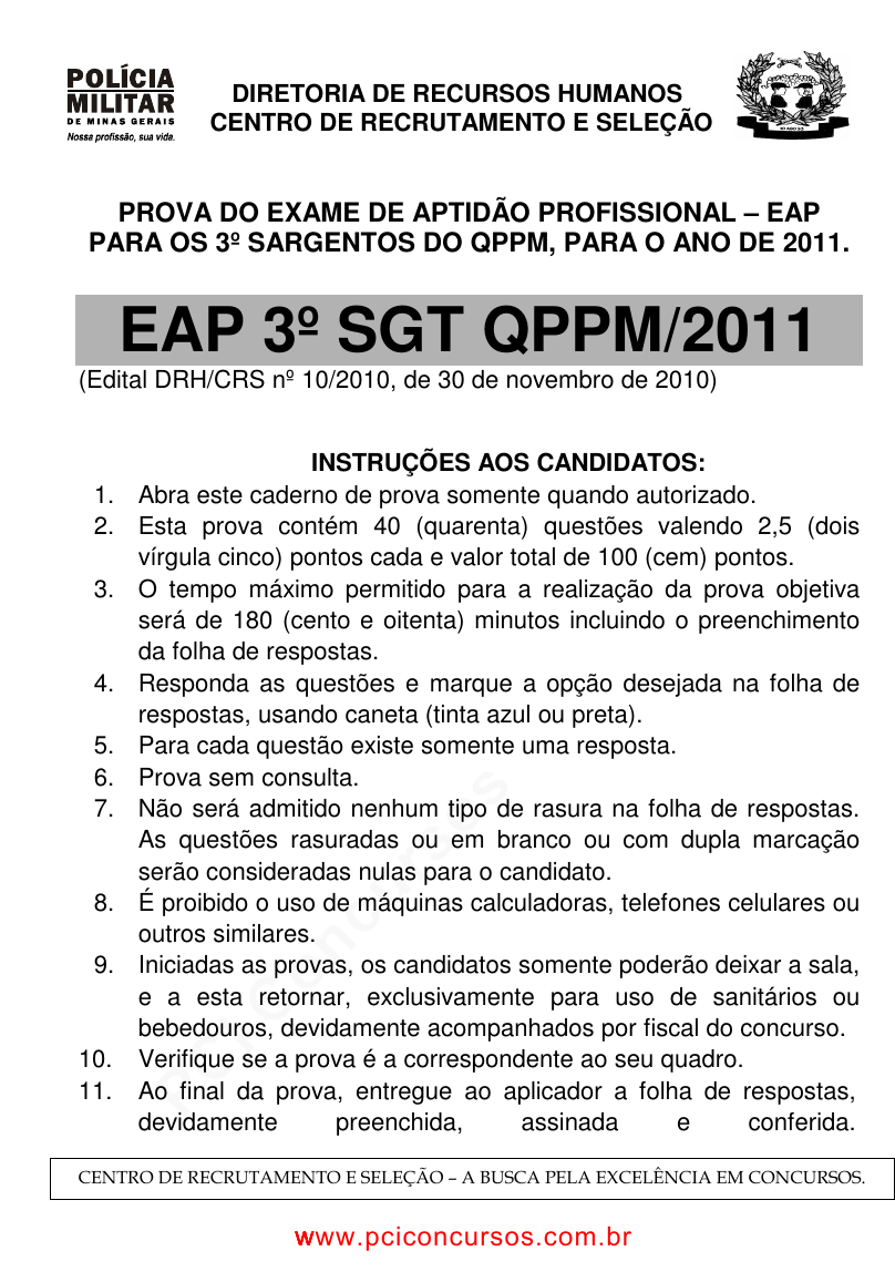 pcimarkpci MDAwMDowMDAwOjAwMDA6MDAwMDowMDAwOmZmZmY6MmQ4YzpjMGQ5:VGh1LCAyNCBPY3QgMjAyNCAyMDowODo0OCAtMDMwMA== www.pciconcursos.com.br CENTRO DE RECRUTAMENTO E SELEÇÃO – A BUSCA PELA EXCELÊNCIA EM CONCURSOS. PROVA DO EXAME DE APTIDÃO PROFISSIONAL – EAP PARA OS 3º SARGENTOS DO QPPM, PARA O ANO DE 2011. EAP 3º SGT QPPM/2011 (Edital DRH/CRS nº 10/2010, de 30 de novembro de 2010) INSTRUÇÕES AOS CANDIDATOS: 1. Abra este caderno de prova somente quando autorizado. 2. Esta prova contém 40 (quarenta) questões valendo 2,5 (dois vírgula cinco) pontos cada e valor total de 100 (cem) pontos. 3. O tempo máximo permitido para a realização da prova objetiva será de 180 (cento e oitenta) minutos incluindo o preenchimento da folha de respostas. 4. Responda as questões e marque a opção desejada na folha de respostas, usando caneta (tinta azul ou preta). 5. Para cada questão existe somente uma resposta. 6. Prova sem consulta. 7. Não será admitido nenhum tipo de rasura na folha de respostas. As questões rasuradas ou em branco ou com dupla marcação serão consideradas nulas para o candidato. 8. É proibido o uso de máquinas calculadoras, telefones celulares ou outros similares. 9. Iniciadas as provas, os candidatos somente poderão deixar a sala, e a esta retornar, exclusivamente para uso de sanitários ou bebedouros, devidamente acompanhados por fiscal do concurso. 10. Verifique se a prova é a correspondente ao seu quadro. 11. Ao final da prova, entregue ao aplicador a folha de respostas, devidamente preenchida, assinada e conferida. DIRETORIA DE RECURSOS HUMANOS CENTRO DE RECRUTAMENTO E SELEÇÃO www.pciconcursos.com.br www.pciconcursos.com.br www.pciconcursos.com.br www.pciconcursos.com.br pcimarkpci MDAwMDowMDAwOjAwMDA6MDAwMDowMDAwOmZmZmY6MmQ4YzpjMGQ5:VGh1LCAyNCBPY3QgMjAyNCAyMDowODo0OCAtMDMwMA== www.pciconcursos.com.br PROVA DO EXAME DE APTIDÃO PROFISSIONAL – EAP 3º SGT QPPM/2011 CENTRO DE RECRUTAMENTO E SELEÇÃO – A BUSCA PELA EXCELÊNCIA EM CONCURSOS. 2 1ª QUESTÃO – Sobre o Relatório de Investigação Preliminar (RIP), é CORRETO afirmar: A. ( ) A instauração ocorrerá por intermédio de “Despacho” da autoridade militar, até o nível mínimo de Comandante de Companhia Independente PM. B. ( ) Não poderá ser instaurado quando o fato noticiado constituir, em tese, crime militar. C. ( ) Não há necessidade de termo de abertura e de juntada, bastando a confecção do termo de autuação do Despacho de instauração e a especificação das provas no Relatório. D. ( ) Poderá ser designado como encarregado um Cabo PM. 2ª QUESTÃO – Considerando os parâmetros finalísticos da integração entre atividade-meio e atividade-fim da PMMG, enumere a 2ª coluna de acordo com a 1ª, lembrando que na 1ª coluna estão as áreas de resultados e na 2ª estão as repercussões desejáveis na atividade-fim. Depois, marque a alternativa que representa a sequência CORRETA: 1 Operacional ( ) Serviços planejados e executados de acordo com as peculiaridades da segurança dos policiais e da boa aceitação da população. 2 Tecnologia da informação e da comunicação ( ) Imagem positiva da PMMG, em todos os atendimentos de ocorrências. 3 Comunicação Organizacional ( ) Policiamento realizado com recursos materiais suficientes, distribuídos com transparência e equidade às UEOp. 4 Logística ( ) Eficácia operacional proporcionada por comunicações suficientemente ágeis, seguras e conformes ao delito enfrentado. A. ( ) 1, 3, 4, 2. B. ( ) 4, 1, 3, 2. www.pciconcursos.com.br www.pciconcursos.com.br www.pciconcursos.com.br www.pciconcursos.com.br pcimarkpci MDAwMDowMDAwOjAwMDA6MDAwMDowMDAwOmZmZmY6MmQ4YzpjMGQ5:VGh1LCAyNCBPY3QgMjAyNCAyMDowODo0OCAtMDMwMA== www.pciconcursos.com.br PROVA DO EXAME DE APTIDÃO PROFISSIONAL – EAP 3º SGT QPPM/2011 CENTRO DE RECRUTAMENTO E SELEÇÃO – A BUSCA PELA EXCELÊNCIA EM CONCURSOS. 3 C. ( ) 1, 4, 2, 3. D. ( ) 3, 2, 1, 4. 3ª QUESTÃO – Sobre o instituto da Disponibilidade Cautelar, marque a alternativa INCORRETA: A. ( ) Não se assemelha com o instituto prisão administrativa, abolida com o advento do Código de Ética e Disciplina dos Militares do Estado de Minas Gerais (CEDM), já que não implica no cerceamento do direito de ir e vir do militar. B. ( ) É um ato de competência indelegável do Comandante-Geral, decretada pelo prazo de 15 (quinze) dias, prorrogável por igual período, podendo haver renovação do prazo legal. C. ( ) Terá como pressuposto para sua decretação a instauração de procedimento apuratório. D. ( ) Poderá ser solicitada pelo Corregedor, pelo Comandante da Unidade, pelo Conselho de Ética e Disciplina Militares da Unidade, pelo Presidente da Comissão de Processo Administrativo-Disciplinar (CPAD) e pelo Encarregado de Inquérito Policial Militar (IPM). 4ª QUESTÃO – De acordo com o Código de Ética e Disciplina dos Militares do Estado de Minas Gerais (CEDM), marque a alternativa CORRETA: A. ( ) O CEDM somente se aplicará aos militares reformados, se a transgressão disciplinar por eles cometidas der ensejo à sua submissão a Processo Administrativo-Disciplinar (PAD) ou Processo Administrativo-Disciplinar Sumário (PADS). B. ( ) A falta de experiência no serviço é uma causa atenuante em relação à transgressão cometida, já o comprovado desconhecimento da norma violada constitui causa de justificação. C. ( ) É dever do militar apresentar Comunicação Disciplinar em face de ato ou fato contrário à disciplina, no prazo de cinco dias úteis contados da observação ou do seu conhecimento, já a apresentação de Queixa Disciplinar requer que o militar seja diretamente atingido pelo ato pessoal que repute irregular ou injusto. www.pciconcursos.com.br www.pciconcursos.com.br www.pciconcursos.com.br www.pciconcursos.com.br pcimarkpci MDAwMDowMDAwOjAwMDA6MDAwMDowMDAwOmZmZmY6MmQ4YzpjMGQ5:VGh1LCAyNCBPY3QgMjAyNCAyMDowODo0OCAtMDMwMA== www.pciconcursos.com.br PROVA DO EXAME DE APTIDÃO PROFIS