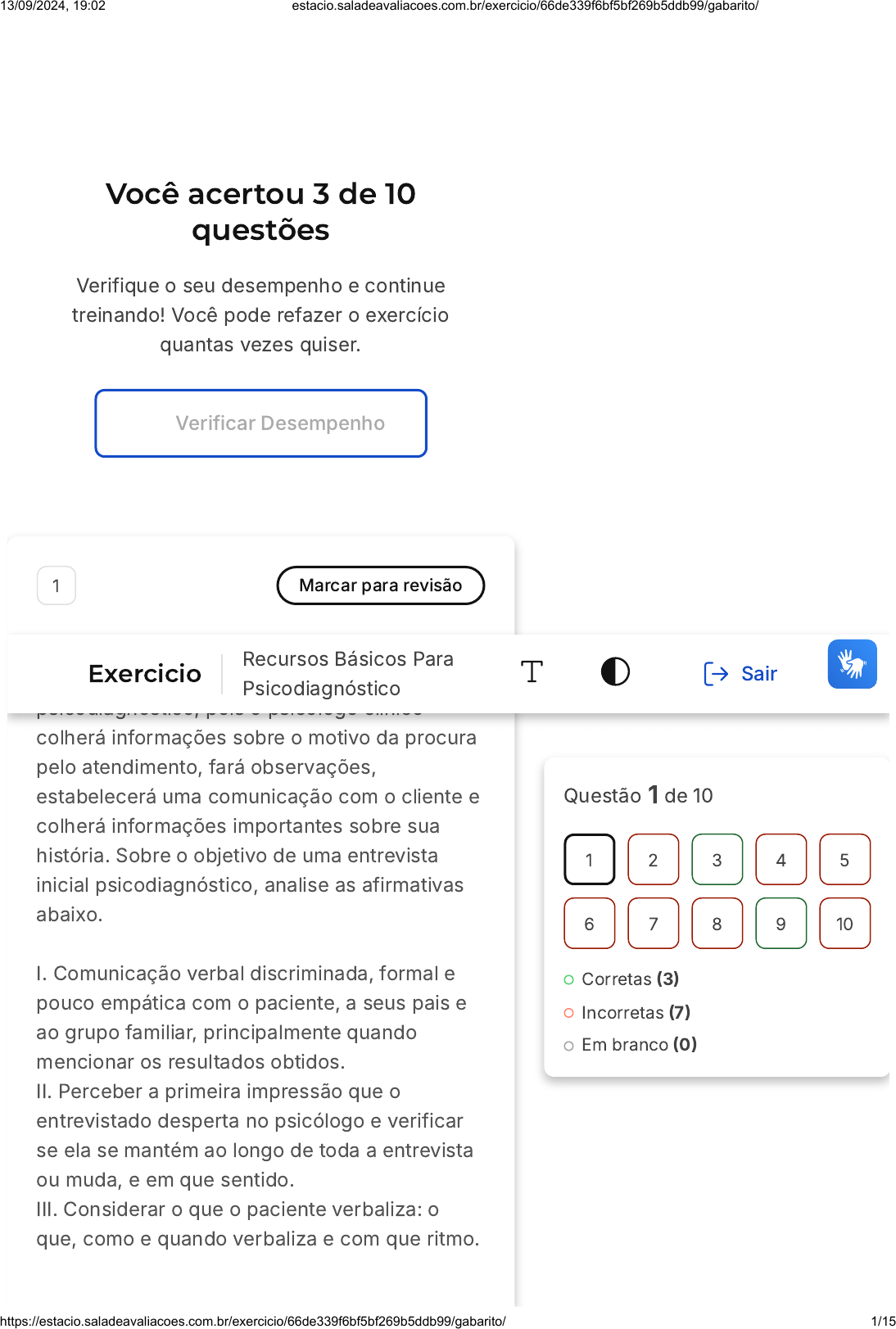 Você acertou 3 de 10 questões Verifique o seu desempenho e continue treinando! Você pode refazer o exercício quantas vezes quiser. Verificar Desempenho 1 Marcar para revisão �FCC/2012 � Adaptada) A entrevista inicial é um instrumento fundamental no processo de psicodiagnóstico, pois o psicólogo clínico colherá informações sobre o motivo da procura pelo atendimento, fará observações, estabelecerá uma comunicação com o cliente e colherá informações importantes sobre sua história. Sobre o objetivo de uma entrevista inicial psicodiagnóstico, analise as afirmativas abaixo. I. Comunicação verbal discriminada, formal e pouco empática com o paciente, a seus pais e ao grupo familiar, principalmente quando mencionar os resultados obtidos. II. Perceber a primeira impressão que o entrevistado desperta no psicólogo e verificar se ela se mantém ao longo de toda a entrevista ou muda, e em que sentido. III. Considerar o que o paciente verbaliza: o que, como e quando verbaliza e com que ritmo. Questão 1 de 10 Corretas �3� Incorretas �7� Em branco �0� 1 2 3 4 5 6 7 8 9 10 Exercicio Recursos Básicos Para Psicodiagnóstico Sair 13/09/2024, 19:02 estacio.saladeavaliacoes.com.br/exercicio/66de339f6bf5bf269b5ddb99/gabarito/ https://estacio.saladeavaliacoes.com.br/exercicio/66de339f6bf5bf269b5ddb99/gabarito/ 1/15 A B C D E IV. Estabelecer um bom rapport com o paciente para reduzir ao mínimo a possibilidade de bloqueios ou paralizações e criar um clima preparatório favorável à aplicação de testes. Marque a alternativa que apresenta as afirmativas corretas. II, III e IV I, II e III II e IV III e IV I e III Resposta correta Parabéns, você selecionou a alternativa correta. Confira o gabarito comentado! Gabarito Comentado A primeira etapa de um psicodiagnóstico é a entrevista inicial onde é fundamental o estabelecimento de um bom contato, observação de comportamentos verbais e não verbais, saber escutar o paciente, tanto o conteúdo do discurso quanto sua organização e cadência, além de outros indicadores e sensações causadas durante a entrevista. Somente ao final de todo o 13/09/2024, 19:02 estacio.saladeavaliacoes.com.br/exercicio/66de339f6bf5bf269b5ddb99/gabarito/ https://estacio.saladeavaliacoes.com.br/exercicio/66de339f6bf5bf269b5ddb99/gabarito/ 2/15 processo psicodiagnóstico será realizada a devolução dos resultados. 2 Marcar para revisão �CESPE / CEBRASPE /2021� Artur, com 7 anos de idade, tem desenvolvido crises de raiva e irritabilidade. Durante a avaliação psicológica, sua mãe relatou que ele tem histórico de problemas escolares, com queixas de heteroagressividade entre os colegas, professores e assistentes da escola e, ainda, que não atende a comandos, possui baixa tolerância a frustrações e reação extrema quando da imposição de regras e limites. A mãe contou que ela e o pai de Artur são separados desde quando a criança tinha dois anos de idade; eles tinham muitos conflitos e divergiam sobre a criação do filho. Atualmente, ela tem a guarda unilateral de Artur. Por fim, informou que, havia 15 dias, Artur iniciou medicação prescrita pelo psiquiatra, que o encaminhou para o psicodiagnóstico. No que se refere ao caso clínico e à avaliação psicodiagnóstica, avalie as afirmativas a seguir: I. A hora de jogo diagnóstica constitui um instrumento técnico que poderá ser utilizado para melhor compreender a realidade de Artur. II. Por não constituir uma demanda psicoterápica, a entrevista com professores ou equipe escolar de Artur não é recomendada. III. A entrevista lúdica pode ser utilizada no caso de Artur, sendo um processo estruturado e sistematizado de avaliação psicodiagnóstica infantil. IV O rapport é uma condição fundamental no processo de avaliação psicológica de Artur. 13/09/2024, 19:02 estacio.saladeavaliacoes.com.br/exercicio/66de339f6bf5bf269b5ddb99/gabarito/ https://estacio.saladeavaliacoes.com.br/exercicio/66de339f6bf5bf269b5ddb99/gabarito/ 3/15 A B C D E Marque a alternativa que apresenta as afirmativas corretas. I e III I e IV II e III I, II e IV II, III e IV Resposta incorreta Opa! A alternativa correta é a letra B. Confira o gabarito comentado! Gabarito Comentado Arthur tem 7 anos e portanto a entrevista de escolha seria a hora de jogo. A hora de jogo apresenta características de uma entrevista aberta pois, apesar de critérios diagnósticos a serem observados, o brincar deve transcorrer livremente. Em muitas avaliações é indicado um contato com a escola, principalmente quando a queixa comporta sinais claros de dificuldades na escola. O contato empático com a criança é fundamental para que ela se sinta à vontade no espaço terapêutico, principalmente no caso referido 13/09/2024, 19:02 estacio.saladeavaliacoes.com.br/exercicio/66de339f6bf5bf269b5ddb99/gabarito/ https://estacio.saladeavaliacoes.com.br/exercicio/66de339f6bf5bf269b5ddb99/gabarito/ 4/15 A B C D E 3 Marcar para revisão Em um atendimento psicopedagógico, o profissional deve investigar com o paciente a pessoa que o encaminhou, sob quais circunstancias e quais as questões demandadas para serem investigadas. Esses dados coletados podem ser completados por uma ligação telefônica. Marque a afirmativa correta que define o nome dessa etapa diagnóstica Entrevista de encaminhamento social Entrevista Inicial Entrevista de Contato prévio Entrevista Subsequente Entrevista Devolutiva Resposta correta Parabéns, você selecionou a alternativa correta. Confira o gabarito comentado! Gabarito Comentado O processo psicodiagnóstico tem seu primeiro momento desde o contato inicial do paciente e é seguido por uma entrevista inicial onde podemos tomar conhecimento daquilo que o trouxe até o atendimento. Todo encaminhamento é motivado pela 13/09/2024, 19:02 estacio.saladeavaliacoes.com.br/exercicio/66de339f6bf5bf269b5ddb99/gabarito/ https://estacio.saladeavaliacoes.com.br/exercicio/66de339f6bf5bf269b5ddb99/gabarito/ 5/1
