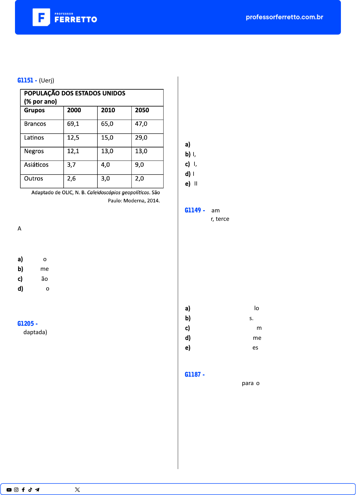América G1151 - (Uerj) A par�r da análise da tabela, uma importante mudança em processo na demografia estadunidense e a respec�va causa associada ao grupo populacional a�ngido são: a) redução de brancos − alta taxa de mortalidade b) crescimento de negros − diminuição da emigração c) elevação de la�nos − maiores índices de imigração d) aumento de asiá�cos − grande con�ngente de refugiados G1205 - (Uepg) (Adaptada) Sobre problemas econômicos e sociais na América la�na, leia as proposições a seguir: I) O narcotráfico é um grave fator desestabilizador da estrutura econômica e social dos países la�no- americanos, afetando a qualidade de vida das pessoas, aumentando a violência e a insegurança. II) As dívidas externas e internas das economias la�no- americanas têm um baixo custo e, o que seria gasto no pagamento das mesmas, tem sido u�lizado para melhorar o bem-estar das populações. III) Apesar da redução da pobreza absoluta, Brasil, México e Equador não conseguiram avanços na distribuição de renda entre toda a população. IV) O desemprego é um item que não preocupa os governos dos países la�no-americanos, pois os índices são os mais baixos do mundo. V) A região concentra quase toda a produção mundial de coca, a base para obtenção da cocaína, e as áreas de maior produção estão na Colômbia, Peru e Bolívia. Estão CORRETAS apenas as proposições: a) I, II e III. b) I, III e V. c) II, III e IV. d) II, IV e V. e) III, IV e V. G1149 - (Famerp) A Embraer, terceira maior fabricante de aviões comerciais do mundo, anunciou que vai estabelecer equipes no Vale do Silício, nos Estados Unidos. A Embraer não é a primeira fabricante de aviões a se estabelecer nessa região. Em 2015, a Airbus contratou um ex-execu�vo do Google para dirigir seus negócios no Vale do Silício. (h�ps://economia.uol.com.br, 14.03.2017. Adaptado.) O Vale do Silício, importante cenário produ�vo mundial, destaca- se por concentrar a) empresas de alta tecnologia. b) indústrias siderúrgicas. c) empresas de tecnologia militar. d) indústrias de monitoramento por radar. e) agências de pesquisas espaciais. G1187 - (Espm) Com o foco voltado para o petróleo e usando parte do dinheiro arrecadado com as exportações do combus�vel para sus tentar programas sociais, não se preocupou com o desenvolvimento agrícola e industrial do país. Fonte: h�ps://www.bbc.com/portuguese/internacio nal- 45909515. Acesso: 22/11/2019. O texto retrata a grave crise econômica pela qual está passando a(o): 1@professorferretto @prof_ferretto a) Argen�na. b) Venezuela. c) Chile. d) Brasil. e) Uruguai. G1180 - (Uepg) (Adaptada) Sobre problemas econômicos e sociais na América la�na, leia as proposições a seguir: I) O narcotráfico é um grave fator desestabilizador da estrutura econômica e social dos países la�no- americanos, afetando a qualidade de vida das pessoas, aumentando a violência e a insegurança. II) As dívidas externas e internas das economias la�no- americanas têm um baixo custo e, o que seria gasto no pagamento das mesmas, tem sido u�lizado para melhorar o bem-estar das populações. III) Apesar da redução da pobreza absoluta, Brasil, México e Equador não conseguiram avanços na distribuição de renda entre toda a população. IV) O desemprego é um item que não preocupa os governos dos países la�no-americanos, pois os índices são os mais baixos do mundo. V) A região concentra quase toda a produção mundial de coca, a base para obtenção da cocaína, e as áreas de maior produção estão na Colômbia, Peru e Bolívia. Estão CORRETAS apenas as proposições: a) I, II e III. b) II, IV e V. c) I, III e V. d) III, IV e V. e) I, II e IV. G1202 - (Famema) O diagnós�co é do economista Víctor Álvarez, ex-ministro de Indústrias Básicas do governo Hugo Chávez: “A crise econômica, social e polí�ca que está sofrendo o país neste momento é uma nova expressão de esgotamento de um modelo que se impôs na Venezuela há mais de um século”. www.cartacapital.com.br. Adaptado. Considerando o cenário econômico e geopolí�co da Venezuela, é correto afirmar que o modelo citado no excerto se baseia a) no extra�vismo mineral, com a intensa exploração de petróleo. b) na industrialização nacional, com a total subs�tuição das importações. c) no extra�vismo vegetal, com a valorização das especificidades gené�cas da região. d) na inovação industrial, com o financiamento de polos de pesquisa avançada. e) na agricultura de exportação, com o compromisso de abastecer os países la�nos. G1176 - (Ufpr) “No período de 2009 a 2014, a economia de Cuba apresentou baixo crescimento do PIB e do PIB per capita, além de déficit fiscal em quase todos os anos. São evidências de uma profunda crise estrutural ocasionada por deficiências internas e influências externas que limitam fortemente o desempenho da economia, o desenvolvimento e a melhora da qualidade de vida da população” (Rodríguez, 2016). Sobre Cuba, levando em consideração os dados apresentados e os conhecimentos de geografia, é correto afirmar: a) A crise mundial iniciada em 2008 estancou o processo de desenvolvimento acelerado que a economia cubana vinha alcançando desde 1992, quando o fim da URSS livrou Cuba da interferência sovié�ca. b) O baixo ritmo de crescimento do PIB é compensado pelas polí�cas de distribuição de renda adotadas no país, que contribuem para elevar a renda média da população. c) A par�cipação popular na elaboração e execução de polí�cas públicas é um dos fatores estruturais responsáveis pelo déficit fiscal persistente, na medida em que pressiona os gastos sociais para cima. d) A crise internacional de 2008, o bloqueio econômico dos EUA e as deficiências do modelo de economia planificada são fatores externos e internos que contribuem para o baixo dinamismo econômico. e)