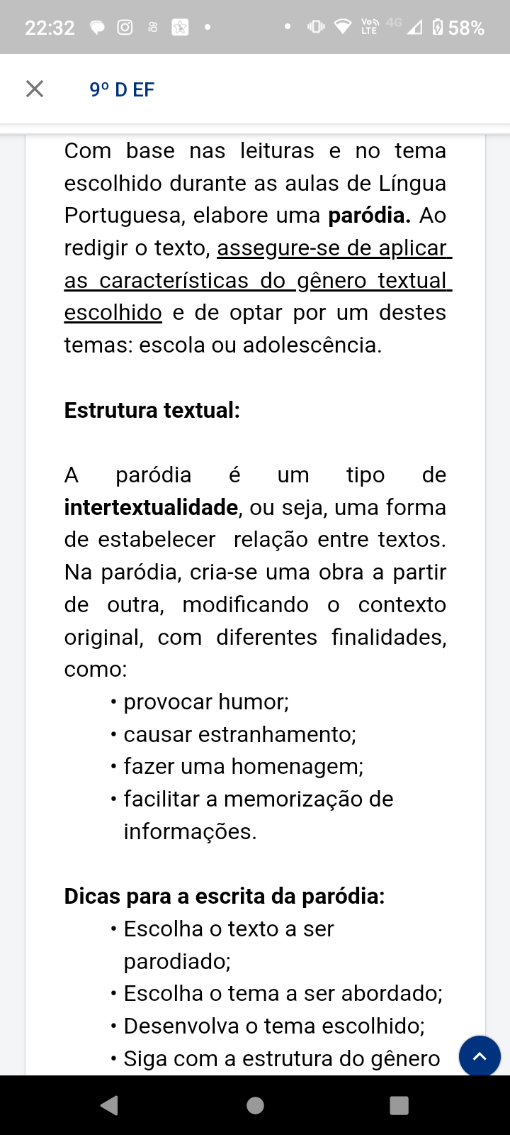 4G 22:32 LTE n 58% X Com base nas leituras e no tema escolhido durante as aulas de Língua Portuguesa, elabore uma paródia. Ao redigir o texto, assegure-se de aplicar as características do gênero textual escolhido e de optar por um destes temas: escola ou adolescência. Estrutura textual: A paródia é um tipo de intertextualidade, ou seja, uma forma de estabelecer relação entre textos. Na paródia, cria-se uma obra a partir de outra, modificando o contexto original, com diferentes finalidades, como: provocar humor; causar estranhamento; fazer uma homenagem; facilitar a memorização de informações. Dicas para a escrita da paródia: Escolha o texto a ser parodiado; Escolha o tema a ser abordado; Desenvolva o tema escolhido; Siga com a estrutura do gênero ^