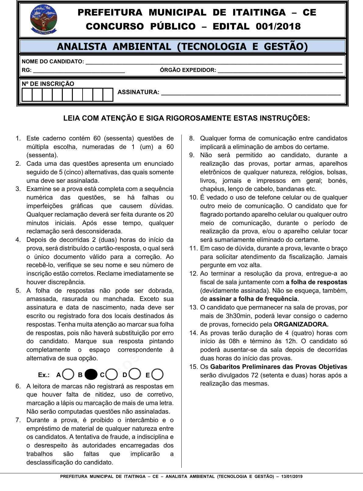 pcimarkpci MDAwMDowMDAwOjAwMDA6MDAwMDowMDAwOmZmZmY6YjEzMzo0YWVk:VGh1LCAyNCBPY3QgMjAyNCAyMzowODo0NCAtMDMwMA== www.pciconcursos.com.br PREFEITURA MUNICIPAL DE ITAITINGA – CE – ANALISTA AMBIENTAL (TECNOLOGIA E GESTÃO) – 13/01/2019 PREFEITURA MUNICIPAL DE ITAITINGA – CE CONCURSO PÚBLICO – EDITAL 001/2018 ANALISTA AMBIENTAL (TECNOLOGIA E GESTÃO) NOME DO CANDIDATO: ____________________________________________________________________________________ RG: ______________________________ ÓRGÃO EXPEDIDOR: _________________________________________ Nº DE INSCRIÇÃO ASSINATURA: _____________________________________________________ LEIA COM ATENÇÃO E SIGA RIGOROSAMENTE ESTAS INSTRUÇÕES: 1. Este caderno contém 60 (sessenta) questões de múltipla escolha, numeradas de 1 (um) a 60 (sessenta). 2. Cada uma das questões apresenta um enunciado seguido de 5 (cinco) alternativas, das quais somente uma deve ser assinalada. 3. Examine se a prova está completa com a sequência numérica das questões, se há falhas ou imperfeições gráficas que causem dúvidas. Qualquer reclamação deverá ser feita durante os 20 minutos iniciais. Após esse tempo, qualquer reclamação será desconsiderada. 4. Depois de decorridas 2 (duas) horas do início da prova, será distribuído o cartão-resposta, o qual será o único documento válido para a correção. Ao recebê-lo, verifique se seu nome e seu número de inscrição estão corretos. Reclame imediatamente se houver discrepância. 5. A folha de respostas não pode ser dobrada, amassada, rasurada ou manchada. Exceto sua assinatura e data de nascimento, nada deve ser escrito ou registrado fora dos locais destinados às respostas. Tenha muita atenção ao marcar sua folha de respostas, pois não haverá substituição por erro do candidato. Marque sua resposta pintando completamente o espaço correspondente à alternativa de sua opção. Ex.: A B C D E 6. A leitora de marcas não registrará as respostas em que houver falta de nitidez, uso de corretivo, marcação a lápis ou marcação de mais de uma letra. Não serão computadas questões não assinaladas. 7. Durante a prova, é proibido o intercâmbio e o empréstimo de material de qualquer natureza entre os candidatos. A tentativa de fraude, a indisciplina e o desrespeito às autoridades encarregadas dos trabalhos são faltas que implicarão a desclassificação do candidato. 8. Qualquer forma de comunicação entre candidatos implicará a eliminação de ambos do certame. 9. Não será permitido ao candidato, durante a realização das provas, portar armas, aparelhos eletrônicos de qualquer natureza, relógios, bolsas, livros, jornais e impressos em geral; bonés, chapéus, lenço de cabelo, bandanas etc. 10. É vedado o uso de telefone celular ou de qualquer outro meio de comunicação. O candidato que for flagrado portando aparelho celular ou qualquer outro meio de comunicação, durante o período de realização da prova, e/ou o aparelho celular tocar será sumariamente eliminado do certame. 11. Em caso de dúvida, durante a prova, levante o braço para solicitar atendimento da fiscalização. Jamais pergunte em voz alta. 12. Ao terminar a resolução da prova, entregue-a ao fiscal de sala juntamente com a folha de respostas (devidamente assinada). Não se esqueça, também, de assinar a folha de frequência. 13. O candidato que permanecer na sala de provas, por mais de 3h30min, poderá levar consigo o caderno de provas, fornecido pela ORGANIZADORA. 14. As provas terão duração de 4 (quatro) horas com início às 08h e término às 12h. O candidato só poderá ausentar-se da sala depois de decorridas duas horas do início das provas. 15. Os Gabaritos Preliminares das Provas Objetivas serão divulgados 72 (setenta e duas) horas após a realização das mesmas. pcimarkpci MDAwMDowMDAwOjAwMDA6MDAwMDowMDAwOmZmZmY6YjEzMzo0YWVk:VGh1LCAyNCBPY3QgMjAyNCAyMzowODo0NCAtMDMwMA== www.pciconcursos.com.br 2 PREFEITURA MUNICIPAL DE ITAITINGA – CE – ANALISTA AMBIENTAL (TECNOLOGIA E GESTÃO) – 13/01/2019 pcimarkpci MDAwMDowMDAwOjAwMDA6MDAwMDowMDAwOmZmZmY6YjEzMzo0YWVk:VGh1LCAyNCBPY3QgMjAyNCAyMzowODo0NCAtMDMwMA== www.pciconcursos.com.br 3 PREFEITURA MUNICIPAL DE ITAITINGA – CE – ANALISTA AMBIENTAL (TECNOLOGIA E GESTÃO) – 13/01/2019 CONHECIMENTOS GERAIS Leia o Texto a seguir para responder as questões de 1 a 3 A Minha Vida I Este mundo é-me um deserto Por onde um vulcão passou E gravada a minha história Em traços negros deixou. São-lhe tetos bronzeados Escuros, medonhos céus, Onde bramem tempestades Em contínuos escarcéus. Só, por ele vai minh’alma, Nos destroços tropeçando, Com passo tardio e incerto Tristemente caminhando. Marcha... marcha ... enfim, cansada De tão longo caminhar. Nalguma pedra que encontra, Descansa, e põe-se a chorar. Olha o céu... nem uma estrela! Olha a terra... é negro chão! Clama em brados por socorro, Só responde o furacão. Nos olhos seca-lhe o pranto... Continua a caminhar, E noutra pedra distante Descansa e põe-se a chorar. Laurindo Rebelo Com base no texto e em seus conhecimentos, responda às questões a seguir. 1. Pelo texto, pode-se concluir que a) o poeta vive uma grande alegria. b) cada um pode vencer suas dificuldades. c) o sofrimento depende de cada um. d) a vida do poeta é cheia de angústia e ansiedade. e) a alegria de viver supera os problemas da vida. 2. Os medonhos céus são os(as) a) nuvens que prenunciam as chuvas. b) trovões e raios violentos. c) tempestades violentas. d) invernos rigorosos. e) problemas existenciais. 3. O poeta fala de sua vida com a) vingança. b) acomodação c) desânimo. d) alegria. e) indiferença. 4. São escritos com X inicial todos os vocábulos da alternativa. a) xodó / xereta / xepa / xingar. b) xulear / xulipa / xamego / xilindró. c) xarque / xará / xote / xamuscar. d) xafariz / xulé / xuteira / xilrear. e) xaleira / xalé / xiqueiro / xocalho. 5. “Vulcão” tem um plural duplo: vulcões e v