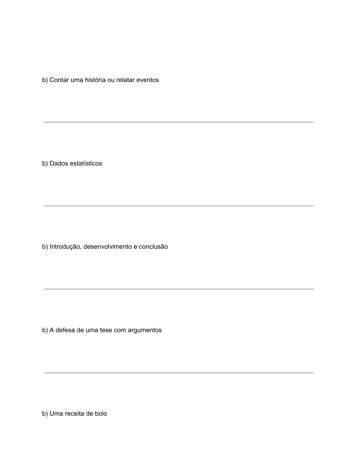 1. (FURB/2024) Qual é o principal objetivo de um texto narrativo? a) Descrever características de algo b) Contar uma história ou relatar eventos c) Defender um ponto de vista d) Instruir como realizar uma tarefa e) Expor um conceito 2. (FURB/2024) Em um texto descritivo, qual elemento é mais utilizado? a) Verbos de ação b) Dados estatísticos c) Adjetivos e detalhes sensoriais d) Argumentos lógicos e) Conversas entre personagens 3. (FURB/2024) Qual a estrutura típica de um texto dissertativo? a) Ação, conflito e resolução b) Introdução, desenvolvimento e conclusão c) Ordem, instrução e resultado d) Diálogo e resposta e) Narrativa e descrição 4. (FURB/2024) Em um texto argumentativo, qual é o elemento central? a) A descrição de uma cena b) A defesa de uma tese com argumentos c) A exposição de informações d) A instrução sobre um procedimento e) A representação de uma conversa 5. (FURB/2024) Qual dos seguintes textos é um exemplo de texto injuntivo? a) Uma crônica sobre um dia chuvoso b) Uma receita de bolo Albertina_Osvaldo Realce Albertina_Osvaldo Realce Albertina_Osvaldo Realce Albertina_Osvaldo Realce Albertina_Osvaldo Realce Albertina_Osvaldo Lápis c) Um ensaio acadêmico d) Um conto de fadas e) Um roteiro de filme 6. (FURB/2024) Em um texto dialogal, como as falas são apresentadas? a) Apenas em forma de narrativa b) Em forma de descrições detalhadas c) Estruturadas por diálogos diretos ou indiretos d) Em parágrafos longos sem diálogos e) Sem necessidade de interação entre personagens 7. (FURB/2024) O que distingue tipos textuais de gêneros textuais? a) Tipos textuais são sempre mais longos b) Tipos textuais são categorias básicas, enquanto gêneros são formas concretas no contexto social c) Gêneros textuais não têm estrutura definida d) Tipos textuais são apenas narrativos e) Gêneros textuais são sempre científicos 8. (FURB/2024) Qual frase é um exemplo de texto narrativo? a) "Misture os ingredientes e leve ao forno." b) "O céu estava nublado e Maria decidiu sair." c) "A globalização é um processo complexo." d) "É importante economizar água." e) "João disse que ia ao cinema." 9. (FURB/2024) Em um texto argumentativo, qual é a função dos dados e exemplos? a) Adicionar descrições visuais b) Oferecer clareza à narrativa c) Convencer o leitor da tese apresentada d) Propor instruções detalhadas e) Relatar eventos de forma cronológica Albertina_Osvaldo Realce Albertina_Osvaldo Realce Albertina_Osvaldo Realce Albertina_Osvaldo Realce Albertina_Osvaldo Realce Albertina_Osvaldo Lápis 10. (FURB/2024) No contexto dos tipos textuais, o que significa que um texto é "estático"? a) Que apresenta uma sequência de ações b) Que não exige mudança ou ação c) Que é voltado para o futuro d) Que contém muitos diálogos e) Que descreve eventos históricos Albertina_Osvaldo Realce Albertina_Osvaldo Lápis Gabarito: 1. b) Contar uma história ou relatar eventos 2. c) Adjetivos e detalhes sensoriais 3. b) Introdução, desenvolvimento e conclusão 4. b) A defesa de uma tese com argumentos 5. b) Uma receita de bolo 6. c) Estruturadas por diálogos diretos ou indiretos 7. b) Tipos textuais são categorias básicas, enquanto gêneros são formas concretas no contexto social 8. b) "O céu estava nublado e Maria decidiu sair." 9. c) Convencer o leitor da tese apresentada 10. b) Que não exige mudança ou ação