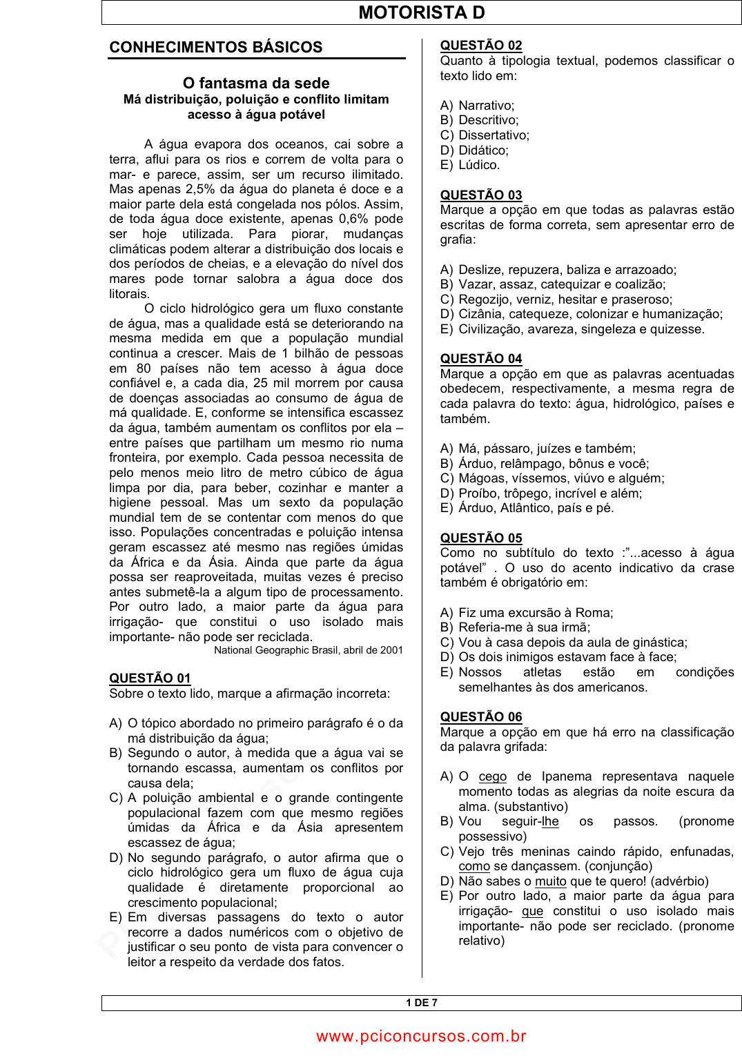 pcimarkpci MDAwMDowMDAwOjAwMDA6MDAwMDowMDAwOmZmZmY6YjEzMzo0OWE0:VGh1LCAyNCBPY3QgMjAyNCAyMzowMzozNiAtMDMwMA== www.pciconcursos.com.br MOTORISTA D 1 DE 7 CONHECIMENTOS BÁSICOS O fantasma da sede Má distribuição, poluição e conflito limitam acesso à água potável A água evapora dos oceanos, cai sobre a terra, aflui para os rios e correm de volta para o mar- e parece, assim, ser um recurso ilimitado. Mas apenas 2,5% da água do planeta é doce e a maior parte dela está congelada nos pólos. Assim, de toda água doce existente, apenas 0,6% pode ser hoje utilizada. Para piorar, mudanças climáticas podem alterar a distribuição dos locais e dos períodos de cheias, e a elevação do nível dos mares pode tornar salobra a água doce dos litorais. O ciclo hidrológico gera um fluxo constante de água, mas a qualidade está se deteriorando na mesma medida em que a população mundial continua a crescer. Mais de 1 bilhão de pessoas em 80 países não tem acesso à água doce confiável e, a cada dia, 25 mil morrem por causa de doenças associadas ao consumo de água de má qualidade. E, conforme se intensifica escassez da água, também aumentam os conflitos por ela – entre países que partilham um mesmo rio numa fronteira, por exemplo. Cada pessoa necessita de pelo menos meio litro de metro cúbico de água limpa por dia, para beber, cozinhar e manter a higiene pessoal. Mas um sexto da população mundial tem de se contentar com menos do que isso. Populações concentradas e poluição intensa geram escassez até mesmo nas regiões úmidas da África e da Ásia. Ainda que parte da água possa ser reaproveitada, muitas vezes é preciso antes submetê-la a algum tipo de processamento. Por outro lado, a maior parte da água para irrigação- que constitui o uso isolado mais importante- não pode ser reciclada. National Geographic Brasil, abril de 2001 QUESTÃO 01 Sobre o texto lido, marque a afirmação incorreta: A) O tópico abordado no primeiro parágrafo é o da má distribuição da água; B) Segundo o autor, à medida que a água vai se tornando escassa, aumentam os conflitos por causa dela; C) A poluição ambiental e o grande contingente populacional fazem com que mesmo regiões úmidas da África e da Ásia apresentem escassez de água; D) No segundo parágrafo, o autor afirma que o ciclo hidrológico gera um fluxo de água cuja qualidade é diretamente proporcional ao crescimento populacional; E) Em diversas passagens do texto o autor recorre a dados numéricos com o objetivo de justificar o seu ponto de vista para convencer o leitor a respeito da verdade dos fatos. QUESTÃO 02 Quanto à tipologia textual, podemos classificar o texto lido em: A) Narrativo; B) Descritivo; C) Dissertativo; D) Didático; E) Lúdico. QUESTÃO 03 Marque a opção em que todas as palavras estão escritas de forma correta, sem apresentar erro de grafia: A) Deslize, repuzera, baliza e arrazoado; B) Vazar, assaz, catequizar e coalizão; C) Regozijo, verniz, hesitar e praseroso; D) Cizânia, catequeze, colonizar e humanização; E) Civilização, avareza, singeleza e quizesse. QUESTÃO 04 Marque a opção em que as palavras acentuadas obedecem, respectivamente, a mesma regra de cada palavra do texto: água, hidrológico, países e também. A) Má, pássaro, juízes e também; B) Árduo, relâmpago, bônus e você; C) Mágoas, víssemos, viúvo e alguém; D) Proíbo, trôpego, incrível e além; E) Árduo, Atlântico, país e pé. QUESTÃO 05 Como no subtítulo do texto :”...acesso à água potável” . O uso do acento indicativo da crase também é obrigatório em: A) Fiz uma excursão à Roma; B) Referia-me à sua irmã; C) Vou à casa depois da aula de ginástica; D) Os dois inimigos estavam face à face; E) Nossos atletas estão em condições semelhantes às dos americanos. QUESTÃO 06 Marque a opção em que há erro na classificação da palavra grifada: A) O cego de Ipanema representava naquele momento todas as alegrias da noite escura da alma. (substantivo) B) Vou seguir-lhe os passos. (pronome possessivo) C) Vejo três meninas caindo rápido, enfunadas, como se dançassem. (conjunção) D) Não sabes o muito que te quero! (advérbio) E) Por outro lado, a maior parte da água para irrigação- que constitui o uso isolado mais importante- não pode ser reciclado. (pronome relativo) www.pciconcursos.com.br pcimarkpci MDAwMDowMDAwOjAwMDA6MDAwMDowMDAwOmZmZmY6YjEzMzo0OWE0:VGh1LCAyNCBPY3QgMjAyNCAyMzowMzozNiAtMDMwMA== www.pciconcursos.com.br MOTORISTA D 2 DE 7 QUESTÃO 07 Observe o período do texto: “Ainda que parte da água possa ser reaproveitada, muitas vezes é preciso antes submetê-la a algum tipo de processo”. A oração grifada tem a seguinte classificação: A) Subordinada adverbial causal; B) Subordinada adverbial condicional; C) Subordinada adverbial concessiva; D) Subordinada adverbial conformativa; E) Oração principal. QUESTÃO 08 Marque o item que apresenta erro de regência: A) Cheguei ao cinema meia hora depois dele; B) Simpatizava com a idéia de ser guarda municipal; C) Assistimos à inauguração da piscina; D) O juiz não perdoou o réu pelos delitos e julgou procedente a ação; E) O motorista não respeitava os sinais nem obedecia às normas de trânsito. QUESTÃO 09 Assinale o item em que a concordância obedece à norma culta: A) Duzentas gramas de queijo são demais para fazer a torta; B) O país não dispõe de recursos bastantes para a obra; C) Seguem incluso os comprovantes solicitados; D) A paciência é necessário nessa situação; E) É proibido a entrada de estranhos. QUESTÃO 10 Marque o item em que o significado da palavra grifada é inadequado à frase: A) A discrição como agia, mascarava suas atitudes discriminatórias contra os mestiços; B) O perigo era iminente e ninguém percebia; C) Devemos ser fiéis ao cumprimento do dever; D) A incipiência do povo o faz escolher maus governantes; E) O mercantil estava sempre sortido. QUESTÃO 11 A denominaçã