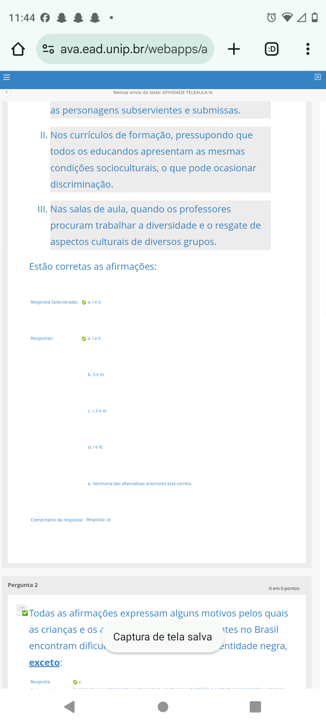 11:44 ava.ead.unip.br/webapps/a + :D > Revisar envio do teste: ATIVIDADE TELEAULA III as personagens subservientes e submissas. II. Nos currículos de formação, pressupondo que todos os educandos apresentam as mesmas condições socioculturais, o que pode ocasionar discriminação. III. Nas salas de aula, quando os professores procuram trabalhar a diversidade e o resgate de aspectos culturais de diversos grupos. Estão corretas as afirmações: Resposta Selecionada: Respostas a. b. III. e. Nenhuma das alternativas anteriores está correta Comentário da resposta: Resposta: a) Pergunta 2 0 em pontos Todas as afirmações expressam alguns motivos pelos quais as crianças e os a tes no Brasil Captura de tela salva encontram dificu entidade negra, exceto: Resposta