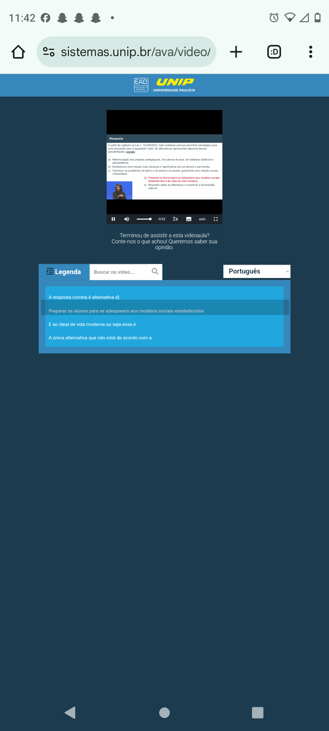 11:42 sistemas.unip.br/ava/video/ + :D UNIP UNIVERSIDADE PAULISTA Resposta A A partir da vigência da Lei 10.639/2003 todo professor precisa encontrar estratégias para uma - educação para igualdade racial As alternativas apresentam algumas dessas exceto a) Reformulação dos projetos pedagógicos dos planos de aula de materiais didáticos b) Estabelecer uma relação mais significativa com os alunos sua familia c) Conhece problemas do bairro do entorno da escola garantindo uma relação d) Preparar os alunos para se adequarem aos sociais estabelecidos de vida moderno e) todas as diversidade cultural II -0:52 2x auto Terminou de assistir a esta videoaula? Conte-nos que achou! Queremos saber sua opinião Legenda Buscar no Português A resposta correta é alternativa d) Preparar os alunos para se adequarem aos modelos sociais estabelecidos E ao ideal de vida moderna ou seja essa é A única alternativa que não está de acordo com a