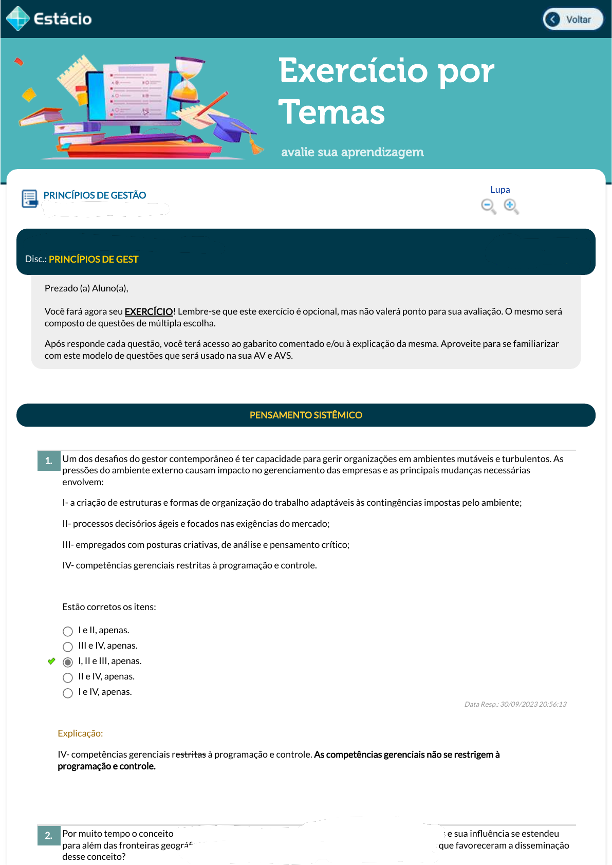 Um dos desa�os do gestor contemporâneo é ter capacidade para gerir organizações em ambientes mutáveis e turbulentos. As pressões do ambiente externo causam impacto no gerenciamento das empresas e as principais mudanças necessárias envolvem: I- a criação de estruturas e formas de organização do trabalho adaptáveis às contingências impostas pelo ambiente; II- processos decisórios ágeis e focados nas exigências do mercado; III- empregados com posturas criativas, de análise e pensamento crítico; IV- competências gerenciais restritas à programação e controle. Estão corretos os itens: Por muito tempo o conceito de produção em massa foi amplamente utilizado pelas organizações e sua in�uência se estendeu para além das fronteiras geográ�cas e ideológicas. Quais foram as condições socioeconômicas que favoreceram a disseminação desse conceito? PRINCÍPIOS DE GESTÃO Lupa DGT0005_202308775421_TEMAS Aluno: FABRICIO GANDA RODRIGUES Matr.: 202308775421 Disc.: PRINCÍPIOS DE GEST 2023.3 FLEX (G) / EX Prezado (a) Aluno(a), Você fará agora seu EXERCÍCIO! Lembre-se que este exercício é opcional, mas não valerá ponto para sua avaliação. O mesmo será composto de questões de múltipla escolha. Após responde cada questão, você terá acesso ao gabarito comentado e/ou à explicação da mesma. Aproveite para se familiarizar com este modelo de questões que será usado na sua AV e AVS. PENSAMENTO SISTÊMICO 1. I e II, apenas. III e IV, apenas. I, II e III, apenas. II e IV, apenas. I e IV, apenas. Data Resp.: 30/09/2023 20:56:13 Explicação: IV- competências gerenciais restritas à programação e controle. As competências gerenciais não se restrigem à programação e controle. 2. Baixado por Dayene Aguiar (dayenne.aguiar.cristina@gmail.com) lOMoARcPSD|30707823 O termo VUCA tem sido utilizado para descrever o mundo atual e seus desa�os. Esse acrônimo é uma forma de representar as mudanças rápidas e constantes que ocorrem na sociedade, na economia e na política. O que signi�ca o termo VUCA? O equilíbrio de interesses em uma empresa refere-se à busca por uma relação justa e equilibrada entre as diversas partes interessadas ou stakeholders, como funcionários, clientes, fornecedores, acionistas, comunidade local, entre outros. Qual é a importância desse equilíbrio para o sucesso de uma organização? Centralização dos mercados, crescimento econômico lento e força de trabalho desquali�cada. Centralização dos mercados, crescimento econômico acelerado e força de trabalho altamente quali�cada. Concentração dos mercados, crescimento econômico lento e força de trabalho altamente quali�cada. Concentração dos mercados, crescimento econômico acelerado e força de trabalho desquali�cada. Descentralização dos mercados, crescimento econômico lento e força de trabalho altamente quali�cada. Data Resp.: 30/09/2023 20:57:07 Explicação: O conceito de produção em massa foi usado por organizações durante décadas e sua in�uência ultrapassou fronteiras geográ�cas e ideológicas. A forte concentração dos mercados, o crescimento econômico acelerado, a força de trabalho desquali�cada, o desperdício e a falta de e�ciência foram condições socioeconômicas da época que favoreceram a multiplicação do modelo por outras empresas. 3. Voluntariedade, uni�cação, coerência, adaptabilidade. Volatilidade, incerteza, complexidade, ambiguidade. Volatilidade, incerteza, clareza, adaptabilidade. Volatilidade, unicidade, coerência, ação. Voluntariedade, unicidade, clareza, ação. Data Resp.: 30/09/2023 20:57:26 Explicação: VUCA, signi�ca: V - Volatilidade U - Incerteza C - Complexidade A - Ambiguidade 4. É importante apenas para empresas que possuem muitos funcionários. É importante apenas para empresas que atuam em mercados muito competitivos. É importante para garantir conexões positivas entre stakeholders e melhores resultados. É importante apenas para empresas que possuem muitos acionistas. Não é importante, pois apenas um grupo de interesse é su�ciente para manter a organização funcionando. Data Resp.: 30/09/2023 20:57:42 Explicação: Um dos fatores de sucesso de uma organização está no alcance do equilíbrio de interesses entre seus públicos. A balança não deve pender somente para um dos lados, caso contrário, sempre haverá na relação alguém com a impressão de que está sendo prejudicado e, como consequência, pensando em formas de não mais se relacionar com aquele que está tendo vantagem. Empregados insatisfeitos com seus empregadores tendem a produzir menos, clientes que não têm suas necessidades atendidas não voltam a fazer negócio com as empresas, acionistas insatisfeitos com os dividendos recebidos retiram seu capital daquele empreendimento. Maximizar os ganhos para todos os grupos de interesse pode ser a forma ideal de conquistar a conexão positiva entre os stakeholders e a chave do sucesso para garantia de melhores resultados.Baixado por Dayene Aguiar (dayenne.aguiar.cristina@gmail.com) lOMoARcPSD|30707823 A Administração é uma ciência que tem como objeto de estudo a organização. Segundo Sobral e Peci (SOBRAL, Felipe; PECI, Alketa. Administração: Teoria e prática no contexto brasileiro. 2. ed. São Paulo: Pearson, 2013) qual é a de�nição de organização? A visão sistêmica é uma abordagem que vê as organizações como um todo interconectado e interdependente e o propósito é uma parte essencial dessa equação. Qual é a importância do propósito para as organizações? O Banco LUCROS S/A. adquiriu, há um mês, uma empresa de software, que possuía 15% do mercado de programas de segurança bancária. Após uma análise organizacional, percebeu-se que a expansão desejada não ocorria em razão da falta de agressividade da empresa e de sua estrutura verticalizada e inflexível. O Banco decidiu, então, implementar uma transformação interna para