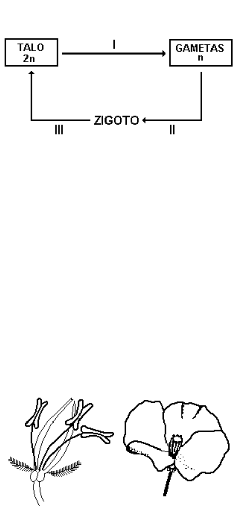 353 a) o aumento de produção de madeira para a indústria. b) a recuperação de espécies vegetais ameaçadas de extinção. c) melhoria de qualidade em áreas de reflorestamento. d) a existência de variabilidade genética nas plantas obtidas. e) a produção de plantas com fenótipo semelhante. [D] 2456. Entre os vegetais, os ENXERTOS são realizados: a) a partir de fecundação "in vitro" de células gaméticas oriundas de sementes incubadas. b) pela obtenção de mudas a partir de folhas previamente irradiadas com isótopos radioativos. c) pela extração de gemas meristemáticas obtidas a partir de caules mantidos em condições ambientais controladas. d) utilizando-se plantas enraizadas mais resistentes, que funcionam como suporte a plantas frutíferas de baixa resistência, mas de boa qualidade. e) pela extração de germoplasma de uma grande variedade de plantas, que depois são hibridizadas em laboratório e cultivadas em sistema de hidroponia. [D] 2457. Observe, no esquema a seguir, o ciclo reprodutivo de um vegetal: Sobre o ciclo reprodutivo anterior, é INCORRETO afirmar que: a) é diplobionte. b) a fecundação ocorre em II. c) III representa a ocorrência de mitoses. d) I compreende a ocorrência de meiose. e) o zigoto é haplóide. [E] 2458. Em pesquisas desenvolvidas com eucaliptos, constatou-se que a partir das gemas de um único ramo pode-se gerar cerca de 200.000 novas plantas, em aproximadamente duzentos dias; enquanto os métodos tradicionais permitem a obtenção de apenas cerca de cem mudas a partir de um mesmo ramo. A cultura de tecido é feita a partir a) de células meristemáticas. b) de células da epiderme. c) de células do súber. d) de células do esclerênquima. e) de células do lenho. [A] 2459. A seguir estão representados dois tipos de flor: A - relativamente pequena, com perianto não-atrativo e grandes antenas que ficam pendentes para fora. B - com pétalas largas, vistosas e coloridas; nectários e glândulas odoríferas. Que planta está mais adaptada à polinização por animais? Justifique sua resposta. A planta B, pois as características cor e odor servem para atrair agentes polinizadores, enquanto a planta A está mais adaptada à polinização anemófila. 2460. Em cultura de tecidos utiliza-se, por exemplo, uma ou mais células do ápice de caule para regenerar novas plantas. Esta técnica é possível porque essas células apresentam as características de serem, EXCETO: a) indiferenciadas. b) meristemáticas. c) de ciclo celular intenso. d) totipotentes. e) especializadas. [E] 2461. Assinale a alternativa que inclui a seqüência CORRETA de eventos básicos do ciclo de vida das Angiospermas: a) gametogênese, formação do zigoto, embriogênese, fertilização, formação da semente, germinação, crescimento vegetativo e floração. b) gametogênese, fertilização, embriogênese, formação do zigoto, formação da semente, germinação, crescimento vegetativo e fl oração. c) gametogênese, formação do óvulo e do zigoto, fertilização, formação da semente, germinação, crescimento vegetativo e floração. d) gametogênese, fertilização, formação do zigoto, desenvolvimento do saco embrionário, formação da semente, germinação, crescimento vegetativo. e) gametogênese, fertilização, formação do zigoto, embriogênese, formação da semente, germinação, crescimento vegetativo e floração. [E]