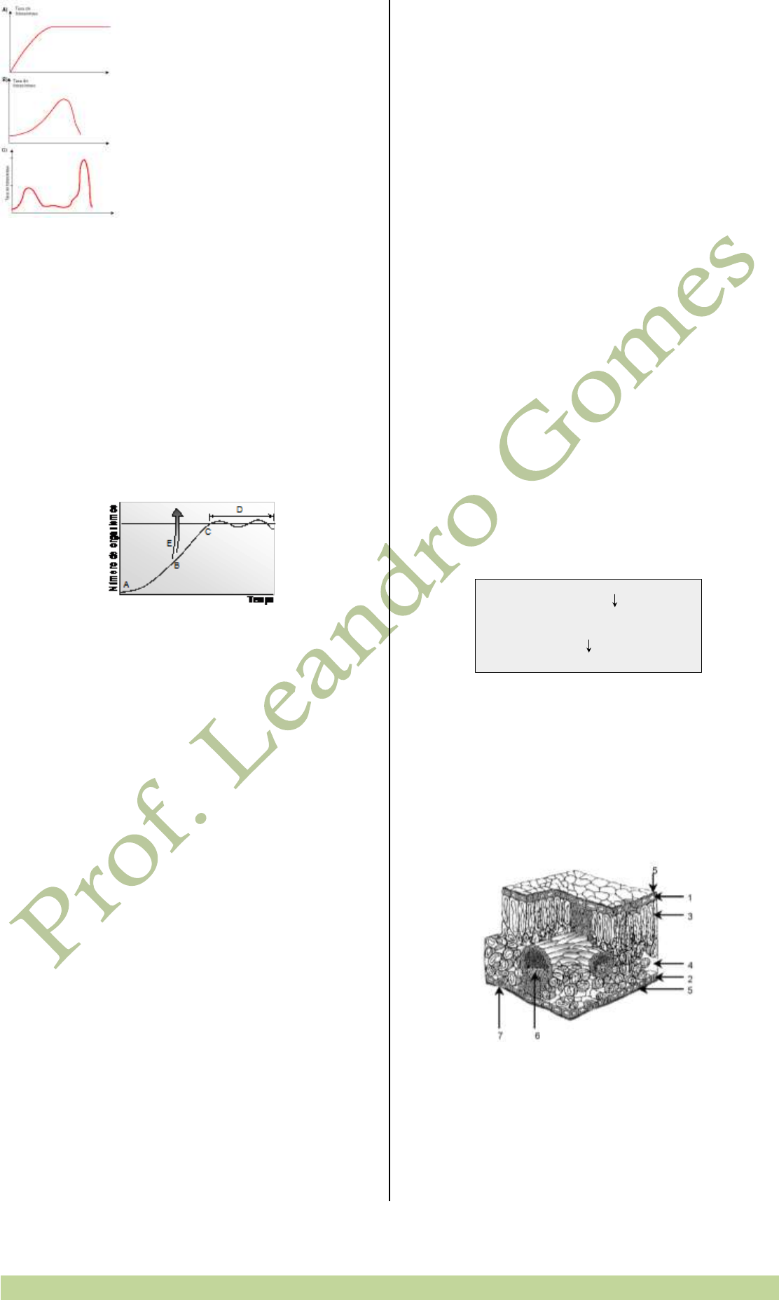 344 Não estude BIOLOGIA, desfrute-a!!! Prof. Leandro Gomes 0-0) O gráfico (A) ilustra a influência da concentração do dióxido de carbono na taxa de fotossíntese. 1-1) A taxa fotossintética varia em diferentes vegetais; o gráfico (B) ilustra a influência da temperatura na taxa de fotossíntese. 2-2) O gráfico (C) serve para ilustrar a variação das taxas fotossintéticas em vários comprimentos de onda da luz branca, em que o primeiro e o segundo picos observados correspondem, respectivamente, à absorção da cor azul e da vermelha. 3-3) A taxa de fotossíntese é máxima a uma determinada concentração de gás carbônico, sob elevada intensidade luminosa; o gráfico (B) ilustra a relação entre essas variáveis. 4-4) Em (A), ilustra-se a variação na taxa de fotossíntese em função da temperatura, e em (C), em função da concentração de gás carbônico. 2/16 COVEST 2005 3860. O crescimento de uma população é ilustrado no gráfico abaixo. Em relação a este assunto, analise as proposições seguintes. 00 O crescimento da população em A é menor do que em B; no segmento A, o número inicial de organismos capazes de se reproduzir é pequeno. 11 O segmento B mostra que a população adquire maior velocidade de crescimento; fala-se em crescimento exponencial. 22 No segmento C, a população se aproxima dos limites impostos pelo ambiente. 33 No segmento D da curva, evidencia-se que ocorrem pequenas oscilações em torno da situação de equilíbrio. 44 Em E, seta indicativa, ilustra-se o crescimento esperado, caso não existisse resistência ambiental. 3861. Grandes mudanças podem ser determinadas na natureza por vulcões, terremotos, furacões, maremotos, enchentes e secas. Muitas dessas mudanças, indesejáveis, são, contudo, provocadas pela má atuação do homem. Analise as proposições abaixo. 00 O desmatamento indiscriminado pode determinar graves conseqüências, como erosão e empobrecimento do solo. 11 Na atmosfera, o CO2, juntamente com o vapor d’água, o metano e outros gases, retém parte da radiação infravermelha que se dissipa da Terra para o espaço, mantendo o ar aquecido (efeito estufa). 22 Com a destruição da camada de ozônio e o conseqüente aumento na incidência de raios ultravioleta, houve aumento significativo da eutroficação na natureza. 33 A liberação de óxido nitroso, um dos responsáveis pela acentuação do efeito estufa é também resultante da má interferência humana na natureza. 44 As chuvas ácidas são causadas pela combinação da sílica e do amianto, produzidos pela indústria automobilística, com vapores de água existentes na atmosfera. 3862. Quando se considera o processo evolutivo, se tem em mente que as populações experimentam um conjunto de mudanças ao longo do tempo. Sobre esse tema, analise as proposições abaixo. 00 As mutações podem ser favoráveis, indiferentes ou desfavoráveis, dependendo do ambiente em que vivem os organismos mutados. 11 Casamento entre pessoas aparentadas (cruzamentos consangüíneos) aumenta a freqüência de alelos deletérios na população. 22 A seleção natural atua sobre a diversidade genética intra-específica; os indivíduos mais bem adaptados ao ambiente são selecionados. 33 A semelhança entre a estrutura interna da asa do morcego e a do membro superior humano é indicativa do tipo de evolução denominado ‘convergência adaptativa’. 44 O acaso pode provocar alterações significativas na freqüência de diferentes alelos. 3863. A manipulação genética de microorganismos, principalmente a manipulação de bactérias, já possibilitou a obtenção de resultados benéficos para a medicina e para outras áreas do conhecimento. Com relação a esse tema, é verdadeiro afirmar que: 00 são utilizadas pequenas porções circulares de DNA, dispersas no citoplasma bacteriano e que têm replicação independente do cromossomo. 11 são obtidos segmentos de DNA, com genes de interesse, através de cortes com exonucleases, como a transcriptase reversa. 22 promove-se o corte de moléculas de DNA com o uso de enzimas que reconhecem seqüências nucleotídicas específicas no DNA. 33 se duas diferentes moléculas de DNA forem cortadas por uma mesma enzima de restrição serão produzidos iguais conjuntos de fragmentos. 44 a tecnologia do DNA recombinante (ou Engenharia Genética) fundamenta-se na fusão de “trechos” de DNA de diferentes organismos para a construção de DNA híbrido. 3864. A motilidade e as secreções do sistema digestivo são controladas por mecanismos neurais e hormonais que garantem a perfeita digestão e a absorção do alimento. Sobre esse assunto, analise as afirmativas abaixo. 00 A secreção salivar começa a ser estimulada pela presença do alimento na cavidade oral. 11 A presença de alimento no estômago estimula a secreção do hormônio gastrina, que induz a produção do suco gástrico, rico em ácido clorídrico e pepsina. 22 A acidez do quimo que chega ao duodeno estimula a produção de secretina, que é levada pelo sangue ao pâncreas, estimulando, assim, a secreção de bicarbonato de sódio. 33 A presença de gorduras no alimento estimula a produção de colecistoquinina, que vai inibir a secreção pancreática e a liberação de bile pela vesícula. 44 A função da enterogastrona é estimular o esvaziamento gástrico pelo aumento dos movimentos peristálticos. 3865. Em uma exaustiva análise de genealogias humanas, com relação à surdez congênita na descendência de pais normais para a audição, cujos progenitores eram surdos, foi observado que a distribuição fenotípica para normais e surdos obedecia a uma proporção de 9:7, respectivamente, como ilustrado no quadro abaixo. Considerando esses dados, analise as proposições a seguir. Geração P Pai surdo Mãe surdaX Geração F1 100% descendentes normais para audição Geração F2 9 descendentes normais para audição (F1 x F1) 7 descendentes surdos 00 A surdez congên