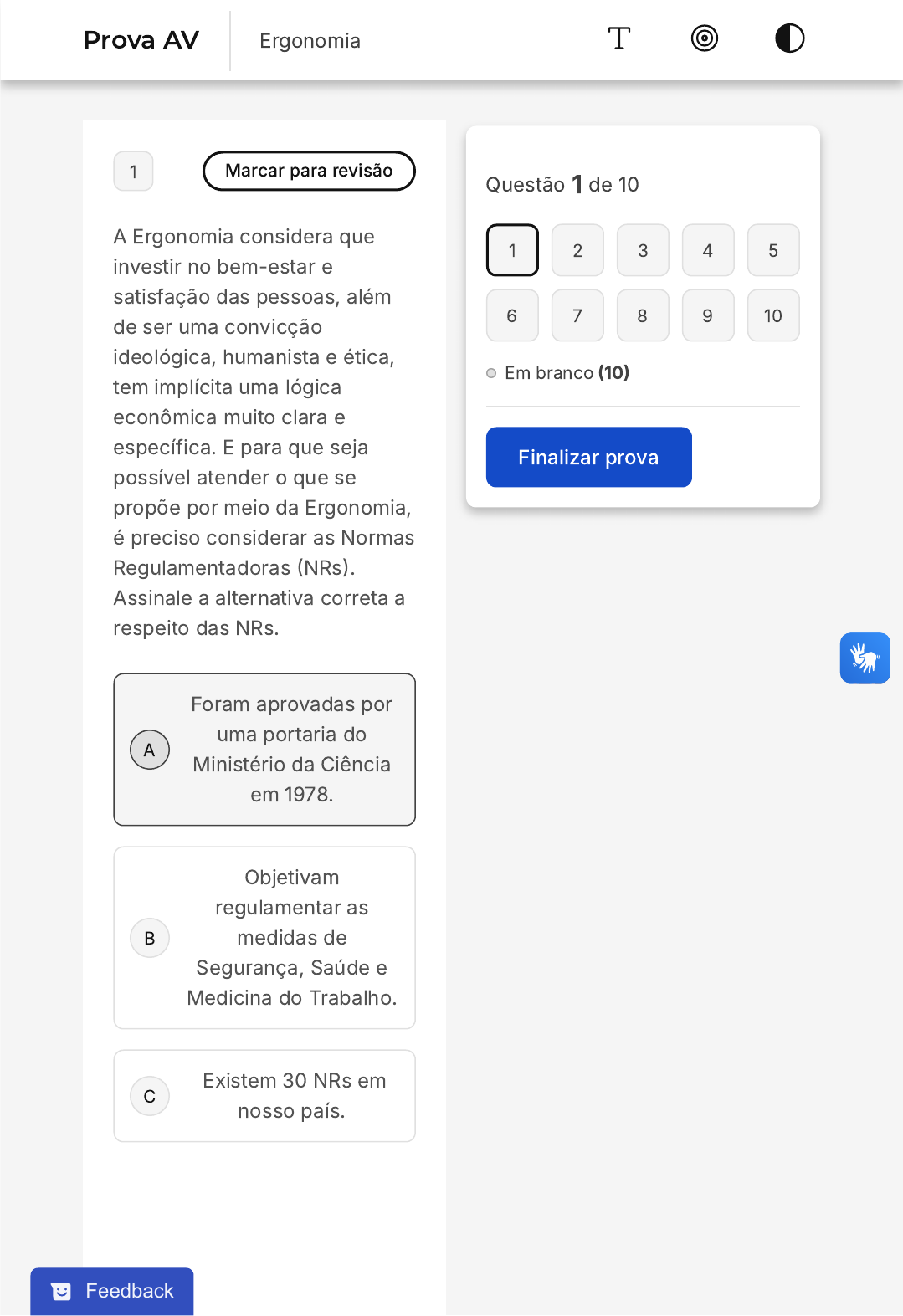 25/10/2024, 11:44 estacio.saladeavaliacoes.com.br/prova/671bae8beb080430dfb79172/ https://estacio.saladeavaliacoes.com.br/prova/671bae8beb080430dfb79172/ 1/17 A B C 1 Marcar para revisão A Ergonomia considera que investir no bem-estar e satisfação das pessoas, além de ser uma convicção ideológica, humanista e ética, tem implícita uma lógica econômica muito clara e específica. E para que seja possível atender o que se propõe por meio da Ergonomia, é preciso considerar as Normas Regulamentadoras �NRs�. Assinale a alternativa correta a respeito das NRs. Foram aprovadas por uma portaria do Ministério da Ciência em 1978. Objetivam regulamentar as medidas de Segurança, Saúde e Medicina do Trabalho. Existem 30 NRs em nosso país. Questão 1 de 10 Em branco �10� Finalizar prova 1 2 3 4 5 6 7 8 9 10 Prova AV Ergonomia Feedback 25/10/2024, 11:44 estacio.saladeavaliacoes.com.br/prova/671bae8beb080430dfb79172/ https://estacio.saladeavaliacoes.com.br/prova/671bae8beb080430dfb79172/ 2/17 D E Consideram assuntos de interesse da Ergonomia, da Economia e das Ciências da Natureza. Somente os sindicatos têm autonomia para alterar as NRs. 2 Marcar para revisão Analise as afirmativas a seguir. I�� A NR�17 fornece um conjunto de orientações sobre procedimentos obrigatórios relacionados à Segurança e Medicina do Trabalho. II�� A NR�17 direciona uma empresa a ser responsável pela realização de uma análise ergonômica dentro de cada área de trabalho. III��A NR�17 orienta sobre as condições ideais para que o trabalho ocorra conforme o que está previsto em tal norma. Assinale a alternativa correta. 25/10/2024, 11:44 estacio.saladeavaliacoes.com.br/prova/671bae8beb080430dfb79172/ https://estacio.saladeavaliacoes.com.br/prova/671bae8beb080430dfb79172/ 3/17 A B C D E Somente a afirmativa I está correta. Somente a afirmativa II está correta. Somente a afirmativa III está correta. Apenas as afirmativas I e II estão corretas. As afirmativas I, II e III corretas. 3 Marcar para revisão As Normas Regulamentadoras �NRs� regulamentam e fornecem orientações sobre procedimentos considerados obrigatórios e que estão associados com questões que tratam da segurança e saúde do trabalhador. Marque a alternativa a seguir que relaciona corretamente a numeração da Norma Regulamentadora com seu respectivo assunto considerado. 25/10/2024, 11:44 estacio.saladeavaliacoes.com.br/prova/671bae8beb080430dfb79172/ https://estacio.saladeavaliacoes.com.br/prova/671bae8beb080430dfb79172/ 4/17 A B C D E NR�35 e Segurança no trabalho em máquinas e equipamentos pesados. NR�23 e Equipamentos de Proteção Individual para uso de agentes bioquímicos. NR�23 e Trabalho em espaços confinados. NR�33 e Proteção e combate a incêndios. NR�35 e Trabalho em Altura. 4 Marcar para revisão A Ergonomia (ou Fatores Humanos) é uma disciplina científica relacionada ao entendimento das interações entre os seres humanos e outros elementos ou sistemas, entre outros pontos. Entretanto, cabe compreender o que ocorre nas rotinas diárias das empresas e o que está sendo feito para se proporcionar melhores condições de trabalho para aqueles que 25/10/2024, 11:44 estacio.saladeavaliacoes.com.br/prova/671bae8beb080430dfb79172/ https://estacio.saladeavaliacoes.com.br/prova/671bae8beb080430dfb79172/ 5/17 A B executam tarefas produtivas. Assim, é preciso o atendimento das legislações trabalhistas ou Normas Regulamentadoras �NRs�. A respeito disto, assinale a alternativa correta que está alinhada com este texto. Sobre as NRs, destacam-se as disposições superiores, com obrigações de caráter mais específicas sobre o que deve ser realizado para que o colaborador tenha proteção quando trabalha. Não é fundamental o conhecimento de todas as NRs pelos gestores de trabalho das organizações produtivas, a não ser aquelas que tratam de uso de equipamentos de proteção individual, medidas de proteção a incêndios e trabalhos com eletricidade. 25/10/2024, 11:44 estacio.saladeavaliacoes.com.br/prova/671bae8beb080430dfb79172/ https://estacio.saladeavaliacoes.com.br/prova/671bae8beb080430dfb79172/ 6/17 C D As NRs sempre foram consideradas mais importantes do que a CLT �Consolidação das Leis do Trabalho), uma vez que as NRs são produzidas por profissionais da área de Segurança, enquanto a CLT foi produzida por políticos que em sua maioria são advogados. As NRS não devem servir de referência para as empresas que possuem certificação. Pois salvo oposto, a certificação não perdurará, uma vez que há a fiscalização constante para manutenção da segurança no ambiente de trabalho. 25/10/2024, 11:44 estacio.saladeavaliacoes.com.br/prova/671bae8beb080430dfb79172/ https://estacio.saladeavaliacoes.com.br/prova/671bae8beb080430dfb79172/ 7/17 E As NRs não precisam ser atualizadas, pois não atendem mais as necessidades operacionais das empresas, devido à implementação do conceito de indústria 4.0, que está excluindo a necessidade do trabalho humano em atividades operacionais. 5 Marcar para revisão Um trabalhador entra na sala de seu líder reclamando que algumas situações consideradas críticas podem causar danos sérios à sua saúde enquanto ele executa as suas tarefas. O líder rapidamente vai até o local e constata que realmente existem movimentações de cargas pesadas. Diante do que foi estudado nas aulas, qual seria a melhor decisão a ser tomada? 25/10/2024, 11:44 estacio.saladeavaliacoes.com.br/prova/671bae8beb080430dfb79172/ https://estacio.saladeavaliacoes.com.br/prova/671bae8beb080430dfb79172/ 8/17 A B C Orientar o trabalhador para jamais levantar um peso que seja maior do que a capacidade suportada por ele. Registrar os pontos críticos e corrigi-los aos poucos conforme a disponibilidade de orçamento. Somente encaminhar os trabalhadores à área de medicina ocupacional que estiverem com dores na região lombar, na coluna e nos braços, entr