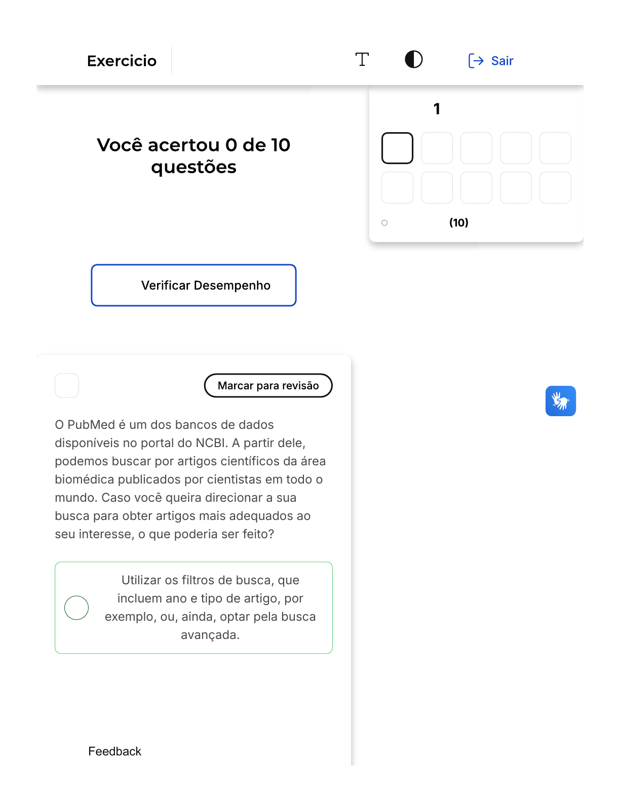 Verifique o seu desempenho e continue treinando! Você pode refazer o exercício quantas vezes quiser. A 1 O PubMed é um dos bancos de dados disponíveis no portal do NCBI. A partir dele, podemos buscar por artigos científicos da área biomédica publicados por cientistas em todo o mundo. Caso você queira direcionar a sua busca para obter artigos mais adequados ao seu interesse, o que poderia ser feito? Utilizar os filtros de busca, que incluem ano e tipo de artigo, por exemplo, ou, ainda, optar pela busca avançada. Questão de 10 Em branco 1 2 3 4 5 6 7 8 9 10 Feedback Ncbi e Alinhamento De Sequências Firefox https://estacio.saladeavaliacoes.com.br/exercicio/671a4282a029ad8caa... 1 of 18 24/10/2024, 09:50 B C D E Pagar uma assinatura mensal ao PubMed para que ele direcione automaticamente suas buscas de acordo com os critérios que você deseja. Não existe a possibilidade de direcionar a busca, é necessário avaliar todos os títulos que aparecem como resultado para escolher aqueles mais adequados. Cadastrar seus dados profissionais e receber uma autorização para acessar a parte restrita do PubMed que permite buscas avançadas. Acessar o PubMed por meio de rede de Internet de instituição pública, como universidades ou bibliotecas. Só assim é possível direcionar a busca por artigos. Opa! A alternativa correta é a letra A. Confira o gabarito comentado! O PubMed, disponível no portal do NCBI, permite que qualquer usuário realize buscas direcionadas utilizando filtros ou o modo avançado. Esses recursos possibilitam a personalização da busca, tornando-a mais eficiente e adequada ao interesse do usuário. Vale ressaltar que aFeedback Firefox https://estacio.saladeavaliacoes.com.br/exercicio/671a4282a029ad8caa... 2 of 18 24/10/2024, 09:50 A B disponibilidade completa de alguns artigos pode variar, pois isso depende da política da revista em que o artigo foi publicado, e não do próprio PubMed. Portanto, a alternativa correta é a A, que sugere a utilização dos filtros de busca e a opção pela busca avançada. 2 Considere o alinhamento de uma sequência nucleotídica desconhecida em relação a um banco de dados de genes associados ao desenvolvimento de câncer usando a ferramenta BLAST. A partir dessa situação, são descritas algumas características desse programa. Assinale a alternativa que retrata a utilização correta dessa ferramenta. A variação da ferramenta indicada nesse caso é o BLASTp, que compara sequência de nucleotídeos contra um banco de dados de proteínas. Quanto menor o valor de e-value, menor a probabilidade de o alinhamento ter sido obtido ao acaso com uma sequência do banco de dados. Feedback Firefox https://estacio.saladeavaliacoes.com.br/exercicio/671a4282a029ad8caa... 3 of 18 24/10/2024, 09:50 C D E A opção de BLASTn deve ser escolhida, uma vez que compara sequência de aminoácidos contra um banco de dados de proteínas. Se o valor de e-value for igual a 0.0, o alinhamento deve ser desconsiderado, pois ocorreu ao acaso. Caso encontre o e-value igual a 100%, a sequência desconhecida será idêntica à sequência no banco de dados. Opa! A alternativa correta é a letra B. Confira o gabarito comentado! O valor de e-value é um indicador da significância estatística do alinhamento realizado com a ferramenta BLAST. Valores iguais ou muito próximos de zero são desejáveis, pois indicam que a probabilidade de o alinhamento ter ocorrido por acaso é extremamente baixa. Portanto, quanto menor o valor de e-value, mais confiável é o alinhamento. A alternativa B está correta, pois afirma que um valor de e- value menor indica uma menor probabilidade de o alinhamento ter ocorrido ao acaso. As variantes BLASTn e BLASTp são usadas para comparar sequências de nucleotídeos e aminoácidos, respectivamente, com bancos de dados Feedback Firefox https://estacio.saladeavaliacoes.com.br/exercicio/671a4282a029ad8caa... 4 of 18 24/10/2024, 09:50 A B C D correspondentes. 3 Escolha a opção que justifique por que é importante que o comprimento do produto amplificado pela reação de PCR seja maior que 150 pares de bases (pb). Estabelecer um comprimento mínimo do produto aumenta a especificidade da reação.Primers que se ligam ao redor de regiões menores que 150pb formam estruturas secundárias com maior facilidade. Primers que se ligam ao redor de regiões menores que 150pb formam estruturas secundárias com maior facilidade. A enzima Taq DNA polimerase não consegue amplificar segmentos de DNA menores que 150pb. A temperatura de anelamento para amplificar uma região menor que 150pb é maior que 72°C. Feedback Firefox https://estacio.saladeavaliacoes.com.br/exercicio/671a4282a029ad8caa... 5 of 18 24/10/2024, 09:50 E Produtos amplificados menores que 150pb podem se confundir com restos de primers que não se ligaram ao DNA e ficam no final da eletroforese. Opa! A alternativa correta é a letra E. Confira o gabarito comentado! O comprimento do produto amplificado pela reação de PCR é um fator crucial para a eficácia do processo. O tamanho ideal do produto da PCR está entre 150 e 1.000 pares de bases (pb). Produtos amplificados menores que 150pb podem ser confundidos com restos de primers que não se ligaram ao DNA e aparecem no final do gel da eletroforese. Isso pode levar a resultados imprecisos ou enganosos. Além disso, se a região amplificada for muito grande, a DNA polimerase pode não conseguir adicionar todos os nucleotídeos necessários, o que pode resultar em uma reação de PCR ineficaz. A enzima Taq DNA polimerase, em particular, tem dificuldade para amplificar produtos maiores que 1000pb. Portanto, é importante garantir que o comprimento do produto amplificado esteja dentro do intervalo ideal para garantir a precisão e a eficácia da reação de PCR. Feedback Firefox https://estacio.saladeavaliacoes.com.br/exercicio/671a4282a029ad8caa... 6 of 18 24/10/2024, 09:50 A B C D E 4 �PR4 � UFRJ � Biólogo - UFRJ � Biologia M