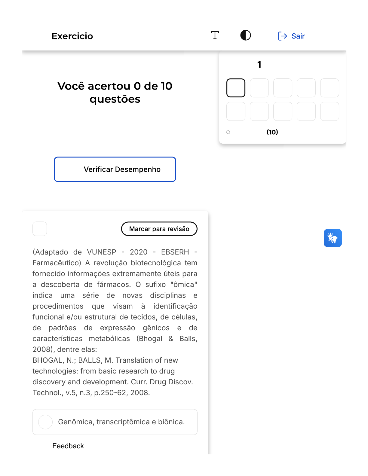 Verifique o seu desempenho e continue treinando! Você pode refazer o exercício quantas vezes quiser. A 1 �Adaptado de VUNESP � 2020 � EBSERH � Farmacêutico) A revolução biotecnológica tem fornecido informações extremamente úteis para a descoberta de fármacos. O sufixo "ômica" indica uma série de novas disciplinas e procedimentos que visam à identificação funcional e/ou estrutural de tecidos, de células, de padrões de expressão gênicos e de características metabólicas �Bhogal & Balls, 2008�, dentre elas: BHOGAL, N.; BALLS, M. Translation of new technologies: from basic research to drug discovery and development. Curr. Drug Discov. Technol., v.5, n.3, p.250�62, 2008. Genômica, transcriptômica e biônica. Questão de 10 Em branco 1 2 3 4 5 6 7 8 9 10 Feedback Anotação Gênica Firefox https://estacio.saladeavaliacoes.com.br/exercicio/671a42b0a029ad8caa... 1 of 17 24/10/2024, 09:51 B C D E Genômica, transcriptômica e metabolômica. Proteômica, lipidômica e dicotômica. Genômica, dicotômica e proteômica. Genômica, lipidômica e biônica. Opa! A alternativa correta é a letra B. Confira o gabarito comentado! As ciências "ômicas" referem-se a campos de estudo na biologia que terminam com o sufixo "ômica", como genômica, transcriptômica e metabolômica. A genômica é o estudo do genoma completo de um organismo. A transcriptômica é o estudo de todos os transcritos de RNA de um organismo, enquanto a metabolômica é o estudo do perfil metabólico de um organismo. Portanto, a alternativa correta é a "B", que lista genômica, transcriptômica e metabolômica. As outras alternativas listam termos que não se enquadram na definição de ciências "ômicas". Por exemplo, "dicotômica" refere-se a algo que se divide em duas partes, e "biônica" é um campo de estudo que busca aplicar processos biológicos para fins militares e tecnológicos. A "lipidômica" é uma ciência "ômica", mas está listada com termos queFeedback Firefox https://estacio.saladeavaliacoes.com.br/exercicio/671a42b0a029ad8caa... 2 of 17 24/10/2024, 09:51 A B não são ciências "ômicas". 2 Um grande avanço da bioinformática aconteceu durante a execução do Projeto Genoma Humano, que durou mais de 10 anos e teve como objetivo principal determinar a ordem dos nucleotídeos de todo genoma da nossa espécie. Essa empreitada científica estimulou o aprimoramento de computadores e de programas para lidar com a grande quantidade de dados que começou a ser gerada. Hoje vivemos o que é chamado de ¿era pós- genômica¿, como o desenvolvimento e aperfeiçoamento de técnicas e programas que permitem estudar outras ciências ômicas. De acordo com as ciências ômicas, analise as afirmativas a seguir: I��Genética é o estudo de todo o DNA de um indivíduo. II� �Metabolômica estuda moléculas de baixo peso molecular produzidas por uma célula. III��Para investigar o genoma de um indivíduo, precisamos de uma amostra de seu RNA. Quais são as afirmativas corretas? As afirmativas 1 e 3 estão corretas. As afirmativas 1 e 2 estão corretas. Feedback Firefox https://estacio.saladeavaliacoes.com.br/exercicio/671a42b0a029ad8caa... 3 of 17 24/10/2024, 09:51 C D E Somente a afirmativa de número 3 está correta. Somente a afirmativa 2 está correta. Somente a afirmativa de número 1 está correta. Opa! A alternativa correta é a letra C. Confira o gabarito comentado! O estudo de todo o DNA de um indivíduo é chamado de genômica. A genética é a parte da ciência que estuda a hereditariedade, a estrutura e a função dos genes e a variação dos seres vivos. Na genética estudamos genes individuais. Às vezes, genética e genômica são usadas indistintamente, mas têm significados diferentes. Para investigar o genoma de um indivíduo, precisamos de uma amostra de seu DNA. 3 Diferentes tipos de dados biológicos podem ser armazenados em bancos de dados computacionais. Em relação aos tipos de bancos de dados biológicos, relacione as duas Feedback Firefox https://estacio.saladeavaliacoes.com.br/exercicio/671a42b0a029ad8caa... 4 of 17 24/10/2024, 09:51 A B C D E colunas. 1. Curado. 2. Acesso livre. 3. Especializado 4. Primário. ( ) Armazenam informações biológicas originais, resultados de experimentos científicos. ( ) Banco que contém informações processadas por um profissional com uma boa experiência no assunto. ( ) Reúnem todo conteúdo que atende a um interesse em particular, por exemplo, sobre o HIV. ( ) Está disponível para qualquer tipo de usuário, sem restrição de acesso. Qual a sequência correta? 4�1�3�2. 1�2�3�4. 1�3�2�4. 4�3�2�1. 2�4�1�3. Opa! A alternativa correta é a letra A. Confira o gabarito comentado! Feedback Firefox https://estacio.saladeavaliacoes.com.br/exercicio/671a42b0a029ad8caa... 5 of 17 24/10/2024, 09:51 Os bancos de dados biológicos podem ser categorizados de diversas formas, incluindo a disponibilidade de acesso, o conteúdo dos dados armazenados e a qualidade desses dados. Quando falamos de disponibilidade de acesso, um banco de dados pode ser de acesso livre, ou seja, disponível para qualquer tipo de usuário, sem restrição de acesso �2�. Em relação ao conteúdo dos dados, um banco de dados primário é aquele que armazena informações biológicas originais, resultados de experimentos científicos �4�, enquanto um banco de dados especializado reúne todo conteúdo que atende a um interesse em particular, como, por exemplo, sobre o HIV �3�. No que se refere à qualidade dos dados, um banco de dados curado é aquele que contém informações processadas por um profissional com uma boa experiência no assunto �1�. Portanto, a sequência correta é 4�1�3�2. 4 A química de produtos naturais tem empregado novas metodologias com o objetivo de acelerar a descoberta e o isolamento de novos compostos que são originários das plantas e que podem ser empregados com fins terapêut
