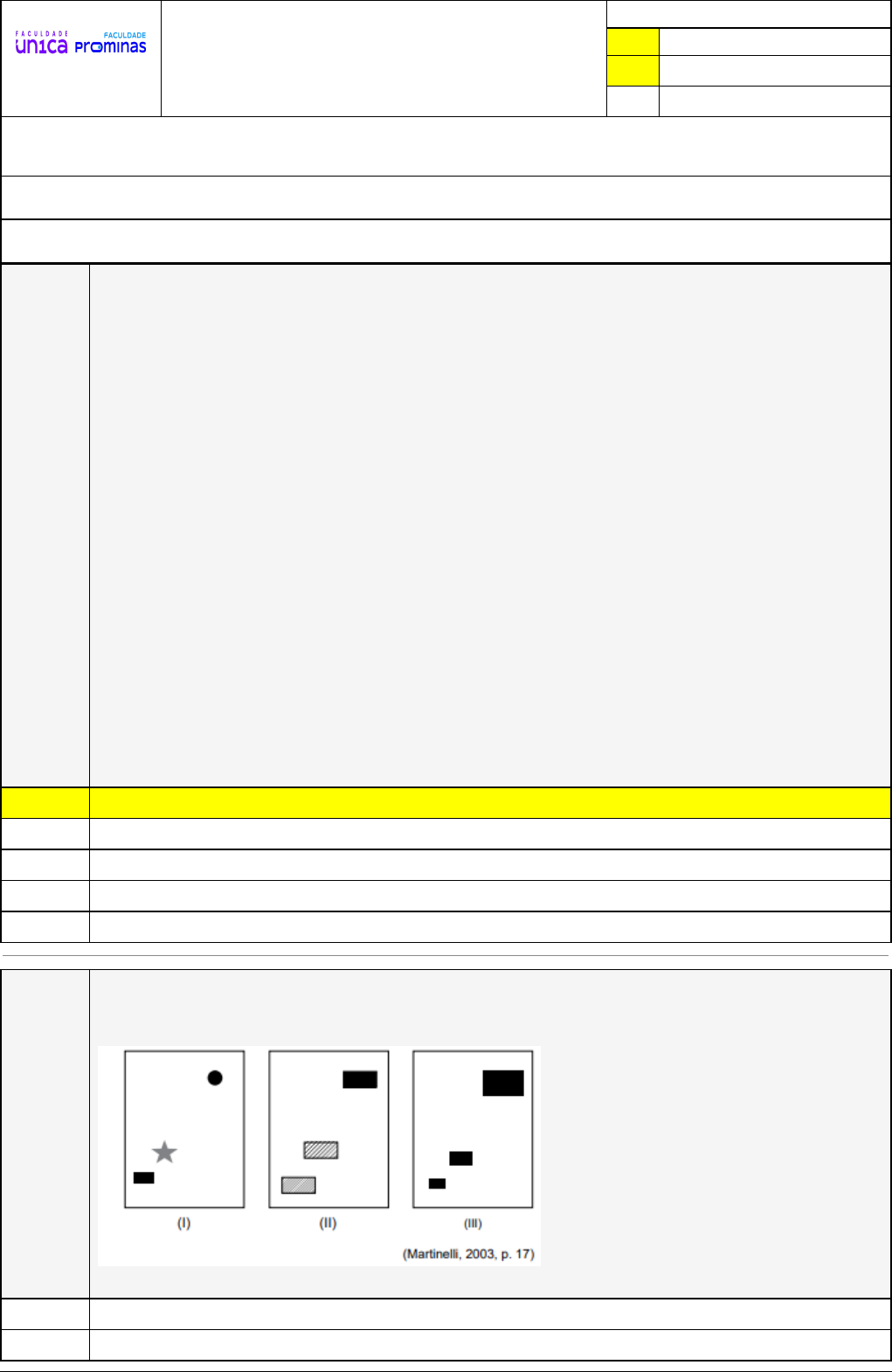 Pincel Atômico - 05/08/2024 15:05:17 1/3 JEAN CARLOS FRANÇA VIEIRA Exercício Caminho do Conhecimento - Etapa 22 (15864) Atividade finalizada em 01/08/2024 13:30:09 (2437906 / 1) LEGENDA Resposta correta na questão # Resposta correta - Questão Anulada X Resposta selecionada pelo Aluno Disciplina: PRÁTICA PEDAGÓGICA INTERDISCIPLINAR: FUNDAMENTOS E METODOLOGIA DE ENSINO DE CIÊNCIAS DA NATUREZA E HUMANA [1122354] - Avaliação com 8 questões, com o peso total de 1,67 pontos [capítulos - 5] Turma: Segunda Graduação: Segunda Graduação 6 meses - Licenciatura em Pedagogia - Grupo: FPD-MAI/2024 - SGegu0A180524 [125283] Aluno(a): 91615359 - JEAN CARLOS FRANÇA VIEIRA - Respondeu 8 questões corretas, obtendo um total de 1,67 pontos como nota [358098_1055 85] Questão 001 (FUNDEP – 2019) Os mapas e gráficos armazenam informação espacial abstrata e estruturada e devem ser considerados instrumentos indispensáveis ao aprendizado dos temas relacionados com o ambiente, o território e a Geografia como um todo. O mapa fornece uma perspectiva simultânea de uma área e organiza o conhecimento espacial, expressando relações. A pessoa com deficiência visual não pode prescindir desse meio de comunicação, que, adaptado ao tato, ajuda na organização de suas imagens espaciais internas. ALMEIDA, R.D. Cartografia escolar. São Paulo: Contexto, 2007. Considere as seguintes adaptações: I. Transcrição completa das informações visuais dos mapas convencionais para uma forma perceptível pelo tato. II. Uso de maquetes elaboradas a partir de dados de curvas de nível para o trabalho com as representações do relevo e suas dinâmicas. III. Exercícios sobre escala cartográfica utilizando brinquedos como carrinhos, bonecas e bichos de vários tamanhos. IV. Utilização de texturas para representar a variação de cores dos mapas convencionais, geralmente associadas a informações qualitativas, quantitativas ou ordenadas. Estão adequadas ao público com deficiência visual para o trabalho da cartografia e suas aplicações na Educação Básica as adaptações X II, III e IV, apenas. I e IV apenas. I, II e IV, apenas. I e III, apenas. II e III, apenas. [358098_1055 86] Questão 002 (VUNESP – 2019) Com a finalidade de representar um determinado tema, o pesquisador deve explorar as variações visuais com propriedades perceptivas compatíveis. Analise as imagens. As imagens I, II e III expressam, respectivamente, os aspectos: quantitativo, ordenado e qualitativo. qualitativo, quantitativo e ordenado. Pincel Atômico - 05/08/2024 15:05:17 2/3 X qualitativo, ordenado e quantitativo. ordenado, qualitativo e quantitativo. ordenado, quantitativo e qualitativo. [358097_1056 71] Questão 003 Em relação a Cartografia marque o item verdadeiro. Os adolescentes já possuem um desenvolvimento cognitivo mais amadurecido e por isso podem ser facilmente trabalhado atividades com representações mais abstratas. A preocupação central da Cartografia é entender o espaço geográfico atual não sendo relevante verificar os elementos e processos do passado. Embora a ciência geográfica seja interdisciplinar, o ensino de Cartografia ocor-re exclusivamente na Geografia pois não há uma conexão clara com as demais disciplinas. Desde os tempos antigos a humanidade já produzia representações gráficas e um dos mapas mais antigos foi produzido em sítios arqueológicos pelos gregos em 1.500 d.C. X É importante o estudo dos mapas pois eles buscam representar as relações espaciais do cotidiano para se compreender elementos históricos e geográficos e que contribuam com a leitura do mundo que está sempre em transformação. [358097_1056 74] Questão 004 O nome da metodologia que estuda os processos de construção de conhecimentos conceituais e procedimentais que desenvolvem habilidades para que o aluno possa fazer as leituras do mundo por meio das suas representações é alfabetização geológica. X alfabetização cartográfica. alfabetização espaço-temporal. alfabetização interdisciplinar. todos os itens anteriores são verdadeiros. [358097_1055 88] Questão 005 (MPE – GO – 2019) De acordo com os elementos que representam, os mapas podem ser classificados em vários tipos de mapas. Observe o mapa abaixo para responder a questão. Observando o mapa acima, podemos dizer que se trata do seguinte tipo de mapa: Histórico, pois representa os fatos históricos ocorridos do Brasil, ao longo dos anos. Político, pois representa as unidades federativas do Brasil. Econômico, pois representa as riquezas do Brasil. Pincel Atômico - 05/08/2024 15:05:17 3/3 Demográfico, pois representa a distribuição da população pelo território brasileiro. X Físico, pois representa um aspecto natural como clima, vegetação, relevo e hidrografia. [358098_1055 91] Questão 006 (VUNESP – 2018) Texto Enunciado Sobre os mapas temáticos, é correto afirmar que: devem ser entendidos como materiais auxiliares dos mapas topográficos, pois só contêm uma parcela específica das informações da realidade. X podem ser construídos levando-se em conta vários métodos, cada um apropriado às formas de manifestação dos fenômenos considerados em cada tema. são aqueles voltados para a síntese de informações da superfície terrestre, informando, necessariamente, elementos do terreno, como pontos cotados. objetivam representar, de modo mais próximo à realidade, objetos de pequenas dimensões, como bairros, aldeias ou pequenas extensões de vegetação. não necessitam, como os topográficos, seguir as convenções cartográficas, pois cabe ao mapeador consciente decidir quais elementos vai privilegiar na representação. [358097_1055 82] Questão 007 (Fundação Carlos Chagas – 2018) Texto Enunciado No trabalho com a Geografia em sala de aula, a cartografia é um recurso fundamental para o ensino e a pesquisa. Sobre o uso da cartografia, é correto afirmar que a ação de construir mapas deve ser incorpor