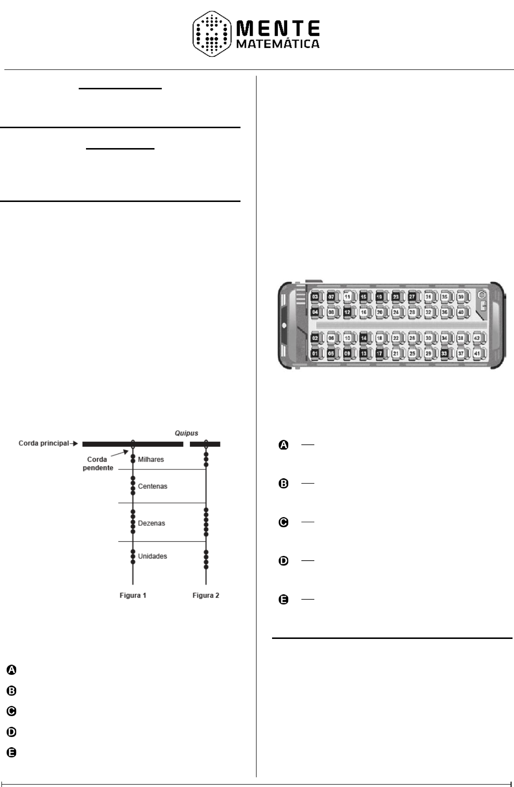 Competência 1 | Enem 495 – Versão Matemática P ág in a2 0 Competência 1 Construir significados para os números naturais, inteiros, racionais e reais. Habilidade 1 Reconhecer, no contexto social, diferentes significados e representações dos números e operações – naturais, inteiros, racionais ou reais. Questão 001 (H1 | ENEM 2014) Dificuldade 459,4 Os incas desenvolveram uma maneira de registrar quantidades e representar números utilizando um sistema de numeração decimal posicional: um conjunto de cordas com nós, denominado quipus. O quipus era feito de uma corda matriz, ou principal (mais grossa que as demais), na qual eram penduradas outras cordas, mais finas, de diferentes tamanhos e cores (cordas pendentes). De acordo com a sua posição, os nós significavam unidades, dezenas, centenas e milhares. Na Figura 1, o quipus representa o número decimal 2 453. Para representar o “zero” em qualquer posição, não se coloca nenhum nó. Disponível em: www.culturaperuana.com.br. Acesso em: 13 dez. 2012. O número da representação do quipus da Figura 2, em base decimal, é 364. 463. 3 064. 3 640. 4 603. Questão 002 (H1 | ENEM 2020) Dificuldade 491,4 Uma empresa de ônibus utiliza um sistema de vendas de passagens que fornece a imagem de todos os assentos do ônibus, diferenciando os assentos já vendidos, por uma cor mais escura, dos assentos ainda disponíveis. A empresa monitora, permanentemente, o número de assentos já vendidos e compara-o com o número total de assentos do ônibus para avaliar a necessidade de alocação de veículos extras. Na imagem tem-se a informação dos assentos já vendidos e dos ainda disponíveis em um determinado instante. A razão entre o número de assentos já vendidos e o total de assentos desse ônibus, no instante considerado na imagem, é 16 42 . 16 26 . 26 42 . 42 26 . 42 16 .