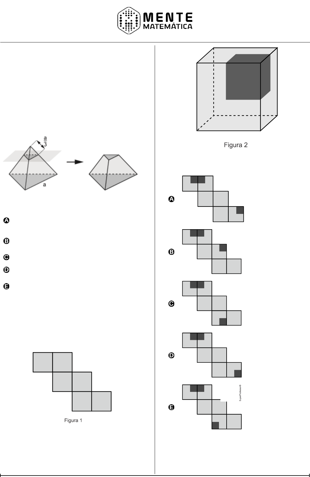 Competência 2 | Enem 495 – Versão Matemática P ág in a6 1 Questão 110 (H7 | ENEM 2019) Dificuldade 742,1 As luminárias para um laboratório de matemática serão fabricadas em forma de sólidos geométricos. Uma delas terá a forma de um tetraedro truncado. Esse sólido é gerado a partir de secções paralelas a cada uma das faces de um tetraedro regular. Para essa luminária, as secções serão feitas de maneira que, em cada corte, um terço das arestas seccionadas serão removidas. Uma dessas secções está indicada na figura. Essa luminária terá por faces 4 hexágonos regulares e 4 triângulos equiláteros. 2 hexágonos regulares e 4 triângulos equiláteros. 4 quadriláteros e 4 triângulos isósceles. 3 quadriláteros e 4 triângulos isósceles. 3 hexágonos regulares e 4 triângulos equiláteros. Questão 111 (H7 | ENEM 2022) Dificuldade 745,1 Dentre as diversas planificações possíveis para o cubo, uma delas é a que se encontra apresentada na Figura 1. Em um cubo, foram pintados, em três de suas faces, quadrados de cor cinza escura, que ocupam um quarto dessas faces, tendo esses três quadrados um vértice em comum, conforme ilustrado na Figura 2. A planificação do cubo da Figura 2, conforme o tipo de planificação apresentada na Figura 1, é
