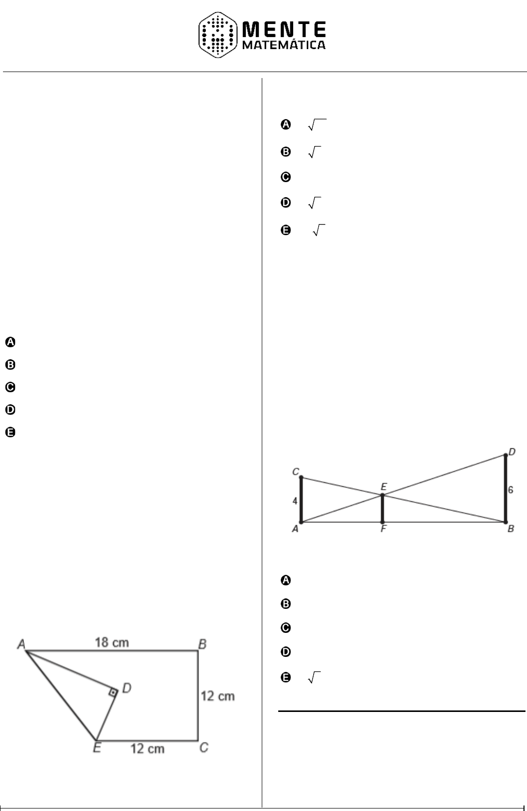 Competência 2 | Enem 495 – Versão Matemática P ág in a6 8 Questão 127 (H8 | ENEM 2022) Dificuldade 757,8 Peças metálicas de aeronaves abandonadas em aeroportos serão recicladas. Uma dessas peças é maciça e tem o formato cilíndrico, com a medida do raio da base igual a 4 cm e a da altura igual a 50 cm. Ela será derretida, e o volume de metal resultante será utilizado para a fabricação de esferas maciças com diâmetro de 1 cm, a serem usadas para confeccionar rolamentos. Para estimar a quantidade de esferas que poderão ser produzidas a partir de cada uma das peças cilíndricas, admite-se que não ocorre perda de material durante o processo de derretimento. Quantas dessas esferas poderão ser obtidas a partir de cada peça cilíndrica? 800 1 200 2 400 4 800 6 400 Questão 128 (H8 | ENEM 2019) Dificuldade 772,2 Construir figuras de diversos tipos, apenas dobrando e cortando papel, sem cola e sem tesoura, é a arte do origami (ori = dobrar; kami = papel), que tem um significado altamente simbólico no Japão. A base do origami é o conhecimento do mundo por base do tato. Uma jovem resolveu construir um cisne usando a técnica do origami, utilizando uma folha de papel de 18 cm por 12 cm. Assim, começou por dobrar a folha conforme a figura. Após essa primeira dobradura, a medida do segmento AE é 2 22 cm . 6 3 cm . 12 cm . 6 5 cm . 12 2 cm . Questão 129 (H8 | ENEM 2013) Dificuldade 787,0 O dono de um sítio pretende colocar uma haste de sustentação para melhor firmar dois postes de comprimentos iguais a 6 m e 4 m. A figura representa a situação real na qual os postes são descritos pelos segmentos AC e BD e a haste é representada pelo segmento EF, todos perpendiculares ao solo, que é indicado pelo segmento de reta AB. Os segmentos AD e BC representam cabos de aço que serão instalados. Qual deve ser o valor do comprimento da haste EF? 1 m 2 m 2,4 m 3 m 2 6 m Questão 130 (H8 | ENEM 2018) Dificuldade 789,3
