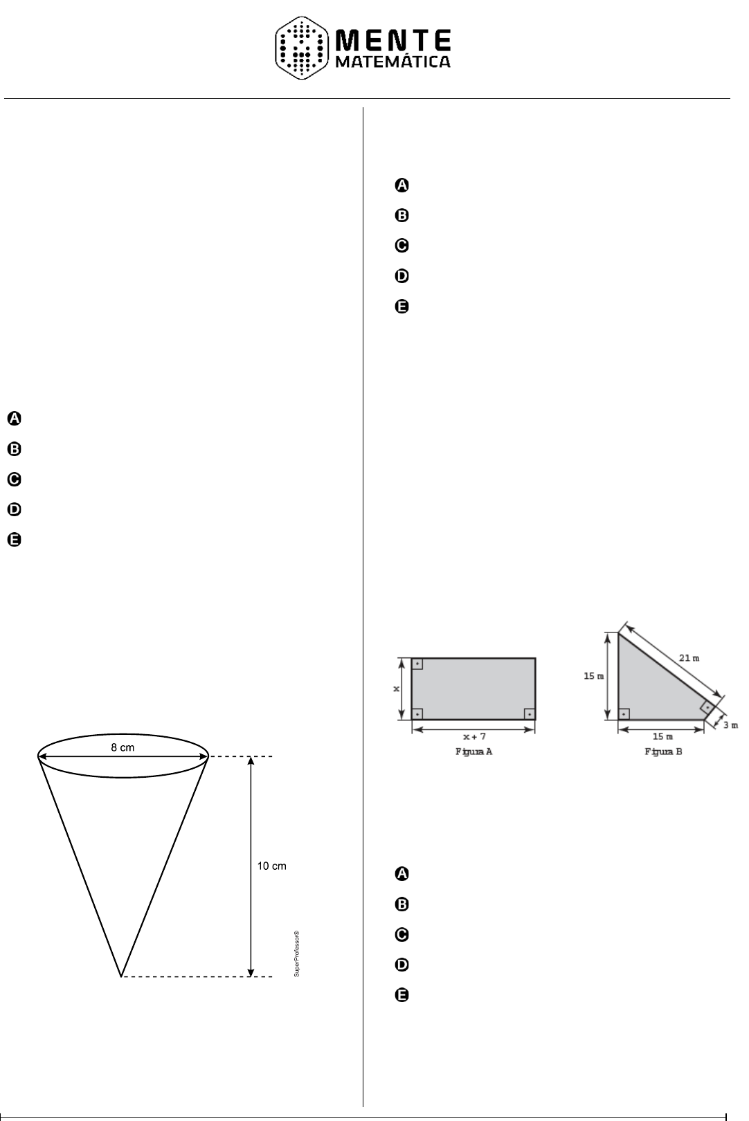Competência 3 | Enem 495 – Versão Matemática P ág in a9 8 Questão 209 (H14 | ENEM 2017) Dificuldade 744,3 Uma empresa especializada em conservação de piscinas utiliza um produto para tratamento da água cujas especificações técnicas sugerem que seja adicionado 1,5 mL desse produto para cada 1 000 L de água da piscina. Essa empresa foi contratada para cuidar de uma piscina de base retangular, de profundidade constante igual a 1,7 m, com largura e comprimento iguais a 3 me 5 m, respectivamente. O nível da lâmina d’água dessa piscina é mantido a 50 cm da borda da piscina. A quantidade desse produto, em mililitro, que deve ser adicionada a essa piscina de modo a atender às suas especificações técnicas é 11,25. 27,00. 28,80. 32,25. 49,50. Questão 210 (H14 | ENEM 2022) Dificuldade 744,8 Uma empresa produz e vende um tipo de chocolate, maciço, em formato de cone circular reto com as medidas do diâmetro da base e da altura iguais a 8 cm e 10 cm, respectivamente, como apresenta a figura. Devido a um aumento de preço dos ingredientes utilizados na produção desse chocolate, a empresa decide produzir esse mesmo tipo de chocolate com um volume 19% menor, no mesmo formato de cone circular reto com altura de 10 cm. Para isso, a empresa produzirá esses novos chocolates com medida do raio da base, em centímetro, igual a 1,52. 3,24. 3,60. 6,48. 7,20. Questão 211 (H14 | ENEM 2016) Dificuldade 746,7 Um senhor, pai de dois filhos, deseja comprar dois terrenos, com áreas de mesma medida, um para cada filho. Um dos terrenos visitados já está demarcado e, embora não tenha um formato convencional (como se observa na figura B), agradou ao filho mais velho e, por isso, foi comprado. O filho mais novo possui um projeto arquitetônico de uma casa que quer construir, mas, para isso, precisa de um terreno na forma retangular (como mostrado na Figura A) cujo comprimento seja 7 m maior do que a largura. Para satisfazer o filho mais novo, esse senhor precisa encontrar um terreno retangular cujas medidas, em metro, do comprimento e da largura sejam iguais, respectivamente, a 7,5 e 14,5. 9,0 e 16,0. 9,3 e 16,3. 10,0 e 17,0. 13,5 e 20,5.