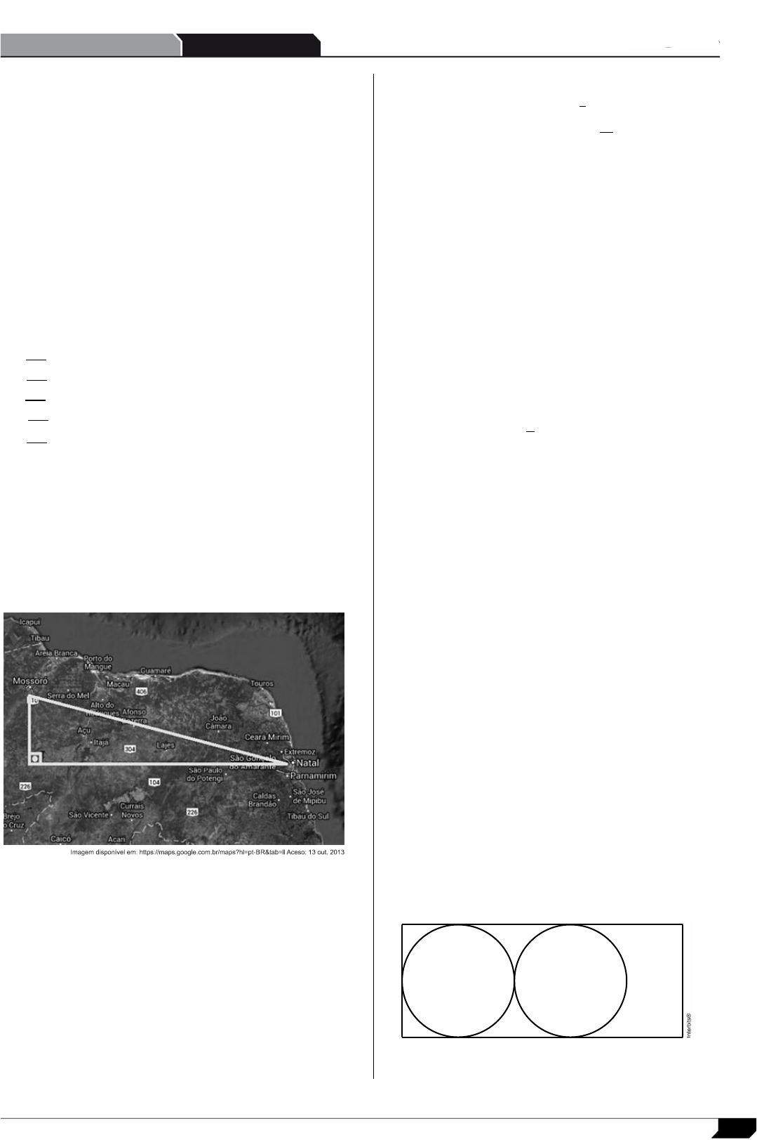 CURSO VASCO VASCONCELOS DESAFIO DOS 100 DIAS 247 do desafio fincou, paralelamente a esse mastro, um bas- tão de 1m. Medindo-se as sombras projetadas no chão pelo bastão e pelo pau, ele encontrou, respectiva- mente, 25 dm e 125 dm. Portanto, a altura do “pau de sebo”, em metros, é a) 5,0. b) 5,5. c) 6,0. d) 6,5. 6. Cada pneu traseiro de um trator tem raio 0,8𝑚 e cada pneu dianteiro tem raio 0,3𝑚. Sabendo-se que a distância entre os pontos 𝐴 e 𝐵, onde esses pneus to- cam o solo plano, é de 2,5𝑚, a distância 𝑥 entre os cen- tros dos pneus é de: a) √6,2𝑚 b) √6,3𝑚 c) √6,4𝑚 d) √6,5𝑚 e) √6,6𝑚 7. O município de Mossoró, no estado do Rio Grande do Norte é o maior produtor de sal marinho do Brasil. Esse sal é transportado, por meio terrestre, até a capital do estado, Natal, que fica a, aproximadamente, 200 𝑘𝑚 a leste e 150 𝑘𝑚 ao sul da cidade de Mossoró, de acordo com mapa abaixo: Com base em seus conhecimentos de geometria, é COR- RETO afirmar que a distância em linha reta entre as ci- dades de Mossoró e de Natal, em 𝑘𝑚, é de: a) 70 b) 500 c) 450 d) 350 e) 250 8. O plantio da grama de um campo de futebol retan- gular foi dividido entre três empresas. A primeira em- presa ficou responsável por 4 7 da área total, a segunda empresa ficou responsável por 3 10 da área total e a úl- tima empresa pelos 900 𝑚2 restantes. Sabendo--se que o comprimento do campo mede 100 m, sua largura é a) 66 m. b) 68 m. c) 70 m. d) 72 m. e) 74 m. 9. Analise a situação a seguir: Um arquiteto foi contra- tado para decorar a entrada de um templo religioso, no formato de um triângulo equilátero, com uma porta de madeira, cujas dimensões medem 1,05𝑚 por 2,5𝑚, in- serida neste triângulo. Sabe-se ainda que a altura do tri- ângulo mede 4,25𝑚 e que a área da porta não receberá decoração. A área, em metros quadrados, a ser deco- rada é igual a (𝑢𝑠𝑒√3 = 1,7). a) 10,0. b) 9,5. c) 8,5. d) 8,0. e) 7,0. 10. Durante uma manifestação, os participantes ocu- param uma avenida de 18𝑚 de largura numa extensão de 1,5𝑘𝑚. Considerando-se uma taxa de ocupação de 1,5 pessoas por 𝑚2, podemos estimar que o número de participantes dessa manifestação foi de aproximada- mente: a) 70 mil b) 60 mil c) 40 mil d) 30 mil e) 50 mil Gabarito: Resposta da questão 1: [C] Considere a figura, em que estão indicadas duas possí- veis posições do esguicho. A área que não será molhada é igual a