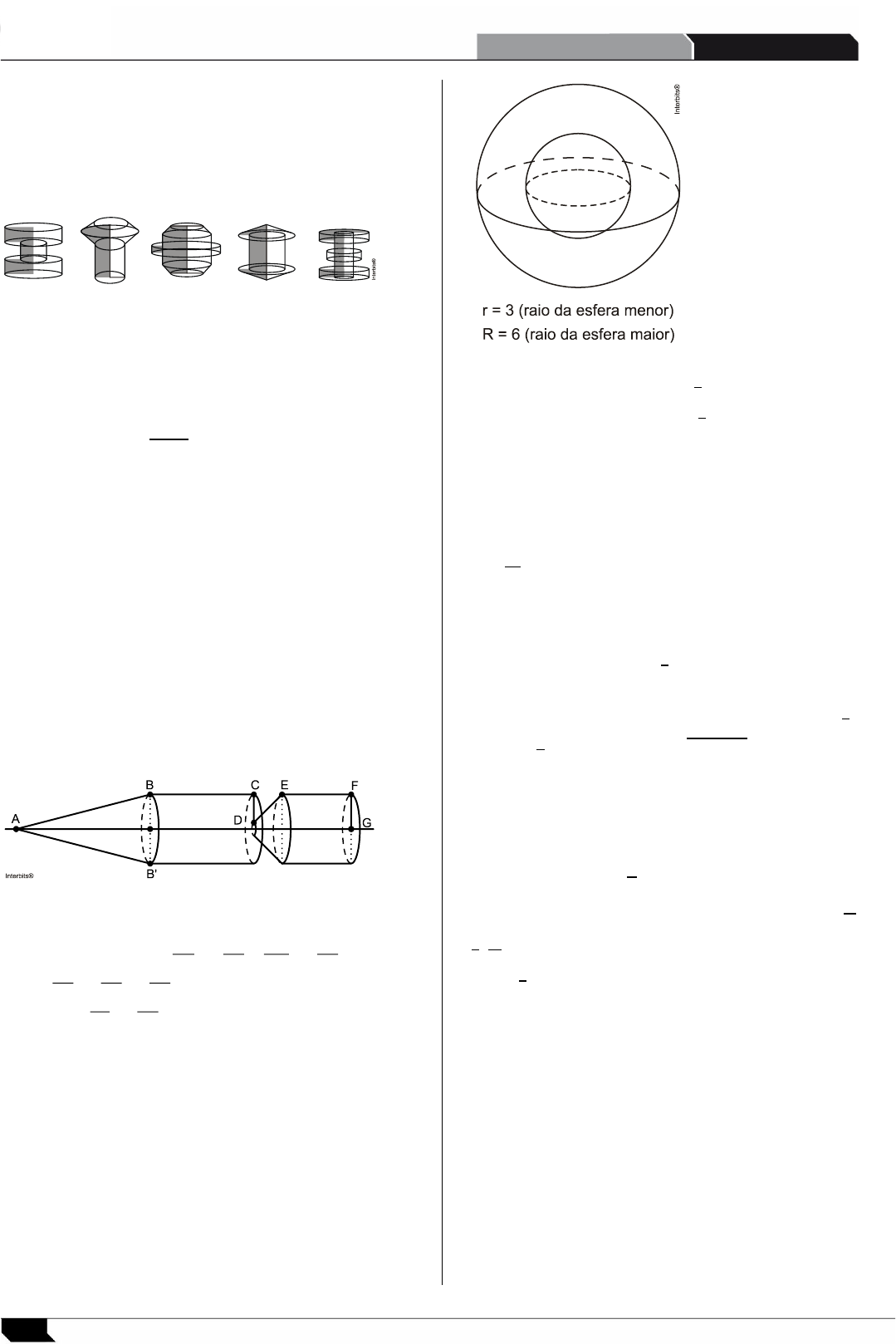 252 CURSO VASCO VASCONCELOS DESAFIO DOS 100 DIAS Gabarito: Resposta da questão 1: [D] A alternativa [D] é a correta. Observe as figuras a seguir: Resposta da questão 2: [D] O volume de água a ser escoado da câmara é de 200 ⋅ 17 ⋅ 20 = 68.000 𝑚3. Logo, como a vazão de escoa- mento é 4.200 𝑚3 por minuto, segue que uma embar- cação leva cerca de 68000 4200 ≅ 16 minutos para descer do nível mais alto até o nível da jusante. Resposta da questão 3: [B] O volume e a altura do cilindro são diretamente propor- cionais. Desse modo, uma economia de 10% da capaci- dade corresponde a 10% da altura do reservatório, isto é, 10% ⋅ 600 = 60𝑐𝑚. Resposta da questão 4: [C] Girando a forma em torno do arame rígido, obtemos a figura abaixo. Portanto, a decomposição do foguete, no sentido da ponta para a cauda, é formada pela seguinte sequência de sólidos: cone reto cilindro reto tronco de cone e cilindro equilátero Resposta da questão 5: [C] Volume da esfera maior: 𝑉 = 4 3 𝜋 ⋅ 63 = 288𝜋𝑐𝑚3 Volume da esfera menor: 𝑣 = 4 3 𝜋 ⋅ 33 = 36𝜋𝑐𝑚3 Volume da camada de gelo: 𝑉 − 𝑣 = 252𝜋𝑐𝑚3 Resposta da questão 6: [A] O volume do objeto é dado por 𝜋 ⋅ ( 20 2 ) 2 ⋅ 10 = 1.000𝜋 𝑐𝑚3. Resposta da questão 7: [D] O artesão disporá de 8 ⋅ 4 3 ⋅ 𝜋 ⋅ 103 𝑐𝑚3 de material ao derreter 8 esferas menores. Com esse material ele poderá construir uma esfera de raio 𝑟, tal que 4 3 ⋅ 𝜋 ⋅ 𝑟3 = 8 ⋅ 4 3 ⋅ 𝜋 ⋅ 103 ⇔ 𝑟 = √23 ⋅ 1033 ⇔ 𝑟 = 20𝑐𝑚. Resposta da questão 8: [E] A área total a ser pintada é dada por 4000 ⋅ 𝜋 ⋅ 1 2 ⋅ 1 ≅ 4000 ⋅ 3,14 𝑚2. Portanto, como o rendimento da tinta é 200 𝑔 𝑚 2 = 1 5 kg 𝑚 2 , segue que o consumo mensal de tinta é 4000 ⋅ 3,14 ⋅ 1 5 = 2.512 𝑘𝑔 ≅ 2,5 ton. Resposta da questão 9: [A] O volume da caixa é dado pela expressão (30 − 2𝑥)(24 − 2𝑥)𝑥 = (4𝑥2 − 108𝑥 + 720)𝑥. Resposta da questão 10: [D] Sabendo que cada livro possui 12 cm de largura, e que as caixas terão duas pilhas de livros, segue que as ares- tas das caixas medem 2 ⋅ 12 = 24𝑐𝑚. Logo, como a es- pessura de cada livro é 3 cm, temos que cada pilha terá (AB 4FG BB' 2FG),= = (BC 3FG 2FG),= (EF 2FG).=