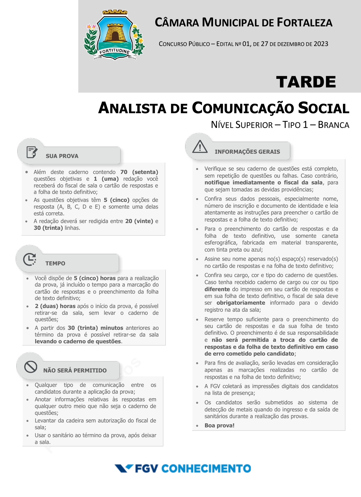 pcimarkpci MDAwMDowMDAwOjAwMDA6MDAwMDowMDAwOmZmZmY6YjEzMzo0YWVk:RnJpLCAyNSBPY3QgMjAyNCAwMDoyNjo1MCAtMDMwMA== www.pciconcursos.com.br CÂMARA MUNICIPAL DE FORTALEZA CONCURSO PÚBLICO – EDITAL Nº 01, DE 27 DE DEZEMBRO DE 2023 TARDE ANALISTA DE COMUNICAÇÃO SOCIAL NÍVEL SUPERIOR – TIPO 1 – BRANCA Além deste caderno contendo 70 (setenta) questões objetivas e 1 (uma) redação você receberá do fiscal de sala o cartão de respostas e a folha de texto definitivo; As questões objetivas têm 5 (cinco) opções de resposta (A, B, C, D e E) e somente uma delas está correta. A redação deverá ser redigida entre 20 (vinte) e 30 (trinta) linhas. Você dispõe de 5 (cinco) horas para a realização da prova, já incluído o tempo para a marcação do cartão de respostas e o preenchimento da folha de texto definitivo; 2 (duas) horas após o início da prova, é possível retirar-se da sala, sem levar o caderno de questões; A partir dos 30 (trinta) minutos anteriores ao término da prova é possível retirar-se da sala levando o caderno de questões. Qualquer tipo de comunicação entre os candidatos durante a aplicação da prova; Anotar informações relativas às respostas em qualquer outro meio que não seja o caderno de questões; Levantar da cadeira sem autorização do fiscal de sala; Usar o sanitário ao término da prova, após deixar a sala. Verifique se seu caderno de questões está completo, sem repetição de questões ou falhas. Caso contrário, notifique imediatamente o fiscal da sala, para que sejam tomadas as devidas providências; Confira seus dados pessoais, especialmente nome, número de inscrição e documento de identidade e leia atentamente as instruções para preencher o cartão de respostas e a folha de texto definitivo; Para o preenchimento do cartão de respostas e da folha de texto definitivo, use somente caneta esferográfica, fabricada em material transparente, com tinta preta ou azul; Assine seu nome apenas no(s) espaço(s) reservado(s) no cartão de respostas e na folha de texto definitivo; Confira seu cargo, cor e tipo do caderno de questões. Caso tenha recebido caderno de cargo ou cor ou tipo diferente do impresso em seu cartão de respostas e em sua folha de texto definitivo, o fiscal de sala deve ser obrigatoriamente informado para o devido registro na ata da sala; Reserve tempo suficiente para o preenchimento do seu cartão de respostas e da sua folha de texto definitivo. O preenchimento é de sua responsabilidade e não será permitida a troca do cartão de respostas e da folha de texto definitivo em caso de erro cometido pelo candidato; Para fins de avaliação, serão levadas em consideração apenas as marcações realizadas no cartão de respostas e na folha de texto definitivo; A FGV coletará as impressões digitais dos candidatos na lista de presença; Os candidatos serão submetidos ao sistema de detecção de metais quando do ingresso e da saída de sanitários durante a realização das provas. Boa prova! SUA PROVA TEMPO NÃO SERÁ PERMITIDO INFORMAÇÕES GERAIS pcimarkpci MDAwMDowMDAwOjAwMDA6MDAwMDowMDAwOmZmZmY6YjEzMzo0YWVk:RnJpLCAyNSBPY3QgMjAyNCAwMDoyNjo1MCAtMDMwMA== www.pciconcursos.com.br pcimarkpci MDAwMDowMDAwOjAwMDA6MDAwMDowMDAwOmZmZmY6YjEzMzo0YWVk:RnJpLCAyNSBPY3QgMjAyNCAwMDoyNjo1MCAtMDMwMA== www.pciconcursos.com.br CÂMARA MUNICIPAL DE FORTALEZA FGV CONHECIMENTO ANALISTA DE COMUNICAÇÃO SOCIAL – TARDE TIPO BRANCA – PÁGINA 3 CONHECIMENTOS GERAIS Língua Portuguesa 1 Uma carta (traduzida) de Van Gogh a seu irmão Théo, diz o seguinte: A respeito do Meerestille de Heine, que eu tinha copiado no teu caderno, não é? Há algum tempo atrás eu vi um quadro de Thijs Maris que me fez pensar nele. Uma velha cidade da Holanda, com fileiras de casas num castanho avermelhado com oitões em escadinha e patamares nas portas, telhados cinzas, e portas brancas ou amarelas, vãos e cornijas, canais com barcos e uma grande ponte levadiça branca sob a qual se encontra uma chata com um homem ao leme, a casinha do guarda da ponte que se vê pela janela sentado em sua pequena escrivaninha. Um pouco mais longe no canal, uma ponte de pedra sobre a qual passam pessoas e uma charrete com cavalos brancos. É movimento por toda parte; um homem com um carrinho de mão, um outro apoiado no parapeito, olhando para a água, mulheres de preto com toucas brancas. No primeiro plano, um cais com lajotas e um parapeito preto. Assinale a afirmação correta sobre esse fragmento textual. (A) Trata-se de texto basicamente descritivo, com exceção do penúltimo parágrafo, de tipo narrativo. (B) Há possíveis problemas na tradução do texto, como a ambiguidade no emprego de “nele”, no primeiro parágrafo. (C) Ocorre nítida incoerência no segmento “portas brancas ou amarelas”, no segundo parágrafo. (D) Há emprego indevido da preposição “sob” em lugar de “sobre” no segundo parágrafo. (E) A expressão “Um pouco mais longe no canal”, no terceiro parágrafo, mostra ilogicidade, pois um quadro, sendo um plano, não tem profundidade. 2 Observe a seguinte reflexão: A abelha vive fazendo cera. Sempre. E com tudo isto acontecendo, como é que a abelha consegue ser a imagem do labor incessante? Sobre a estrutura e a composição desse pensamento, assinale a afirmativa inadequada. (A) O advérbio “Sempre” é redundante, pois o verbo “viver” já indica uma ação interminável. (B) A expressão “fazendo cera” aparece nesse pensamento com duplo sentido. (C) O segmento “tudo isto” traz a ideia de uma grande quantidade de ações, sentido adequado ao contexto. (D) A forma do pronome demonstrativo “isto” deveria ser substituída por “isso”, por referir-se a um termo anterior. (E) A expressão “é que” é empregada enfaticamente, sem ligações sintáticas com os outros termos. 3 Um escritor americano deu a seguinte opinião sobre os aborígenes, ou seja, os primitivos habitantes de um país: Gente de valor escasso que