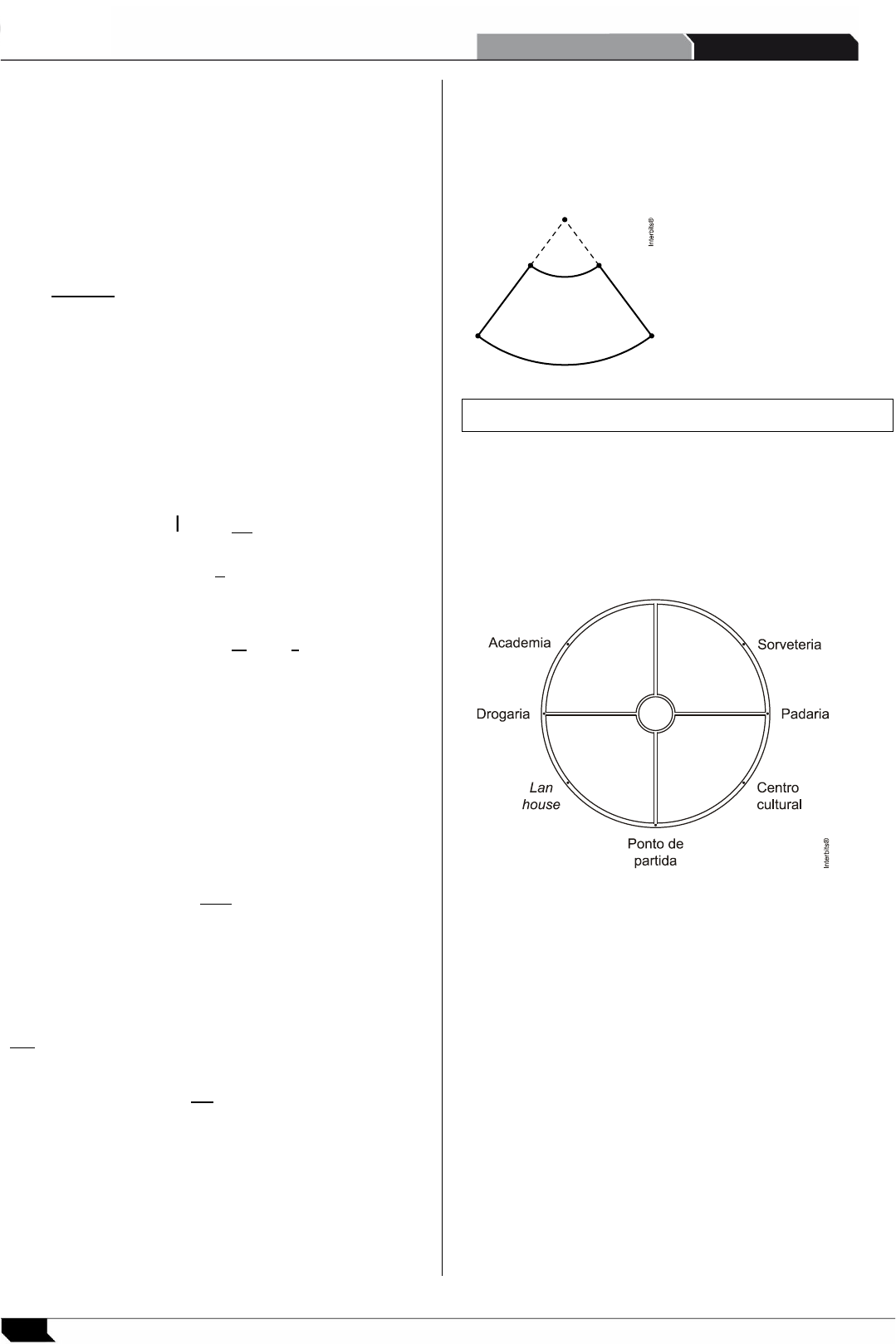 40 CURSO VASCO VASCONCELOS DESAFIO DOS 100 DIAS Desde que 1000 = 6 ⋅ 166 + 4, podemos concluir que o milésimo cliente receberá de brinde um refrigerante. Resposta da questão 4: [B] O número total de funcionários da empresa é igual a 24 + 1 + 20 + 3 = 48. Logo, a mediana corresponde à média aritmética de 622 e 1224, isto é, 𝑀𝑑 = 622+1244 2 = 𝑅$ 933,00. Resposta da questão 5: [A] Seja 𝑓: [0, 10] → [0, 10], com 𝑓(𝑥) = 𝑎𝑥2 + 𝑏𝑥 + 𝑐. Desse modo, temos | 𝑓(0) = 0 𝑓(5) = 6 𝑓(10) = 10 ⇔ | 𝑐 = 0 25𝑎 + 5𝑏 = 6 100𝑎 + 10𝑏 = 10 ⇔ | | 𝑎 = − 1 25 𝑏 = 7 5 𝑐 = 0 . Portanto, segue que 𝑓(𝑥) = − 1 25 𝑥2 + 7 5 𝑥. Resposta da questão 6: [C] O plano mais vantajoso é aquele que permite o maior tempo mensal de chamada pelo valor de 𝑅$ 30,00. Por- tanto, do gráfico, é imediato que a resposta é a proposta [𝐶]. Resposta da questão 7: [E] A sensibilidade é dada por 95 95+5 ⋅ 100% = 95%. Resposta da questão 8: [A] Como ℎ = 2 𝑚, segue-se que 𝑏 = 6 − 2 ⋅ 0,5 = 5 𝑚. Logo, segue que o volume total do silo é igual a 2 ⋅ ( 6+5 2 ) ⋅ 20 = 220 𝑚3. Em consequência, sabendo que 1 tonelada de forragem ocupa 2 𝑚3, podemos concluir que o resultado pedido é 220 2 = 110 toneladas. Resposta da questão 9: [D] O lado da folha de papel corresponde ao quíntuplo do comprimento da base do cilindro, ou seja, 5𝜋𝑑. Resposta da questão 10: [E] Lembrando que a superfície lateral de um cone é obtida a partir de um setor circular, segue-se que o objetivo do responsável pelo adesivo será alcançado se ele fizer o corte indicado na figura abaixo. TESTE 13 1. (Enem PPL 2013) Camile gosta de caminhar em uma calçada em torno de uma praça circular que possui 500 metros de extensão, localizada perto de casa. A praça, bem como alguns locais ao seu redor e o ponto de onde inicia a caminhada, estão representados na figura: Em uma tarde, Camile caminhou 4 125 metros, no sen- tido anti-horário, e parou. Qual dos locais indicados na figura é o mais próximo de sua parada? a) Centro cultural. b) Drogaria. c) Lan house. d) Ponto de partida. e) Padaria. 2. (Enem PPL 2013) O dono de uma empresa produtora de água mineral explora uma fonte de onde extrai 20 000 litros diários, os quais são armazenados em um re- servatório com volume interno de 30 m3, para serem co- locados, ao final do dia, em garrafas plásticas. Para au- mentar a produção, o empresário decide explorar tam- bém uma fonte vizinha, de onde passa a extrair outros
