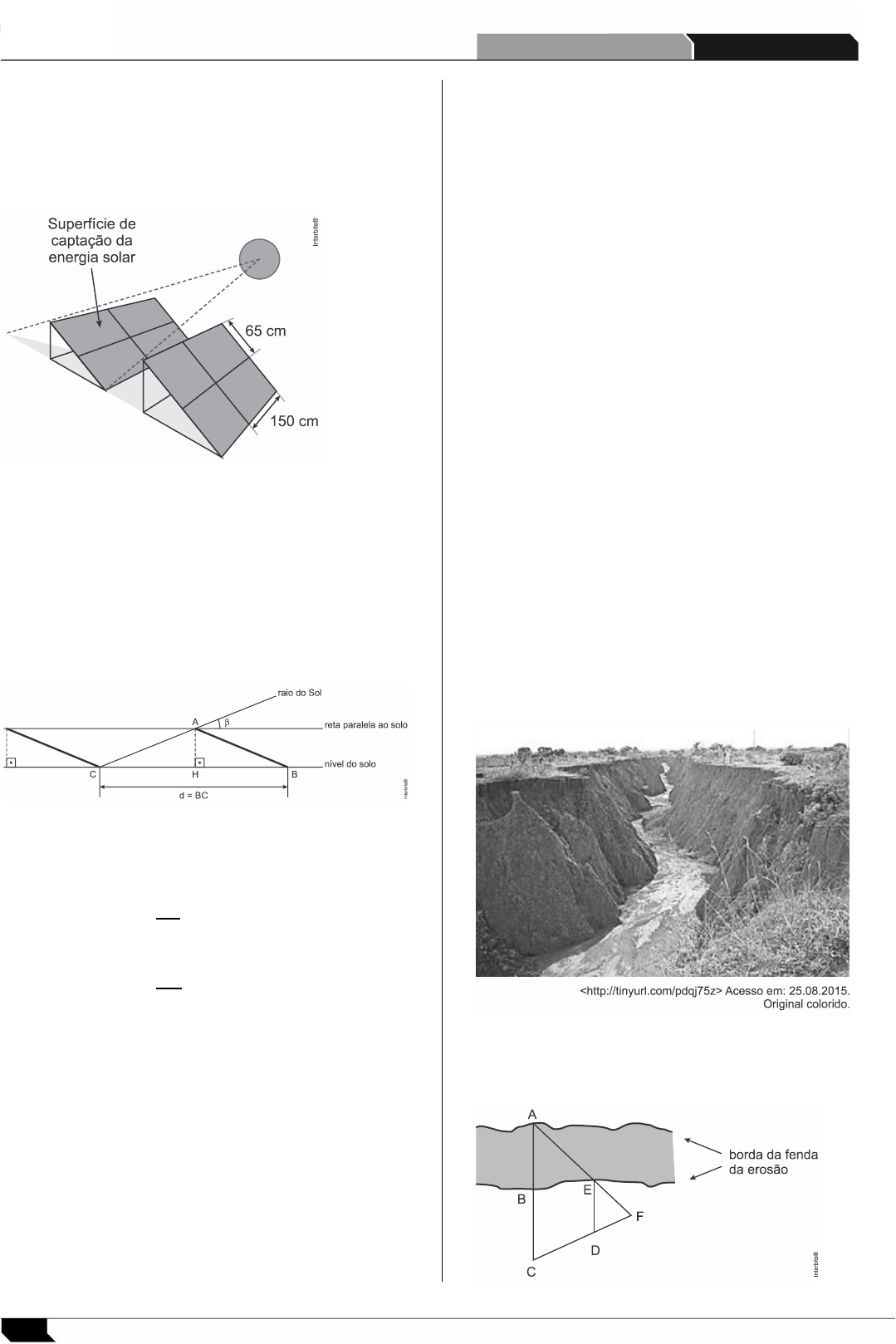 66 CURSO VASCO VASCONCELOS DESAFIO DOS 100 DIAS - os painéis deverão estar separados, de modo que um não faça sombra sobre o outro e, também, não sejam encobertos pela sombra de qualquer outro objeto; - os painéis são idênticos entre si e estão apoiados sobre o solo. No projeto descrito, a área total da superfície de capta- ção de energia solar é, em metros quadrados, a) 195. b) 185. c) 175. d) 165. e) 155. 6. A figura apresenta o modelo matemático para a de- terminação da distância mínima entre dois painéis de fi- las paralelas e adjacentes do projeto descrito. Na figura, tem-se que: 1. 𝐴: ponto que representa o topo do painel; 2. 𝐵: representa o ponto de apoio do painel no solo; 3. o segmento 𝐴𝐵 representa o painel; 4. 𝐶: representa o ponto de apoio no solo do pai- nel paralelo e mais próximo; 5. o segmento 𝐴𝐻 representa a distância do topo do painel ao solo; 6. 𝛽 representa a medida do ângulo de incidên- cia dos raios do Sol em relação ao solo*; 7. 𝑑 = 𝐵𝐶 é a distância entre os pontos 𝐵 e 𝐶. *A distância mínima entre dois painéis que estão em filas paralelas e adjacentes depende do ângulo (𝛽) de incidência solar às 12 ℎ do dia do solstício de inverno, momento em que o Sol atinge a maior declinação em latitude, medida a partir da linha do equador. Na figura, sabendo que 𝐵𝐻 = 120 𝑐𝑚 e que, no local de instalação dos painéis, 𝛽 = 21,80°, a distância mí- nima (𝑑) entre dois painéis que estão em filas paralelas e adjacentes é, em metros, Dados: 𝑠𝑒𝑛 2 1,80° ≅ 0,3714 𝑐𝑜𝑠 2 1,80° ≅ 0,9285 𝑡𝑔 2 1,80° ≅ 0,40 a) 2,35. b) 2,45. c) 2,55. d) 2,65. e) 2,75. 7. Um grupo de 8 alunos da Fatec do curso de Têxtil e Moda está prestando consultoria a 32 startups. Cada uma dessas startups é auxiliada precisamente por 3 alu- nos desse grupo, e cada aluno auxilia o mesmo número de startups. Nessas condições, a quantidade de startups que cada aluno auxilia é a) 8. b) 9. c) 10. d) 11. e) 12. 8. A erosão é o processo de desgaste, transporte e se- dimentação das rochas e, principalmente, dos solos. Ela pode ocorrer por ação de fenômenos da natureza ou do ser humano. A imagem mostra uma fenda no solo, proveniente de erosão. Para determinar a distância entre os pontos 𝐴 e 𝐵 da fenda, pode-se utilizar o modelo matemático da figura.