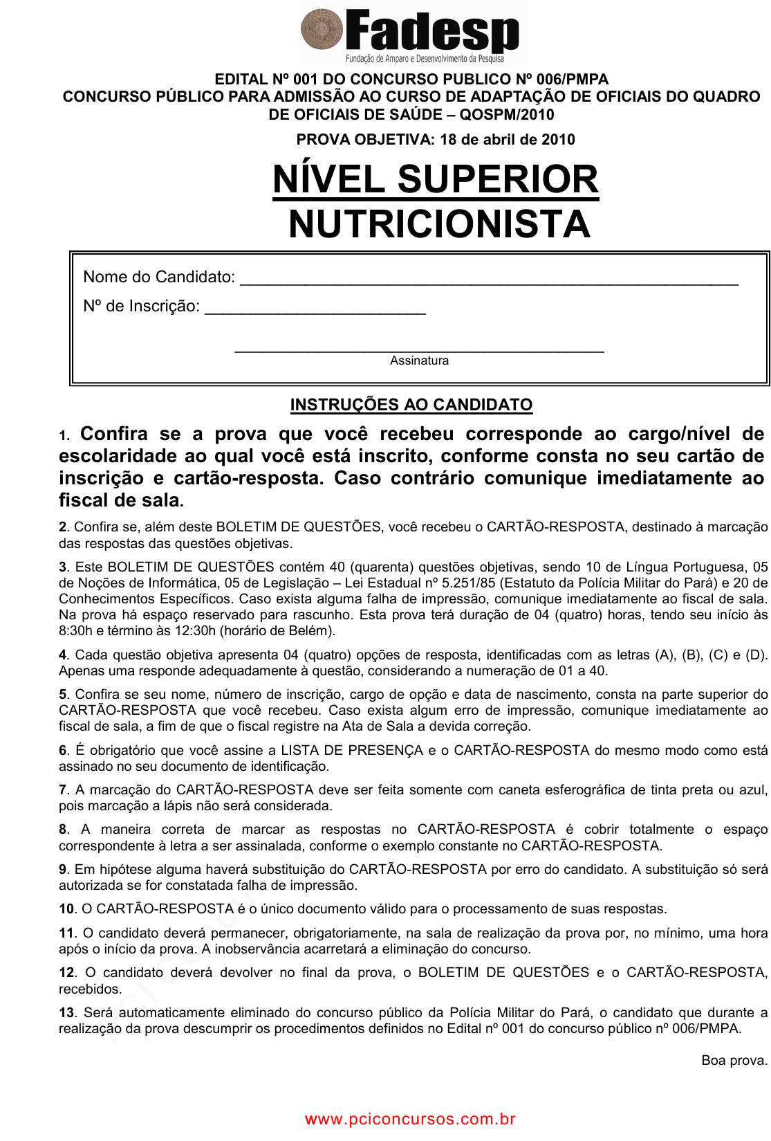 pcimarkpci MDAwMDowMDAwOjAwMDA6MDAwMDowMDAwOmZmZmY6YjEyZjpjYWI0:RnJpLCAyNSBPY3QgMjAyNCAxNjoxODoxNSAtMDMwMA== www.pciconcursos.com.br EDITAL Nº 001 DO CONCURSO PUBLICO Nº 006/PMPA CONCURSO PÚBLICO PARA ADMISSÃO AO CURSO DE ADAPTAÇÃO DE OFICIAIS DO QUADRO DE OFICIAIS DE SAÚDE – QOSPM/2010 PROVA OBJETIVA: 18 de abril de 2010 NÍVEL SUPERIOR NUTRICIONISTA INSTRUÇÕES AO CANDIDATO 1. Confira se a prova que você recebeu corresponde ao cargo/nível de escolaridade ao qual você está inscrito, conforme consta no seu cartão de inscrição e cartão-resposta. Caso contrário comunique imediatamente ao fiscal de sala. 2. Confira se, além deste BOLETIM DE QUESTÕES, você recebeu o CARTÃO-RESPOSTA, destinado à marcação das respostas das questões objetivas. 3. Este BOLETIM DE QUESTÕES contém 40 (quarenta) questões objetivas, sendo 10 de Língua Portuguesa, 05 de Noções de Informática, 05 de Legislação – Lei Estadual nº 5.251/85 (Estatuto da Polícia Militar do Pará) e 20 de Conhecimentos Específicos. Caso exista alguma falha de impressão, comunique imediatamente ao fiscal de sala. Na prova há espaço reservado para rascunho. Esta prova terá duração de 04 (quatro) horas, tendo seu início às 8:30h e término às 12:30h (horário de Belém). 4. Cada questão objetiva apresenta 04 (quatro) opções de resposta, identificadas com as letras (A), (B), (C) e (D). Apenas uma responde adequadamente à questão, considerando a numeração de 01 a 40. 5. Confira se seu nome, número de inscrição, cargo de opção e data de nascimento, consta na parte superior do CARTÃO-RESPOSTA que você recebeu. Caso exista algum erro de impressão, comunique imediatamente ao fiscal de sala, a fim de que o fiscal registre na Ata de Sala a devida correção. 6. É obrigatório que você assine a LISTA DE PRESENÇA e o CARTÃO-RESPOSTA do mesmo modo como está assinado no seu documento de identificação. 7. A marcação do CARTÃO-RESPOSTA deve ser feita somente com caneta esferográfica de tinta preta ou azul, pois marcação a lápis não será considerada. 8. A maneira correta de marcar as respostas no CARTÃO-RESPOSTA é cobrir totalmente o espaço correspondente à letra a ser assinalada, conforme o exemplo constante no CARTÃO-RESPOSTA. 9. Em hipótese alguma haverá substituição do CARTÃO-RESPOSTA por erro do candidato. A substituição só será autorizada se for constatada falha de impressão. 10. O CARTÃO-RESPOSTA é o único documento válido para o processamento de suas respostas. 11. O candidato deverá permanecer, obrigatoriamente, na sala de realização da prova por, no mínimo, uma hora após o início da prova. A inobservância acarretará a eliminação do concurso. 12. O candidato deverá devolver no final da prova, o BOLETIM DE QUESTÕES e o CARTÃO-RESPOSTA, recebidos. 13. Será automaticamente eliminado do concurso público da Polícia Militar do Pará, o candidato que durante a realização da prova descumprir os procedimentos definidos no Edital nº 001 do concurso público nº 006/PMPA. Boa prova. Nome do Candidato: ______________________________________________________ Nº de Inscrição: ________________________ ________________________________________ Assinatura www.pciconcursos.com.br www.pciconcursos.com.br pcimarkpci MDAwMDowMDAwOjAwMDA6MDAwMDowMDAwOmZmZmY6YjEyZjpjYWI0:RnJpLCAyNSBPY3QgMjAyNCAxNjoxODoxNSAtMDMwMA== www.pciconcursos.com.br 2 www.pciconcursos.com.br www.pciconcursos.com.br pcimarkpci MDAwMDowMDAwOjAwMDA6MDAwMDowMDAwOmZmZmY6YjEyZjpjYWI0:RnJpLCAyNSBPY3QgMjAyNCAxNjoxODoxNSAtMDMwMA== www.pciconcursos.com.br 3 LÍNGUA PORTUGUESA TEXTO 1 – QUESTÕES 01 a 06 Um país diante da barbárie Marcelo O. Dantas 1 2 3 4 5 6 7 8 9 10 11 12 13 14 15 16 17 18 19 20 21 22 Em sua formulação clássica, o grego Aristóteles define “virtude” como a capacidade de adotar posturas equilibradas diante de opções extremas e radicalmente opostas. Longe de constituir mero expediente conciliador, este meio termo requer do homem virtuoso lucidez e fibra, do contrário será incapaz de sobrepor-se às forças dilacerantes da desrazão. Confrontado com a crise da violência, nosso país ignora a lição e vai-se dividindo entre os que defendem o recrudescimento das medidas repressivas e os que advogam a ampliação das políticas sociais. Semelhante impasse, além de improdutivo, baseia-se numa falsa antinomia. O combate ao crime e a promoção do bem-estar, quando implementados de forma correta, são estratégias que se complementam e se legitimam. As políticas sociais – entendidas em seu aspecto mais amplo – atuam no campo da profilaxia, oferecendo opções de vida ao cidadão adulto e ao jovem que se forma. O sistema penal, por sua vez, visa dissuadir o indivíduo a cometer crimes, ao mesmo tempo em que regula a punição dos infratores. Desacompanhado de políticas sociais, semelhante sistema torna-se facilmente instrumento de tirania e de perpetuação da desigualdade. Em contrapartida, quando aplicadas em um ambiente de permissividade criminal e falência da justiça, as políticas sociais perdem por completo sua capacidade de prevenir o aumento da violência. Nos últimos anos, o Brasil avançou imensamente na área social, e nem por isso a crise da segurança arrefeceu. Faltou à equação o poder dissuasivo da lei. http://nominimo.ig.com.br/notitia/servlet/newstorm.notitia.presentation.NavigationServlet?publicationCode=1&pageCode=15&text Code=25468&date=currentDate&contentType=html [com adaptações] 01. No texto “Um país diante da barbárie”, o propósito maior de Marcelo Dantas é (A) informar o leitor sobre a crise da violência no Brasil. (B) criticar o recrudescimento das medidas repressivas. (C) apontar as características do homem virtuoso e lúcido. (D) defender a simetria entre políticas sociais e combate ao crime. 02. O enunciado que melhor sintetiza o pensamento do autor é (A) “O sistema penal, ao regular a punição de infratores