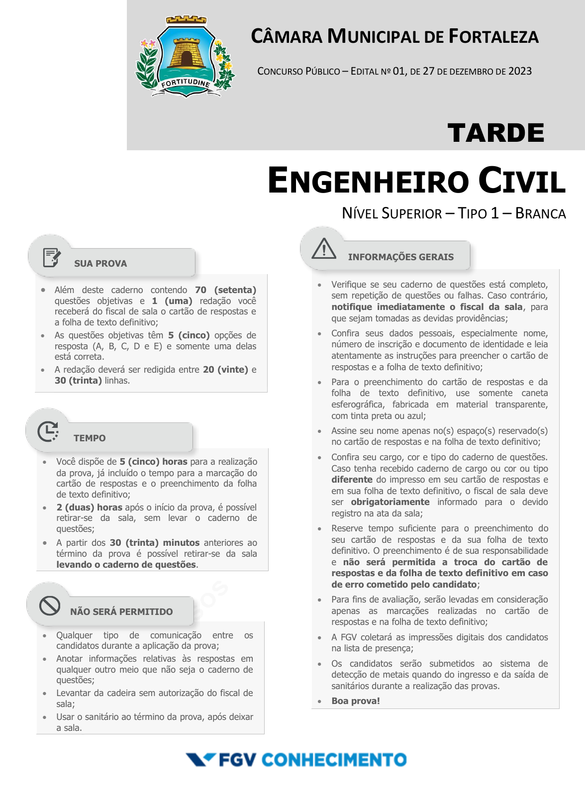 pcimarkpci MDAwMDowMDAwOjAwMDA6MDAwMDowMDAwOmZmZmY6YjEzMzo0OTgw:RnJpLCAyNSBPY3QgMjAyNCAxNTo0ODo0NiAtMDMwMA== www.pciconcursos.com.br CÂMARA MUNICIPAL DE FORTALEZA CONCURSO PÚBLICO – EDITAL Nº 01, DE 27 DE DEZEMBRO DE 2023 TARDE ENGENHEIRO CIVIL | NÍVEL SUPERIOR – TIPO 1 – BRANCA Além deste caderno contendo 70 (setenta) questões objetivas e 1 (uma) redação você receberá do fiscal de sala o cartão de respostas e a folha de texto definitivo; As questões objetivas têm 5 (cinco) opções de resposta (A, B, C, D e E) e somente uma delas está correta. A redação deverá ser redigida entre 20 (vinte) e 30 (trinta) linhas. Você dispõe de 5 (cinco) horas para a realização da prova, já incluído o tempo para a marcação do cartão de respostas e o preenchimento da folha de texto definitivo; 2 (duas) horas após o início da prova, é possível retirar-se da sala, sem levar o caderno de questões; A partir dos 30 (trinta) minutos anteriores ao término da prova é possível retirar-se da sala levando o caderno de questões. Qualquer tipo de comunicação entre os candidatos durante a aplicação da prova; Anotar informações relativas às respostas em qualquer outro meio que não seja o caderno de questões; Levantar da cadeira sem autorização do fiscal de sala; Usar o sanitário ao término da prova, após deixar a sala. Verifique se seu caderno de questões está completo, sem repetição de questões ou falhas. Caso contrário, notifique imediatamente o fiscal da sala, para que sejam tomadas as devidas providências; Confira seus dados pessoais, especialmente nome, número de inscrição e documento de identidade e leia atentamente as instruções para preencher o cartão de respostas e a folha de texto definitivo; Para o preenchimento do cartão de respostas e da folha de texto definitivo, use somente caneta esferográfica, fabricada em material transparente, com tinta preta ou azul; Assine seu nome apenas no(s) espaço(s) reservado(s) no cartão de respostas e na folha de texto definitivo; Confira seu cargo, cor e tipo do caderno de questões. Caso tenha recebido caderno de cargo ou cor ou tipo diferente do impresso em seu cartão de respostas e em sua folha de texto definitivo, o fiscal de sala deve ser obrigatoriamente informado para o devido registro na ata da sala; Reserve tempo suficiente para o preenchimento do seu cartão de respostas e da sua folha de texto definitivo. O preenchimento é de sua responsabilidade e não será permitida a troca do cartão de respostas e da folha de texto definitivo em caso de erro cometido pelo candidato; Para fins de avaliação, serão levadas em consideração apenas as marcações realizadas no cartão de respostas e na folha de texto definitivo; A FGV coletará as impressões digitais dos candidatos na lista de presença; Os candidatos serão submetidos ao sistema de detecção de metais quando do ingresso e da saída de sanitários durante a realização das provas. Boa prova! SUA PROVA TEMPO NÃO SERÁ PERMITIDO INFORMAÇÕES GERAIS pcimarkpci MDAwMDowMDAwOjAwMDA6MDAwMDowMDAwOmZmZmY6YjEzMzo0OTgw:RnJpLCAyNSBPY3QgMjAyNCAxNTo0ODo0NiAtMDMwMA== www.pciconcursos.com.br pcimarkpci MDAwMDowMDAwOjAwMDA6MDAwMDowMDAwOmZmZmY6YjEzMzo0OTgw:RnJpLCAyNSBPY3QgMjAyNCAxNTo0ODo0NiAtMDMwMA== www.pciconcursos.com.br CÂMARA MUNICIPAL DE FORTALEZA FGV CONHECIMENTO ENGENHEIRO CIVIL – TARDE TIPO BRANCA – PÁGINA 3 CONHECIMENTOS GERAIS Língua Portuguesa 1 Uma carta (traduzida) de Van Gogh a seu irmão Théo, diz o seguinte: A respeito do Meerestille de Heine, que eu tinha copiado no teu caderno, não é? Há algum tempo atrás eu vi um quadro de Thijs Maris que me fez pensar nele. Uma velha cidade da Holanda, com fileiras de casas num castanho avermelhado com oitões em escadinha e patamares nas portas, telhados cinzas, e portas brancas ou amarelas, vãos e cornijas, canais com barcos e uma grande ponte levadiça branca sob a qual se encontra uma chata com um homem ao leme, a casinha do guarda da ponte que se vê pela janela sentado em sua pequena escrivaninha. Um pouco mais longe no canal, uma ponte de pedra sobre a qual passam pessoas e uma charrete com cavalos brancos. É movimento por toda parte; um homem com um carrinho de mão, um outro apoiado no parapeito, olhando para a água, mulheres de preto com toucas brancas. No primeiro plano, um cais com lajotas e um parapeito preto. Assinale a afirmação correta sobre esse fragmento textual. (A) Trata-se de texto basicamente descritivo, com exceção do penúltimo parágrafo, de tipo narrativo. (B) Há possíveis problemas na tradução do texto, como a ambiguidade no emprego de “nele”, no primeiro parágrafo. (C) Ocorre nítida incoerência no segmento “portas brancas ou amarelas”, no segundo parágrafo. (D) Há emprego indevido da preposição “sob” em lugar de “sobre” no segundo parágrafo. (E) A expressão “Um pouco mais longe no canal”, no terceiro parágrafo, mostra ilogicidade, pois um quadro, sendo um plano, não tem profundidade. 2 Observe a seguinte reflexão: A abelha vive fazendo cera. Sempre. E com tudo isto acontecendo, como é que a abelha consegue ser a imagem do labor incessante? Sobre a estrutura e a composição desse pensamento, assinale a afirmativa inadequada. (A) O advérbio “Sempre” é redundante, pois o verbo “viver” já indica uma ação interminável. (B) A expressão “fazendo cera” aparece nesse pensamento com duplo sentido. (C) O segmento “tudo isto” traz a ideia de uma grande quantidade de ações, sentido adequado ao contexto. (D) A forma do pronome demonstrativo “isto” deveria ser substituída por “isso”, por referir-se a um termo anterior. (E) A expressão “é que” é empregada enfaticamente, sem ligações sintáticas com os outros termos. 3 Um escritor americano deu a seguinte opinião sobre os aborígenes, ou seja, os primitivos habitantes de um país: Gente de valor escasso que atravanca o solo de um país 
