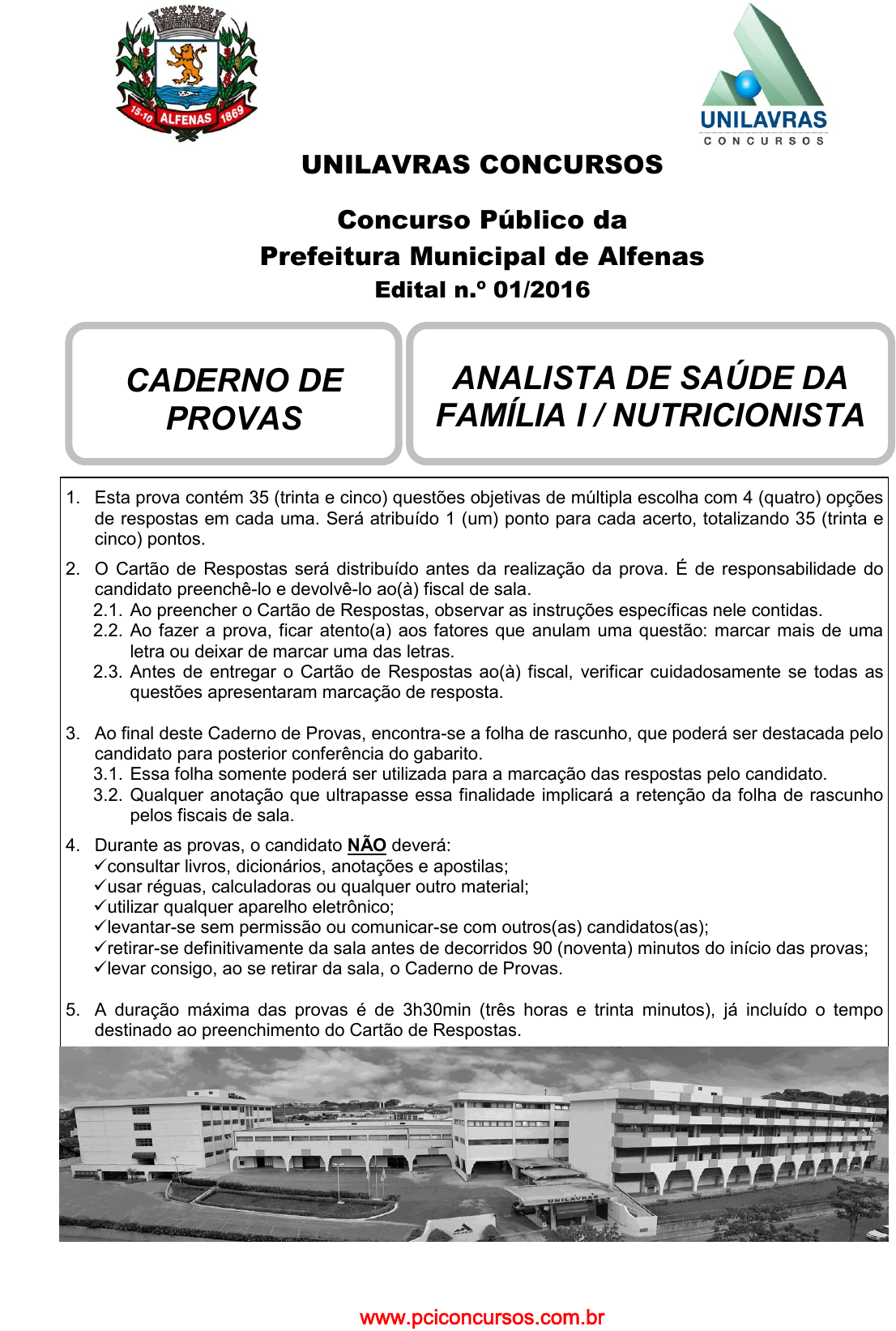 pcimarkpci MDAwMDowMDAwOjAwMDA6MDAwMDowMDAwOmZmZmY6YjEyZjpjYWI0:RnJpLCAyNSBPY3QgMjAyNCAxNzoxNjo0NSAtMDMwMA== www.pciconcursos.com.br UNILAVRAS CONCURSOS Concurso Público da Prefeitura Municipal de Alfenas Edital n.º 01/2016 CADERNO DE PROVAS ANALISTA DE SAÚDE DA FAMÍLIA I / NUTRICIONISTA 1. Esta prova contém 35 (trinta e cinco) questões objetivas de múltipla escolha com 4 (quatro) opções de respostas em cada uma. Será atribuído 1 (um) ponto para cada acerto, totalizando 35 (trinta e cinco) pontos. 2. O Cartão de Respostas será distribuído antes da realização da prova. É de responsabilidade do candidato preenchê-lo e devolvê-lo ao(à) fiscal de sala. 2.1. Ao preencher o Cartão de Respostas, observar as instruções específicas nele contidas. 2.2. Ao fazer a prova, ficar atento(a) aos fatores que anulam uma questão: marcar mais de uma letra ou deixar de marcar uma das letras. 2.3. Antes de entregar o Cartão de Respostas ao(à) fiscal, verificar cuidadosamente se todas as questões apresentaram marcação de resposta. 3. Ao final deste Caderno de Provas, encontra-se a folha de rascunho, que poderá ser destacada pelo candidato para posterior conferência do gabarito. 3.1. Essa folha somente poderá ser utilizada para a marcação das respostas pelo candidato. 3.2. Qualquer anotação que ultrapasse essa finalidade implicará a retenção da folha de rascunho pelos fiscais de sala. 4. Durante as provas, o candidato NÃO deverá: consultar livros, dicionários, anotações e apostilas; usar réguas, calculadoras ou qualquer outro material; utilizar qualquer aparelho eletrônico; levantar-se sem permissão ou comunicar-se com outros(as) candidatos(as); retirar-se definitivamente da sala antes de decorridos 90 (noventa) minutos do início das provas; levar consigo, ao se retirar da sala, o Caderno de Provas. 5. A duração máxima das provas é de 3h30min (três horas e trinta minutos), já incluído o tempo destinado ao preenchimento do Cartão de Respostas. www.pciconcursos.com.br pcimarkpci MDAwMDowMDAwOjAwMDA6MDAwMDowMDAwOmZmZmY6YjEyZjpjYWI0:RnJpLCAyNSBPY3QgMjAyNCAxNzoxNjo0NSAtMDMwMA== www.pciconcursos.com.br UNILAVRAS Concursos ANALISTA DE SAÚDE DA FAMÍLIA I / NUTRICIONISTA – 3 – Língua Portuguesa QUESTÃO 1) Mia Couto, escritor moçambi- cano, é autor de Um rio chamado tempo, uma casa chamada terra, cuja capa é possível visualizar na imagem abaixo. https://books.google.com.br/books?id=GXl4YZMFc0UC&pg=P T4&hl=pt-R&source=gbs_toc_r&cad=3#v=onepage&q&f=false A figura de linguagem que caracteriza o título é A) hipérbole. B) metonímia. C) metáfora. D) inversão. QUESTÃO 2) O texto abaixo é um extrato do livro mencionado acima. Leia-o: Mas a vila é ainda demasiado rural, falta-lhe a geometria dos espaços arrumados. Lá estão os coqueiros, os corvos, as lentas fogueiras que começam a despontar. As casas de cimento estão em ruína, exaustas de tanto abandono. Não são apenas casas destroçadas: é o próprio tempo desmoronado. Ainda vejo numa parede o letreiro já sujo pelo tempo: “A nossa terra será o túmulo do capitalismo”. Na guerra, tivera visões que não queria repetir. Como se essas lembranças viessem de uma parte de mim já morta. https://books.google.com.br/books?id=GXl4YZMFc0UC&pg=P T4&hl=pt-R&source=gbs_toc_r&cad=3#v=onepage&q&f=false Sobre o trecho, é CORRETO afirmar que se trata de: A) narração. B) injunção. C) descrição. D) interação. QUESTÃO 3) Leia a tira a seguir: https://omundoeumaescola.wordpress.com/tag/educacao-em- casa/ Pode-se inferir que, além do cunho humorístico, a tira critica A) a maneira como as crianças enxergam o mundo. B) a nova maneira como as crianças estão sendo educadas no mundo atual. C) o ócio infantil no mundo atual. D) as inquisições infantis. QUESTÃO 4) No dia 6/5/2016, o Globo Repórter apresentou em sua programação a rotina de alguns dos atletas olímpicos. O judoca Rafael Silva, o “Baby”, foi um deles. Ao ser entrevistada, Bruna Gonçalves, sua namorada, falou sobre sua felicidade quando o namorado “medalhou”. Ao usar o termo em destaque, um verbo a partir de um substantivo, Bruna fez uso de um A) neologismo. B) idiomismo. C) estrangeirismo. D) substantivismo. QUESTÃO 5) Na sequência, encontra-se um pequeno recorte do livro da jornalista gaúcha Eliane Brum, Meus Desacontecimentos: a história da minha vida com as palavras, publicado pela editora Leya. “Sempre vou temer o retorno da escuridão, que para mim é o mundo sem palavras. (Sempre e nunca, palavras totalizantes que sentam sobre as minhas frases. Proibidas no jornalismo, porque impossíveis. Em mim, elas dão conta de uma dramaticidade. Morrer sempre. Morrer nunca. Anulam-se as oposições e instala-se o drama.)” http://lelivros.online/book/baixar-livro-meus-desacontecimentos- eliane-brum-em-pdf-epub-e-mobi/#forward www.pciconcursos.com.br pcimarkpci MDAwMDowMDAwOjAwMDA6MDAwMDowMDAwOmZmZmY6YjEyZjpjYWI0:RnJpLCAyNSBPY3QgMjAyNCAxNzoxNjo0NSAtMDMwMA== www.pciconcursos.com.br UNILAVRAS Concursos ANALISTA DE SAÚDE DA FAMÍLIA I / NUTRICIONISTA – 4 – O termo “elas”, extraído do texto, é um pronome A) pessoal do caso reto. B) pessoal do caso oblíquo. C) de tratamento. D) impessoal. QUESTÃO 6) Ainda sobre o texto acima, de Eliane Brum, pode-se afirmar que o pronome “elas” retoma o termo A) totalizantes. B) oposições. C) impossíveis. D) palavras. QUESTÃO 7) Ainda sobre o termo “elas”, é possível afirmar que seu uso visa fazer a A) retomada pronominal anafórica, pois retoma um termo já mencionado. B) retomada pronominal anafórica, pois introduz um termo novo ao texto. C) retomada pronominal catafórica, pois retoma um termo já mencionado. D) retomada não pronominal. QUESTÃO 8) Observe o texto “Receita do Amor”. Pode-se observar nele http://popfixonline.com.br/media/catalog/product/cache/1/image/ 9df78eab33525d08d6e5fb8d27136e95/a/m/ambiente_receita_do_ amor.jpg Pode-se observar nele A