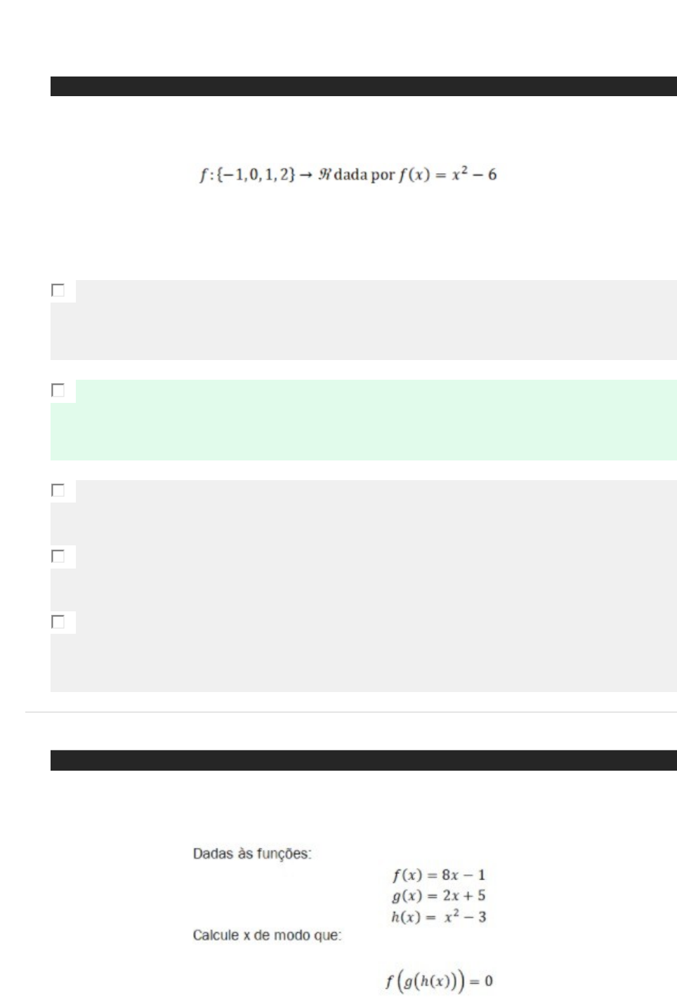 Conteúdo do exercício 1. Pergunta 1 0/0 Verifique se a seguinte função é sobrejetora ou não. Ocultar opções de resposta Não, não podemos considerar a função sobrejetora, pois, de acordo com a verificação, para todo elemento do contradomínio de uma função é imagem de pelo menos um elemento do domínio de outra. Correta: Sim, podemos considerar a função sobrejetora, pois, de acordo com a verificação, para todo elemento do contradomínio de uma função é imagem de pelo menos um elemento do domínio de outra. Resposta correta Sim, pois toda função quadrática é sobrejetora. Não, pois não existem funções sobrejetoras para função quadráticas. Sim, podemos considerar a função sobrejetora, pois, de acordo com a verificação, para quase todos os elementos do contradomínio de uma função são imagem de pelo menos um elemento do domínio de outra. 2. Pergunta 2 0/0 Ocultar opções de resposta 2/3 8/5 Correta: ¾ Resposta correta 9/4 1/3 3. Pergunta 3 0/0 Verifique se a função abaixo é um função injetora, lembrando sempre que, para que um função seja injetora entre dois conjuntos quaisquer, A e B, há uma regra que permite associar a cada elemento de A um único elemento de B. Ocultar opções de resposta Sim, a função é injetora mesmo não tendo todos os elementos do domínio. Não, a função não é injetora pois possui mais de um elemento do conjunto imagem para cada elemento do domínio. Resposta correta Incorreta: Sim, a função é injetora pois possui mais de um elemento do conjunto imagem para cada elemento do domínio. Não, e função não é injetora, pois cada elemento do domínio tem um elemento correspondente na imagem. Sim, a função é injetora e cada elemento do domínio tem um elemento correspondente na imagem. 4. Pergunta 4 0/0 Ocultar opções de resposta 15 e 20 20 e 10 Incorreta: 0 e 15 0 e 10 Resposta correta 10 e 10 5. Pergunta 5 0/0 Ocultar opções de resposta 15 -3 Incorreta: 8 5 -4 Resposta correta 6. Pergunta 6 0/0 Dadas as afirmativas, I. Uma função f: A ⇒ B é injetora, se, dados dois elementos distintos quaisquer de A, esses correspondem a duas imagens distintas de B. II. Uma função f: A ⇒ B é sobrejetora quando todo elemento do conjunto B é imagem de pelo menos um elemento do conjunto A. III. Uma função f: A ⇒ B é bijetora se ela for, simultaneamente, injetora e sobrejetora. É correto afirmar que: Ocultar opções de resposta i e ii são verdadeiras ii e iii são verdadeiras i é verdadeira i e a iii são verdadeiras Correta: i, ii e iii são verdadeiras Resposta correta 7. Pergunta 7 0/0 9+ 8x Incorreta: 15 + 12x 8x+9 6x + 8 Resposta correta 30x + 15 8. Pergunta 8 0/0 Sabe-se que para uma função ser bijetora é necessário que esta função seja injetora e sobrejetora ao mesmo tempo. De acordo com as condições da função citadas, verifique se a função abaixo é bijetora: Sim, a função é bijetora pois é quadrática. Não, a função não é bijetora por é uma função modular. Correta: Sim, a função é bijetora pois obedece as regras das funções injetora e sobrejetora ao mesmo tempo. Resposta correta Sim, ela é bijetora pois é uma função modular e quadrática ao mesmo tempo. Não, a função não é bijetora, pois obedece as regras das funções injetora e sobrejetora ao mesmo tempo. 9. Pergunta 9 0/0 Sabe- se que a função inversa é um tipo de função bijetora (sobrejetora e injetora). Isso porque os elementos de uma função A possui um elemento correspondente de uma função B e sendo assim, é possível trocar os conjuntos e associar cada elemento de B com os de A. Em concordância com a definição acima, determine a inversa da função: y = 3x - 5 Correta: Resposta correta 10. Pergunta 10 0/0 Seja as funções f (x) = −2x e g (x) = 4x – 5 determine a função g (f (x)). Ocultar opções de resposta g (f (x)) = −2x + 5 g (f (x)) = 8x − 5 g (f (x)) = x – 3 g (f (x)) = −8x – 5 Resposta correta Incorreta: g (f (x)) = 6x + 5 image3.jpeg image4.jpeg image5.jpeg image6.jpeg image7.jpeg image1.jpeg image8.png image9.svg y = x + 5 3 image2.wmf