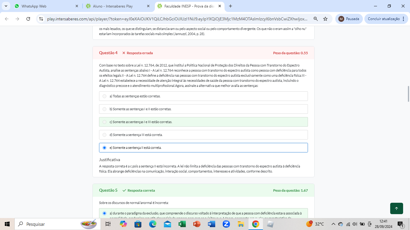 WhatsApp Web Aluno Intersaberes Play Faculdade INESP Prova da dis + Pausada Concluir atualização os mais lesados, que se distinguiam, se distanciavam ou pelo aspecto social ou pelo comportamento Os que não eram assim a "olho estariam incorporados às tarefas sociais mais simples (Jannuzzi, 2004, 28). Questão 4 Resposta errada Peso da questão: 0.55 Com base no texto sobre a Lei n. de que institui a Política Nacional de Proteção dos Direitos da Pessoa com Transtorno do Espectro analise as sentenças A Lei reconhece a pessoa com transtorno do espectro autista como pessoa com deficiência para todos efeitos legais.I ALei in define a deficiência nas pessoas com transtorno do espectro autista exclusivamente como uma deficiência III - A Lei estabelece a necessidade de atenção integral às necessidades de saúde da pessoa com transtorno do espectro autista, incluindo diagnóstico precoce e atendimento assinale a alternativa que melhor avalia as a) Todas as sentenças estão b) Somente as sentenças le II estão c) Somente as sentenças le III estão d) Somente a sentença III está correta. e) Somente a sentença II está correta. Justificativa A resposta correta é pois a sentença II está incorreta. A lei não limita a deficiência das pessoas com transtorno do espectro autista à deficiência Ela abrange deficiências na interação social, comportamentos, interesses e conforme Questão 5 Resposta correta Peso da questão: 1.67 Sobre os discursos de normal/anormal a) durante paradigma da que compreende discurso voltado à interpretação de que a pessoa com deficiência estava associada à 12:41 Pesquisar Z 32°C 28/09/2024