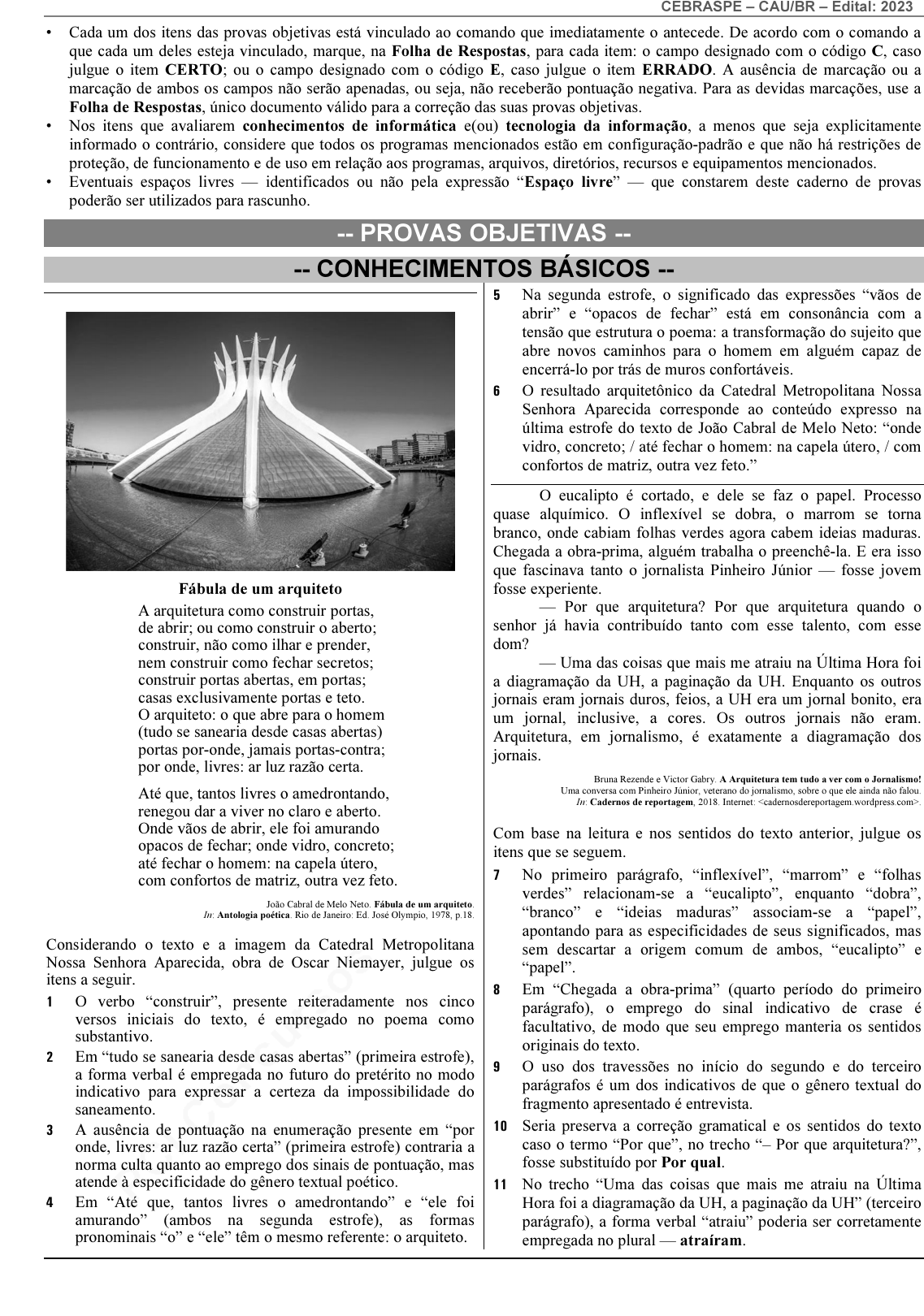 pcimarkpci MDAwMDowMDAwOjAwMDA6MDAwMDowMDAwOmZmZmY6YjEyNTphYzNh:VGh1LCAxOCBKdWwgMjAyNCAxNTo0MjowMiAtMDMwMA== www.pciconcursos.com.br CEBRASPE – CAU/BR – Edital: 2023 • Cada um dos itens das provas objetivas está vinculado ao comando que imediatamente o antecede. De acordo com o comando a que cada um deles esteja vinculado, marque, na Folha de Respostas, para cada item: o campo designado com o código C, caso julgue o item CERTO; ou o campo designado com o código E, caso julgue o item ERRADO. A ausência de marcação ou a marcação de ambos os campos não serão apenadas, ou seja, não receberão pontuação negativa. Para as devidas marcações, use a Folha de Respostas, único documento válido para a correção das suas provas objetivas. • Nos itens que avaliarem conhecimentos de informática e(ou) tecnologia da informação, a menos que seja explicitamente informado o contrário, considere que todos os programas mencionados estão em configuração-padrão e que não há restrições de proteção, de funcionamento e de uso em relação aos programas, arquivos, diretórios, recursos e equipamentos mencionados. • Eventuais espaços livres — identificados ou não pela expressão “Espaço livre” — que constarem deste caderno de provas poderão ser utilizados para rascunho. -- PROVAS OBJETIVAS -- -- CONHECIMENTOS BÁSICOS -- Fábula de um arquiteto A arquitetura como construir portas, de abrir; ou como construir o aberto; construir, não como ilhar e prender, nem construir como fechar secretos; construir portas abertas, em portas; casas exclusivamente portas e teto. O arquiteto: o que abre para o homem (tudo se sanearia desde casas abertas) portas por-onde, jamais portas-contra; por onde, livres: ar luz razão certa. Até que, tantos livres o amedrontando, renegou dar a viver no claro e aberto. Onde vãos de abrir, ele foi amurando opacos de fechar; onde vidro, concreto; até fechar o homem: na capela útero, com confortos de matriz, outra vez feto. João Cabral de Melo Neto. Fábula de um arquiteto. In: Antologia poética. Rio de Janeiro: Ed. José Olympio, 1978, p.18. Considerando o texto e a imagem da Catedral Metropolitana Nossa Senhora Aparecida, obra de Oscar Niemayer, julgue os itens a seguir. 1 O verbo “construir”, presente reiteradamente nos cinco versos iniciais do texto, é empregado no poema como substantivo. 2 Em “tudo se sanearia desde casas abertas” (primeira estrofe), a forma verbal é empregada no futuro do pretérito no modo indicativo para expressar a certeza da impossibilidade do saneamento. 3 A ausência de pontuação na enumeração presente em “por onde, livres: ar luz razão certa” (primeira estrofe) contraria a norma culta quanto ao emprego dos sinais de pontuação, mas atende à especificidade do gênero textual poético. 4 Em “Até que, tantos livres o amedrontando” e “ele foi amurando” (ambos na segunda estrofe), as formas pronominais “o” e “ele” têm o mesmo referente: o arquiteto. 5 Na segunda estrofe, o significado das expressões “vãos de abrir” e “opacos de fechar” está em consonância com a tensão que estrutura o poema: a transformação do sujeito que abre novos caminhos para o homem em alguém capaz de encerrá-lo por trás de muros confortáveis. 6 O resultado arquitetônico da Catedral Metropolitana Nossa Senhora Aparecida corresponde ao conteúdo expresso na última estrofe do texto de João Cabral de Melo Neto: “onde vidro, concreto; / até fechar o homem: na capela útero, / com confortos de matriz, outra vez feto.” O eucalipto é cortado, e dele se faz o papel. Processo quase alquímico. O inflexível se dobra, o marrom se torna branco, onde cabiam folhas verdes agora cabem ideias maduras. Chegada a obra-prima, alguém trabalha o preenchê-la. E era isso que fascinava tanto o jornalista Pinheiro Júnior — fosse jovem fosse experiente. — Por que arquitetura? Por que arquitetura quando o senhor já havia contribuído tanto com esse talento, com esse dom? — Uma das coisas que mais me atraiu na Última Hora foi a diagramação da UH, a paginação da UH. Enquanto os outros jornais eram jornais duros, feios, a UH era um jornal bonito, era um jornal, inclusive, a cores. Os outros jornais não eram. Arquitetura, em jornalismo, é exatamente a diagramação dos jornais. Bruna Rezende e Victor Gabry. A Arquitetura tem tudo a ver com o Jornalismo! Uma conversa com Pinheiro Júnior, veterano do jornalismo, sobre o que ele ainda não falou. In: Cadernos de reportagem, 2018. Internet: . Com base na leitura e nos sentidos do texto anterior, julgue os itens que se seguem. 7 No primeiro parágrafo, “inflexível”, “marrom” e “folhas verdes” relacionam-se a “eucalipto”, enquanto “dobra”, “branco” e “ideias maduras” associam-se a “papel”, apontando para as especificidades de seus significados, mas sem descartar a origem comum de ambos, “eucalipto” e “papel”. 8 Em “Chegada a obra-prima” (quarto período do primeiro parágrafo), o emprego do sinal indicativo de crase é facultativo, de modo que seu emprego manteria os sentidos originais do texto. 9 O uso dos travessões no início do segundo e do terceiro parágrafos é um dos indicativos de que o gênero textual do fragmento apresentado é entrevista. 10 Seria preserva a correção gramatical e os sentidos do texto caso o termo “Por que”, no trecho “– Por que arquitetura?”, fosse substituído por Por qual. 11 No trecho “Uma das coisas que mais me atraiu na Última Hora foi a diagramação da UH, a paginação da UH” (terceiro parágrafo), a forma verbal “atraiu” poderia ser corretamente empregada no plural — atraíram. pcimarkpci MDAwMDowMDAwOjAwMDA6MDAwMDowMDAwOmZmZmY6YjEyNTphYzNh:VGh1LCAxOCBKdWwgMjAyNCAxNTo0MjowMiAtMDMwMA== www.pciconcursos.com.br CEBRASPE – CAU/BR – Edital: 2023 12 Mantendo-se a correção gramatical do texto, o último parágrafo poderia ser reescrito da seg
