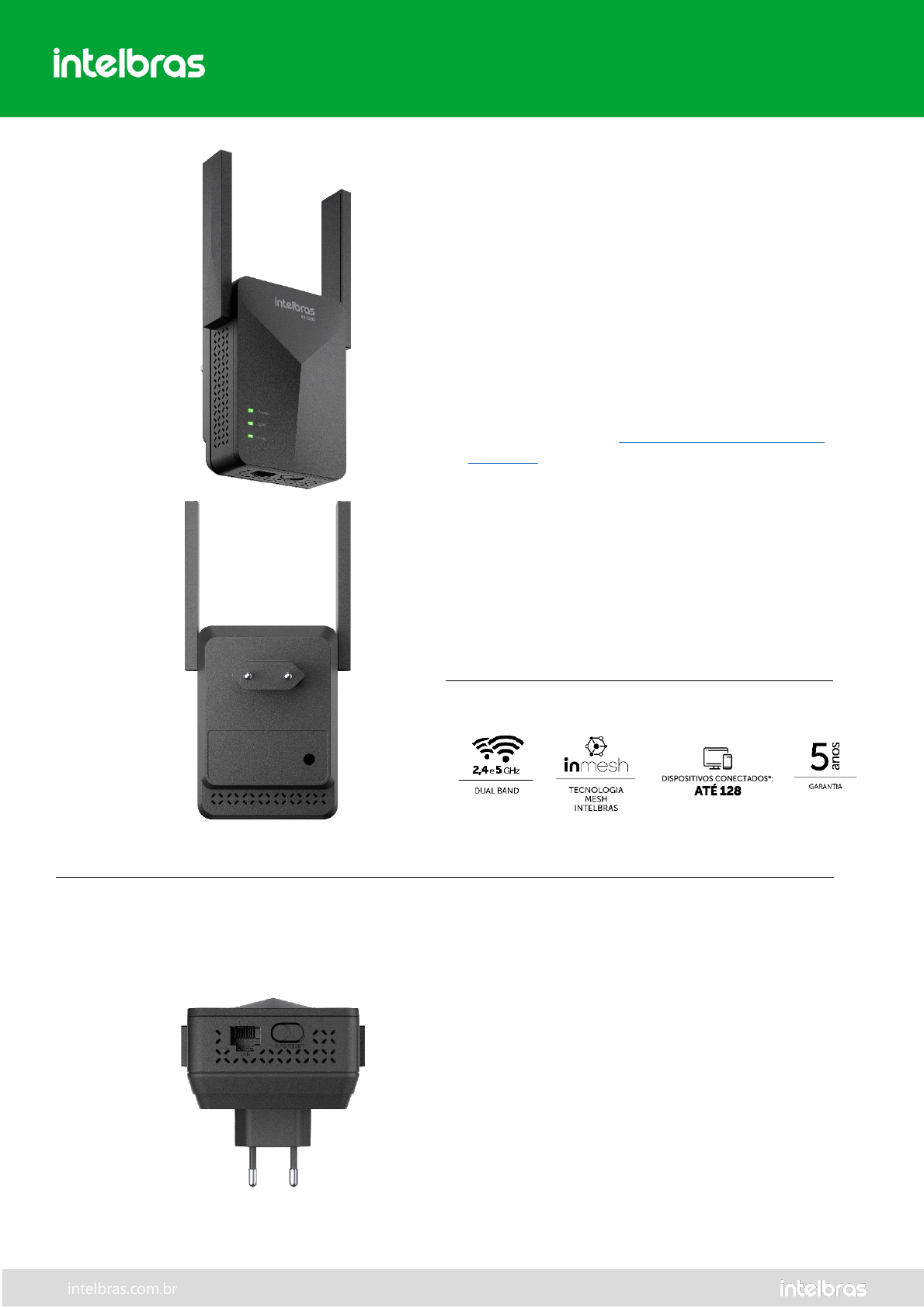 intelbras.com.br EX 1500 Roteador Extensor Mesh Wi-Fi EX 1500 »Tecnologia Wi-Fi 6: protocolo 802.11ax é a nova geração da conexão, capaz de trafegar mais velocidade e dados para mais dispositivos ao mesmo tempo. »AX 1500: composição de 300Mbps em 2,4GHz e 1200Mbps em 5GHz. »Compatível com a tecnologia inMesh: com ela você consegue expandir a área de cobertura de uma rede Wi-Fi formada por roteadores Wi-Force, ONTs WiFiber e outros produtos compatíveis com inMesh. Saiba mais em: https://www.intelbras.com/pt- br/inmesh »Expande rede Wi-Fi em até 100*m² e conecta até 128* dispositivos simultaneamente. » Aplicativo Meu Wi-Fi Intelbras: instale e gerencie e remotamente as informações do seu roteador de forma facilitada »Porta Ethernet: porta giga WAN/LAN que possibilita conexões de alta velocidade tanto no Wi- Fi quanto via cabo de rede. Porta Giga e botão WPS/Reset para fácil configuração de seus dispositivos. https://www.intelbras.com/pt-br/inmesh https://www.intelbras.com/pt-br/inmesh intelbras.com.br Hardware 2 antenas externas de 3 dBi 1 porta Giga Ethernet WAN/LAN Chipset Realtek® RTL8197H + RTL8832BR Memória flash 128 MB Memória RAM 128 MB SO Linux + Bifrost Intelbras Botão RESET/WPS Compatibilidade Plataforma Remotize Tecnologia inMesh (Protocolo EasyMesh) Aplicativo Meu Wi-Fi Intelbras Parâmetros Wireless Padrões IEEE 802.11a/b/g/n/ac/ax Modo do rádio MU-MIMO bidirecional, Beamforming, OFDMA e TWT Modo de operação Roteador, Repetidor Wireless, Ponto de acesso Frequência de operação 2,4 GHz 5 GHz Largura de banda 2,4 GHz: 20 MHz e 20/40 MHz (com coexistência habilitada por padrão) 5 GHz: 20 MHz, 20/40, 20/40/80 MHz (com coexistência habilitada por padrão) Taxa de transmissão 2,4 GHz: até 300 Mbps 5 GHz: até 1200 Mbps Canais de operação 2,4 GHz: 1-13 (Brasil) 5 GHz: 36, 40, 44, 48, 149, 153, 157, 161 Potência máxima (E.I.R.P.) 2,4 GHz (n40 MCS7):