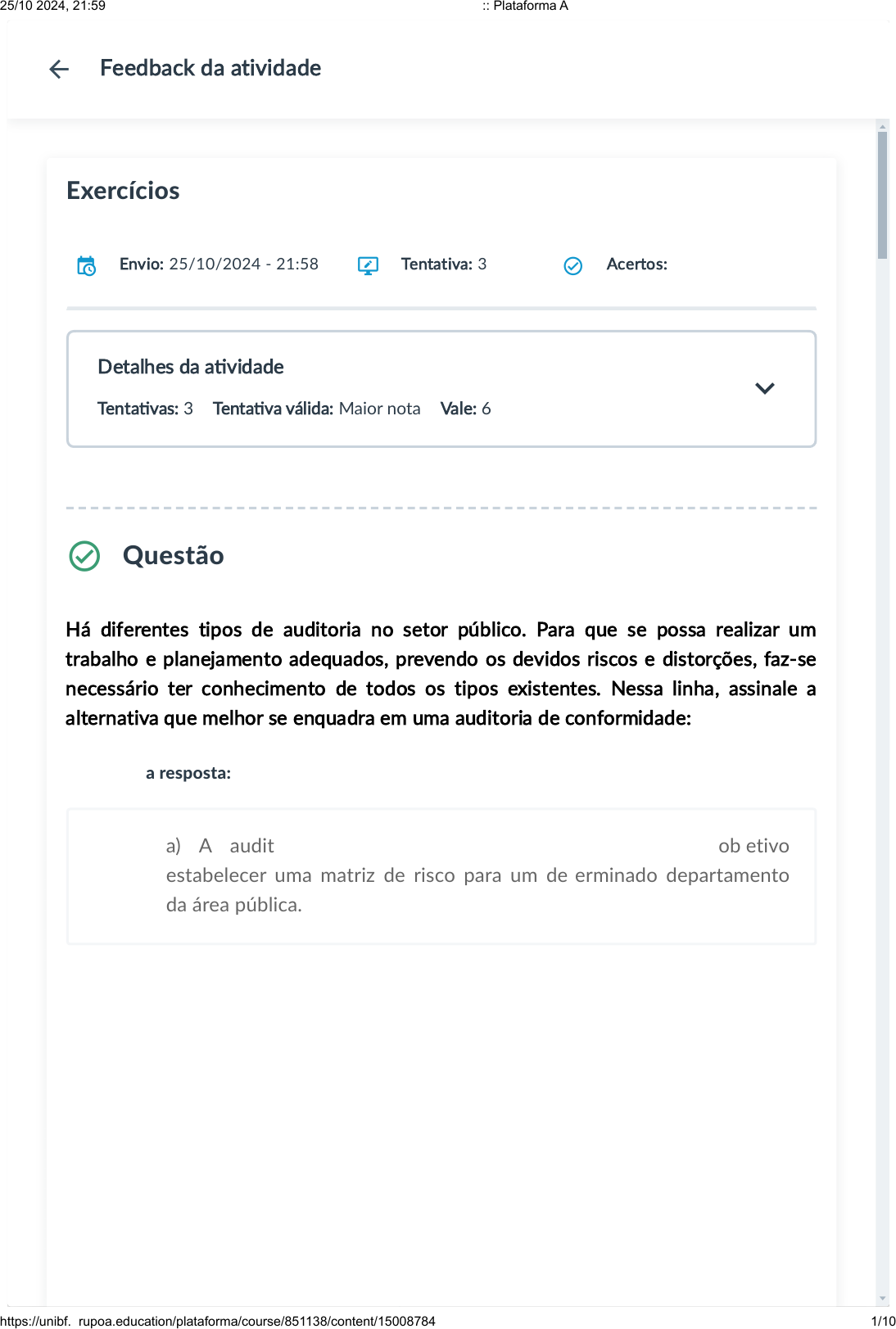 Planejamen de auditori… Apresentação Uma auditoria na área pública é de extrema importância para a sociedade, pois mediante esse trabalho é possível verificar se os recursos públicos estão sendo devidamente aplicados nos respec�vos setores que requerem a lei, e, quando existentes, encontrar irregularidades operacionais, minimizando riscos de distorções relevantes. Para que esse processo ocorra de forma transparente e os auditores consigam executar o trabalho de forma adequada e obter bons resultados, faz-se necessário um bom planejamento, visando aos riscos e distorções possíveis em cada etapa de teste. Apresentação Infográfico Conteúdo do Livro Dica do Professor Exercícios Na prá�ca Saiba mais Planejamento de auditoria: riscos e distorções Disciplina: ANÁLISE E GESTÃO DE RISCO E SEGURANÇA (ANALISE E GESTÃO DE RISCO E SEGURANCA Exercícios Envio: 25/10/2024 - 21:58 Tentativa: 3 de 3 Acertos: 2/5 Questão 1 1,2/1,2 Selecione a resposta: Há diferentes tipos de auditoria no setor público. Para que se possa realizar um trabalho e planejamento adequados, prevendo os devidos riscos e distorções, faz-se necessário ter conhecimento de todos os tipos existentes. Nessa linha, assinale a alternativa que melhor se enquadra em uma auditoria de conformidade: A a) A auditoria de conformidade tem como principal objetivo estabelecer uma matriz de risco para um determinado departamento da área pública. Feedback da atividade Detalhes da a�vidade Tenta�vas: 3 Tenta�va válida: Maior nota Vale: 6 25/10/2024, 21:59 :: Plataforma A https://unibf.grupoa.education/plataforma/course/851138/content/15008784 1/10 Infográfico Nesta Unidade de Aprendizagem, você vai estudar sobre o planejamento de uma auditoria com foco em riscos e distorções. Bons estudos. Ao final desta Unidade de Aprendizagem, você deve apresentar os seguintes aprendizados: Conhecer os princípios que devem ser considerados em um planejamento de auditoria. Atribuir grau de risco aos processos da gestão pública. Elaborar uma matriz de riscos de auditoria. Concluído Acima de qualquer base metodológica, uma auditora deve estar baseada em princípios, os quais nortearão os trabalhos e apoiarão a equipe na construção do plano de trabalho. As questões é�cas estarão presentes em qualquer trabalho, pois, embora a auditoria em questão não tenha a finalidade de encontrar desvios de conduta, é importante que o auditor tenha em mente que esse tema deve ser observado em cada etapa do trabalho. Em seus contatos com auditados, deve estar sempre conduzindo as questões com muito respeito, mantendo os padrões é�cos requeridos. Veja o Infográfico e conheça os princípios-chave de uma auditoria, os quais servem de pilar para amparar o planejamento do trabalho. Apresentação Infográfico Conteúdo do Livro Dica do Professor Exercícios Na prá�ca Saiba mais Planejamento de auditoria: riscos e distorções Disciplina: ANÁLISE E GESTÃO DE RISCO E SEGURANÇA (ANALISE E GESTÃO DE RISCO E SEGURANCA Exercícios Envio: 25/10/2024 - 21:58 Tentativa: 3 de 3 Acertos: 2/5 Questão 1 1,2/1,2 Selecione a resposta: Há diferentes tipos de auditoria no setor público. Para que se possa realizar um trabalho e planejamento adequados, prevendo os devidos riscos e distorções, faz-se necessário ter conhecimento de todos os tipos existentes. Nessa linha, assinale a alternativa que melhor se enquadra em uma auditoria de conformidade: A a) A auditoria de conformidade tem como principal objetivo estabelecer uma matriz de risco para um determinado departamento da área pública. Feedback da atividade 25/10/2024, 21:59 :: Plataforma A https://unibf.grupoa.education/plataforma/course/851138/content/15008784 2/10 Conteúdo do Livro Concluído A elaboração de uma matriz de riscos é uma das principais ferramentas metodológicas u�lizadas pelos auditores no trabalho de combate aos perigos que "rondam" os negócios, e também para direcionar os esforços em relação à des�nação de recursos para execução de trabalhos em campo. Apresentação Infográfico Conteúdo do Livro Dica do Professor Exercícios Na prá�ca Saiba mais Planejamento de auditoria: riscos e distorções Disciplina: ANÁLISE E GESTÃO DE RISCO E SEGURANÇA (ANALISE E GESTÃO DE RISCO E SEGURANCA Exercícios Envio: 25/10/2024 - 21:58 Tentativa: 3 de 3 Acertos: 2/5 Questão 1 1,2/1,2 Selecione a resposta: Há diferentes tipos de auditoria no setor público. Para que se possa realizar um trabalho e planejamento adequados, prevendo os devidos riscos e distorções, faz-se necessário ter conhecimento de todos os tipos existentes. Nessa linha, assinale a alternativa que melhor se enquadra em uma auditoria de conformidade: A a) A auditoria de conformidade tem como principal objetivo estabelecer uma matriz de risco para um determinado departamento da área pública. Feedback da atividade 25/10/2024, 21:59 :: Plataforma A https://unibf.grupoa.education/plataforma/course/851138/content/15008784 3/10 Dica do Professor Acompanhe o capítulo Planejamento de auditoria: riscos e distorções entrega, base teórica desta Unidade de Aprendizagem. Boa leitura! Concluído Apresentação Infográfico Conteúdo do Livro Dica do Professor Exercícios Na prá�ca Saiba mais Planejamento de auditoria: riscos e distorções Disciplina: ANÁLISE E GESTÃO DE RISCO E SEGURANÇA (ANALISE E GESTÃO DE RISCO E SEGURANCA Exercícios Envio: 25/10/2024 - 21:58 Tentativa: 3 de 3 Acertos: 2/5 Questão 1 1,2/1,2 Selecione a resposta: Há diferentes tipos de auditoria no setor público. Para que se possa realizar um trabalho e planejamento adequados, prevendo os devidos riscos e distorções, faz-se necessário ter conhecimento de todos os tipos existentes. Nessa linha, assinale a alternativa que melhor se enquadra em uma auditoria de conformidade: A a) A auditoria de conformidade tem como principal objetivo estabelecer uma matriz de risco para um determinado departamen