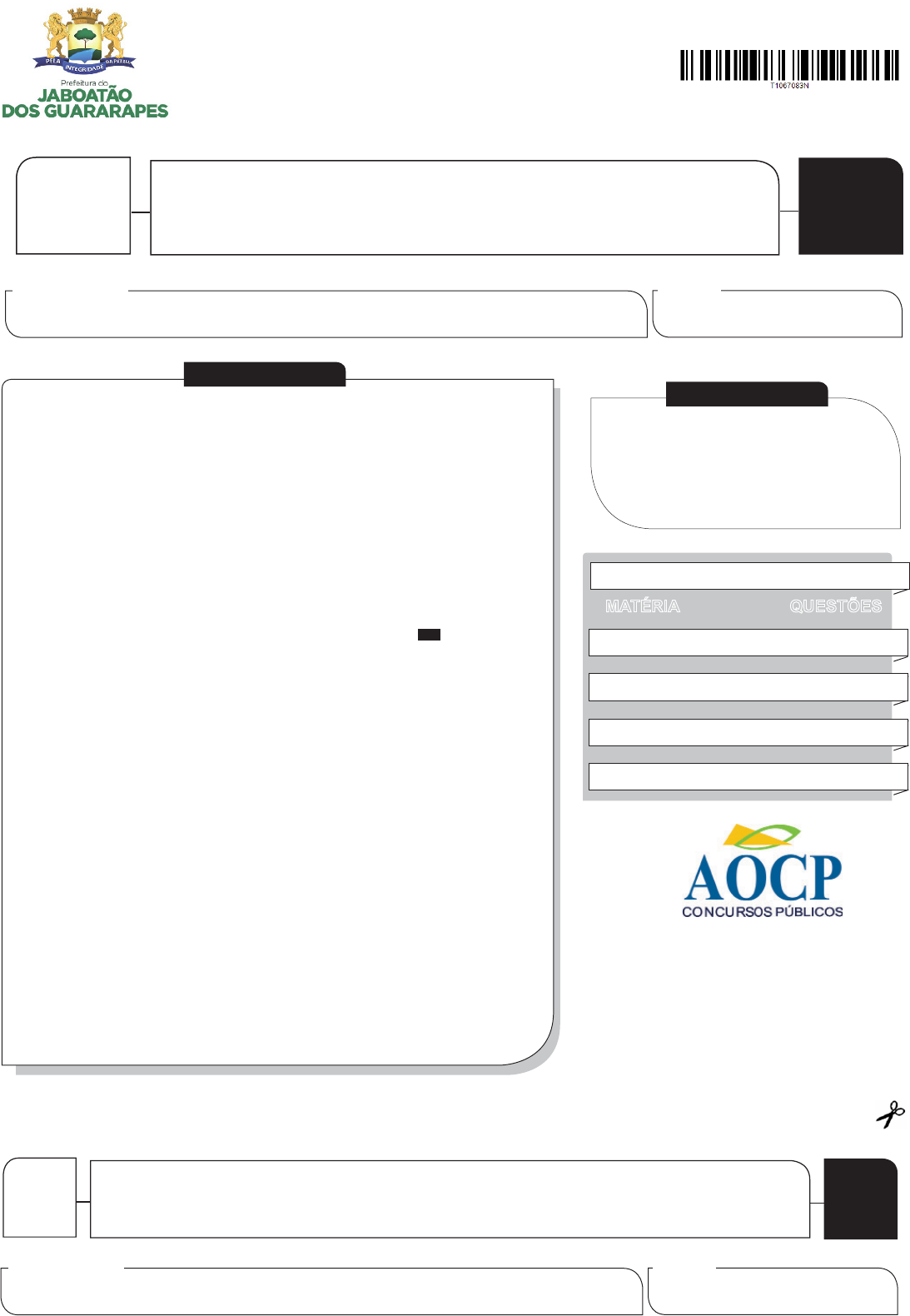 www.pciconcursos.com.br 1. Na sua Folha de Respostas, confira seu nome, o número do seu documento e o número de sua inscrição. Além disso, não se esqueça de conferir seu Caderno de Questões quanto a falhas de impressão e de numeração, e se o curso corresponde àquele para o qual você se inscreveu. NÃO SE ESQUEÇA DE MARCAR O NÚMERO CORRESPONDENTE À SUA PROVA NA FOLHA DE RESPOSTAS. Preencha os campos destinados à assinatura e ao número de inscrição. Qualquer divergência comunique ao fiscal 2. O único documento válido para avaliação da prova é a Folha de Respostas e a Versão Definitiva da Prova Discursiva. Só é permitido o uso de caneta esferográfica transparente de cor azul ou preta para o preenchimento da Folha de Respostas, que deve ser realizado da seguinte maneira: 3. O prazo de realização da prova é de 4 (quatro) horas, incluindo a marcação da Folha de Respostas e a transcrição da Versão Definitiva da Prova Discursiva. Após 60 (sessenta) minutos do início da prova, o candidato estará liberado para utilizar o sanitário ou deixar definitivamente o local de aplicação. Os 3 (três) últimos candidatos só poderão retirar-se da sala juntos. 4. Ao término de sua prova, comunique ao fiscal, devolvendo-lhe a Folha de Respostas e a Versão Definitiva da Prova Discursiva devidamente preenchidas e assinadas. Somente será possível levar o caderno de questões após decorridas 4h (quatro) do início da prova, sendo necessário, obrigatoriamente, devolver ao fiscal a Folha de Respostas e a Versão Definitiva da Prova Discursiva. 5. As provas e os gabaritos preliminares estarão disponíveis no site da AOCP ̶ www.aocp.com.br ̶ no dia posterior à aplicação da prova. 6. Implicará na eliminação do candidato, caso, durante a realização das provas, qualquer equipamento eletrônico venha emitir ruídos, mesmo que devidamente acondicionado no envelope de guarda de pertences. O NÃO cumprimento a qualquer uma das determinações constantes em Edital, no presente Caderno ou na Folha de Respostas, incorrerá na eliminação do candidato. Nome do Candidato Inscrição Nome do Candidato Inscrição CONCURSO PÚBLICO REF. EDITAL N° 001/2015 - NÍVEL SUPERIOR - TARDE CARGO: PROVA PROVA 1ANALISTA EM SAÚDE - ESPECIALIDADE EDUCADOR FÍSICO EXCLUSIVO ESF PROVA 1 PREFEITURA MUNICIPAL DO JABOATÃO DOS GUARARAPES ESTADO DO PERNAMBUCO QUESTÕES Língua Portuguesa 01 a 15 MATÉRIA Conhecimentos Gerais 21 a 25 Conhecimentos Específicos 26 a 40 Discursivas 1 e 2 Informática 16 a 20 CARGO: -------------------------------------------------------------------------- destaque aqui ------------------------------------------------------------- Instruções O Caderno de questões possui 2 (duas) questões discursivas e 40 (quarenta) questões objetivas, numeradas sequencialmente, de acordo com o exposto no quadro a seguir: Atenção ANALISTA EM SAÚDE - ESPECIALIDADE EDUCADOR FÍSICO EXCLUSIVO ESF www.pciconcursos.com.br O gabarito oficial preliminar e o caderno de questões da prova objetiva estarão disponíveis no endereço eletrônico www.aocp.com.br no dia seguinte à aplicação da prova. Questão Resp. 01 02 03 04 05 06 07 08 09 10 11 12 13 14 15 16 17 18 19 20 21 22 23 24 25 26 27 28 29 30Questão Resp. 31 32 33 34 35 36 37 38 39 40 PREFEITURA MUNICIPAL DO JABOATÃO DOS GUARARAPES - ESTADO DO PERNAMBUCO CONCURSO PÚBLICO - REF. EDITAL N° 001/2015 www.pciconcursos.com.br 3Cargo: Analista em Saúde - Especialidade Educador Físico Exclusivo ESF 1. _______________________________________________________________________________________________________ 2. _______________________________________________________________________________________________________ 3. _______________________________________________________________________________________________________ 4. _______________________________________________________________________________________________________ 5. _______________________________________________________________________________________________________ 6. _______________________________________________________________________________________________________ 7. _______________________________________________________________________________________________________ 8. _______________________________________________________________________________________________________ 9. _______________________________________________________________________________________________________ 10. _______________________________________________________________________________________________________ 11. _______________________________________________________________________________________________________ 12. _______________________________________________________________________________________________________ 13. _______________________________________________________________________________________________________ 14. _______________________________________________________________________________________________________ 15. _______________________________________________________________________________________________________ R A S C U N H O - D I S C U R S I VA Para que haja movimento, é necessário que os músculos se contraiam. A contração muscular é um processo que envolve várias proteínas celulares e sistemas de produção de energia. O resultado deste processo é o deslizamento dos filamentos de actina sobre os de miosina, fazendo com que o músculo encurte e, consequentemente, desenvolva tensão. Diante desta afirmação, descreva e explique os tipos de contração muscular. QUESTÃO 01 1. A prova discursiva será avaliada considerando-se os seguintes aspectos: a) o conhecimento técnico-científico sobre a matéria; b) o atendimento ao tema proposto na questão; c) a clareza de argumentação/senso crítico; d) a utilização adequada da Língua Portuguesa. 2. O candidato terá sua prova discursiva avaliada com nota 0 (zero) em caso de: a) não atendim