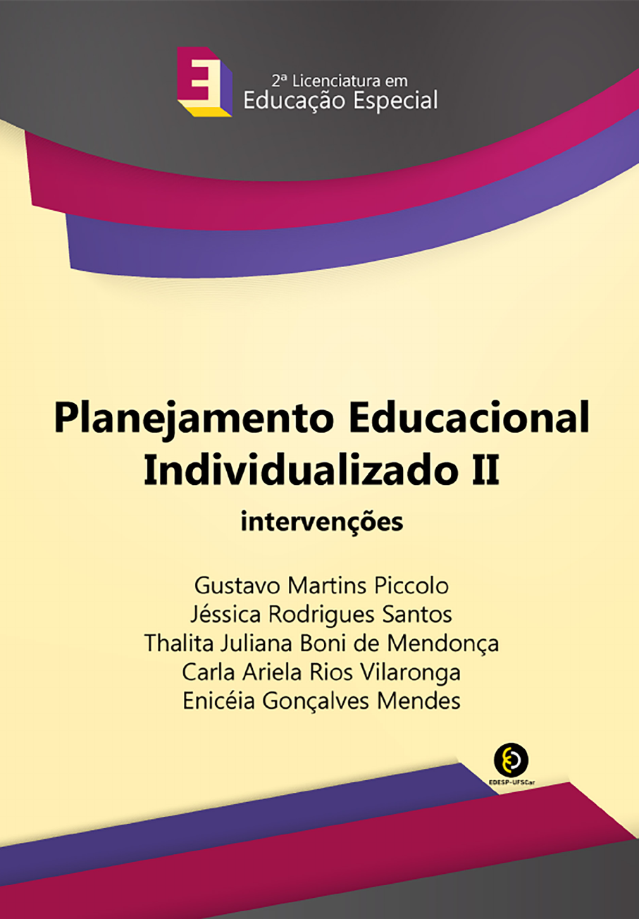 PLANEJAMENTO EDUCACIONAL INDIVIDUALIZADO II intervenções UFSCar – Universidade Federal de São Carlos Reitora Profa. Dra. Ana Beatriz de Oliveira Vice-Reitora Maria de Jesus Dutra dos Reis EDESP - Editora de Educação e Acessibilidade da UFSCar Diretor Nassim Chamel Elias Editores executivos Adriana Garcia Gonçalves Clarissa Bengtson Douglas Pino Rosimeire Maria Orlando Conselho editorial Adriana Garcia Gonçalves Carolina Severino Lopes da Costa Clarissa Bengtson Gerusa Ferreira Lourenço Juliane Ap. de Paula Perez Campos Marcia Duarte Galvani Mariana Cristina Pedrino Nassim Chamel Elias (Presidente) Rosimeire Maria Orlando Vanessa Cristina Paulino Vanessa Regina de Oliveira Martins CAPES - Coordenação de Aperfeiçoamento de Pessoal de Nível Superior Universidade Aberta do Brasil Coleção: Segunda Licenciatura em Educação Especial Coordenação: Rosimeire Maria Orlando PLANEJAMENTO EDUCACIONAL INDIVIDUALIZADO II intervenções Gustavo Martins Piccolo Jéssica Rodrigues Santos Thalita Juliana Boni de Mendonça Carla Ariela Rios Vilaronga Enicéia Gonçalves Mendes São Carlos, 2022 © 2022, dos autores Projeto gráfico e capa Clarissa Bengtson Bruno Prado Santos Preparação e revisão de texto Paula Sayuri Yanagiwara Editoração eletrônica Bruno Prado Santos P712p Planejamento Educacional Individualizado II : Intervenções / Gustavo Martins Piccolo ... [et al.]. -- Documento eletrônico -- São Carlos : EDESP-UFSCar, 2022. 31 p. ISBN: 978-65-89874-48-5 1. Planejamento educacional. 2. Inclusão escolar. 3. Educação especial. I. Título. CDD: 371.207 (20a) CDU: 378.145 Ficha catalográfica elaborada na Biblioteca Comunitária da UFSCar Bibliotecário responsável: Ronildo Santos Prado - CRB/8 7325 SUMÁRIO Mensagem aos estudantes . . . . . . . . . . . . . . . . . . . . . . . . . . . . . . . . . . . . . . . . . . . . . . . . . . . . . . . . . . . . . . . . . . 7 Introdução às unidades . . . . . . . . . . . . . . . . . . . . . . . . . . . . . . . . . . . . . . . . . . . . . . . . . . . . . . . . . . . . . . . . . . . . . . 9 1 Modelos de PEI . . . . . . . . . . . . . . . . . . . . . . . . . . . . . . . . . . . . . . . . . . . . . . . . . . . . . . . . . . . . . . . . . . . . . . . . . . .13 2 Estudo de Caso na implantação de um programa de Planejamento Educacional Individualizado: O caso de Bruno . . . . . . . . . . . . . . . . . . . . . . . . . . . . . . . . . . . .21 Síntese e apontamentos futuros . . . . . . . . . . . . . . . . . . . . . . . . . . . . . . . . . . . . . . . . . . . . . . . . . . . . . . . . . . .31 Indicação de materiais para estudos complementares . . . . . . . . . . . . . . . . . . . . . . . . . . . .35 Referências . . . . . . . . . . . . . . . . . . . . . . . . . . . . . . . . . . . . . . . . . . . . . . . . . . . . . . . . . . . . . . . . . . . . . . . . . . . . . . . . . . . . . .37 Súmulas curriculares . . . . . . . . . . . . . . . . . . . . . . . . . . . . . . . . . . . . . . . . . . . . . . . . . . . . . . . . . . . . . . . . . . . . . . . .39 Mensagem aos estudantes Nesta disciplina, apresentaremos os fundamentos do Planejamento Educa- cional Individualizado, concentrando nossas atenções sobre os processos de intervenção a partir desse modelo. O Planejamento Educacional Individuali- zado é uma prática educacional capaz de promover contínuas e importantes transformações educacionais geradoras de impacto positivo em todas as relações que compreendem o universo escolar, desde a estrutura física até as relações sociais e didáticas propriamente ditas, uma vez que parte do su- posto de uma avaliação ampla que considera uma multiplicidade de instân- cias interatuantes no processo de aprendizagem do estudante, inclusive o meio externo. Trata-se de vertente pouco desenvolvida em terras brasileiras, sendo esporadicamente utilizada por aqui, ainda que em países como Esta- dos Unidos, França, Itália e Espanha possua larga margem de aplicabilidade e relativo tempo histórico de maturação enquanto ferramenta condutora das complexas relações que envolvem ensino e aprendizagem ao público-alvo da Educação Especial (PAEE). Neste segundo volume que tratamos sobre Planejamento Educacional Individualizado, esperamos que o caminhar por essa vertente seja prazeroso, gerador de dúvidas e questionamentos e que promova a transformação e um repensar das práticas pedagógicas. Introdução às unidades A presente disciplina de Planejamento Educacional Individualizado II focará na apresentação de intervenções em sala de aula, objetivando conferir visi- bilidade às formas pelas quais os processos avaliativos se operacionalizam em intervenções e à consequente transformação dos processos de apren- dizagem nos alunos, os quais podem ou não fazer parte do público-alvo da Educação Especial. Isso posto, acreditamos ser de cardeal importância reenquadrar como primeiro suposto de sua aplicação a própria ideia que fazemos de avalia- ção. Esta talvez seja a mais inovadora ideia trazida pelo PEI. Ao destacar a avaliação como atividade-meio, e não fim, o PEI confere outra dinâmica ao processo escolar. Desde então, não se é permitido avaliar por avaliar. Perde-se o sentido em pensarmos processos avaliativos bimestrais, se- mestrais ou anuais como elementos garantidores da ultrapassagem de um determinado nível de ensino/série a outro sem projetarmos transições no processo de ensino de determinado aluno. Com isso, não estamos desta- cando que tal prática é incorreta ou deve ser abolida, entretanto, ela não contempla a complexidade do processo que envolve uma avaliação pensada nas estruturas de um Planejamento Educacional Individualizado, tampouco denota um instrumento plasmado na projeção do desenvolvimento como elemento escalar na consubstanciação da humanidade em devir. É avaliar não para punir, julgar ou disciplinar, mas para poder fornecer o melhor ensino possível a esses alunos, para podermos elevar