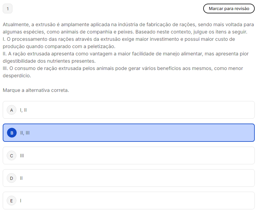1 Marcar para revisão Atualmente, a extrusão é amplamente aplicada na indústria de fabricação de rações, sendo mais voltada para algumas espécies, como animais de companhia e peixes. Baseado neste contexto, julgue os itens a seguir. I. processamento das rações através da extrusão exige maior investimento e possui maior custo de produção quando comparado com a peletização. II. A ração extrusada apresenta como vantagem a maior facilidade de manejo alimentar, mas apresenta pion digestibilidade dos nutrientes presentes. III. consumo de ração extrusada pelos animais pode gerar vários benefícios aos mesmos, como menor desperdício. Marque a alternativa correta. A I, II B II, III C III D E