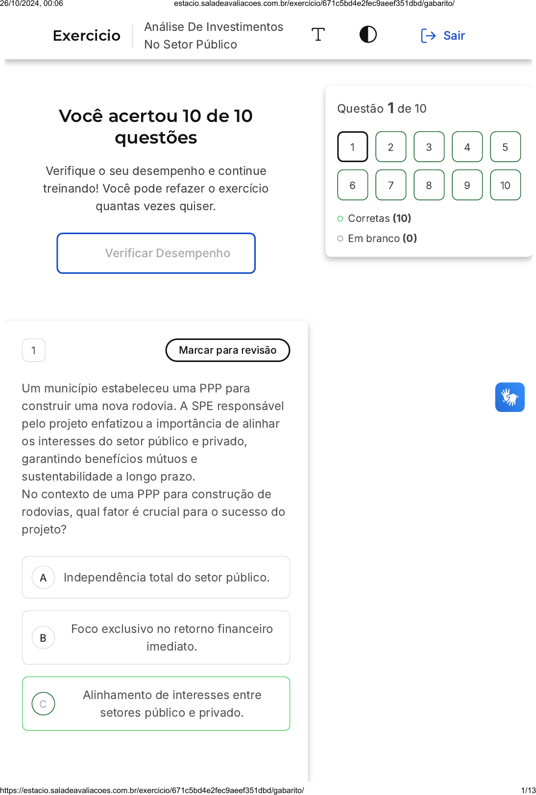 Você acertou 10 de 10 questões Verifique o seu desempenho e continue treinando! Você pode refazer o exercício quantas vezes quiser. Verificar Desempenho A B C 1 Marcar para revisão Um município estabeleceu uma PPP para construir uma nova rodovia. A SPE responsável pelo projeto enfatizou a importância de alinhar os interesses do setor público e privado, garantindo benefícios mútuos e sustentabilidade a longo prazo. No contexto de uma PPP para construção de rodovias, qual fator é crucial para o sucesso do projeto? Independência total do setor público. Foco exclusivo no retorno financeiro imediato. Alinhamento de interesses entre setores público e privado. Questão 1 de 10 Corretas �10� Em branco �0� 1 2 3 4 5 6 7 8 9 10 Exercicio Análise De Investimentos No Setor Público Sair 26/10/2024, 00:06 estacio.saladeavaliacoes.com.br/exercicio/671c5bd4e2fec9aeef351dbd/gabarito/ https://estacio.saladeavaliacoes.com.br/exercicio/671c5bd4e2fec9aeef351dbd/gabarito/ 1/13 D E Redução da participação comunitária. Concentração de todas as operações na esfera privada. Resposta correta Parabéns, você selecionou a alternativa correta. Confira o gabarito comentado! Gabarito Comentado Em Parcerias Público-Privadas, especialmente na construção de rodovias, o alinhamento de interesses entre o setor público e privado é vital. Esse alinhamento assegura que tanto o governo quanto a empresa privada trabalhem em conjunto para o sucesso do projeto, equilibrando objetivos financeiros, operacionais e sociais, o que contribui para a sustentabilidade e eficácia do projeto a longo prazo. 2 Marcar para revisão Em um projeto de infraestrutura realizado por meio de PPP, uma SPE foi criada para gerenciar o desenvolvimento. A SPE focou na divisão clara de responsabilidades entre o setor público e privado, garantindo eficiência e transparência na execução do projeto. Qual o principal benefício da criação de uma SPE em um projeto de PPP? 26/10/2024, 00:06 estacio.saladeavaliacoes.com.br/exercicio/671c5bd4e2fec9aeef351dbd/gabarito/ https://estacio.saladeavaliacoes.com.br/exercicio/671c5bd4e2fec9aeef351dbd/gabarito/ 2/13 A B C D E Diminuição dos custos totais do projeto. Aumento da velocidade de execução do projeto. Segregação de ativos e operações do projeto. Eliminação total dos riscos associados ao projeto. Centralização das decisões estratégicas no setor público. Resposta correta Parabéns, você selecionou a alternativa correta. Confira o gabarito comentado! Gabarito Comentado A criação de uma Sociedade de Propósito Específico �SPE) em um projeto de Parceria Público-Privada �PPP) visa principalmente a segregação de ativos e operações do projeto específico, proporcionando maior clareza na gestão de responsabilidades e recursos. Esta segregação facilita a administração eficiente do projeto, mantendo-o isolado das finanças e operações gerais dos entes envolvidos. 3 Marcar para revisão 26/10/2024, 00:06 estacio.saladeavaliacoes.com.br/exercicio/671c5bd4e2fec9aeef351dbd/gabarito/ https://estacio.saladeavaliacoes.com.br/exercicio/671c5bd4e2fec9aeef351dbd/gabarito/ 3/13 A B C D E Um project finance é viável economicamente se: As dívidas são menores que as receitas As receitas são maiores que as dívidas. As receitas são iguais às dívidas O valor presente líquido do fluxo de caixa do projeto é positivo. O valor presente líquido do fluxo de caixa do projeto é negativo. Resposta correta Parabéns, você selecionou a alternativa correta. Confira o gabarito comentado! Gabarito Comentado A alternativa correta é a que afirma que um project finance é viável economicamente se o valor presente líquido do fluxo de caixa do projeto é positivo. Isso significa que o valor total das entradas de caixa, descontado o custo do capital, é maior do que o valor total das saídas de caixa. Em outras palavras, o projeto está gerando mais dinheiro do que custa para ser realizado, tornando-o economicamente viável. 26/10/2024, 00:06 estacio.saladeavaliacoes.com.br/exercicio/671c5bd4e2fec9aeef351dbd/gabarito/ https://estacio.saladeavaliacoes.com.br/exercicio/671c5bd4e2fec9aeef351dbd/gabarito/ 4/13 A B C D E 4 Marcar para revisão Um projeto de PPP foi iniciado para melhorar a infraestrutura de transportes em uma grande metrópole. A SPE estabelecida focou na integração de soluções tecnológicas avançadas para otimizar o fluxo de tráfego e aumentar a segurança. Em uma PPP voltada para infraestrutura de transporte, qual é um dos objetivos chave? Reduzir a segurança no trânsito para cortar custos. Introduzir tecnologias avançadas para otimizar o tráfego. Limitar o acesso ao transporte público. Concentrar investimentos em áreas de menor movimento. Evitar a manutenção regular das vias. Resposta correta Parabéns, você selecionou a alternativa correta. Confira o gabarito comentado! Gabarito Comentado Em projetos de PPP para a infraestrutura de transporte, a introdução de tecnologias avançadas visa otimizar o fluxo de tráfego e aumentar a segurança. Isso inclui a modernização de sistemas de sinalização, 26/10/2024, 00:06 estacio.saladeavaliacoes.com.br/exercicio/671c5bd4e2fec9aeef351dbd/gabarito/ https://estacio.saladeavaliacoes.com.br/exercicio/671c5bd4e2fec9aeef351dbd/gabarito/ 5/13 A B C D E monitoramento e outras inovações que contribuem para um sistema de transporte mais eficiente e seguro. 5 Marcar para revisão Um projeto de PPP foi lançado para revitalizar a infraestrutura turística de uma região litorânea. A SPE focou em desenvolver atrações sustentáveis e melhorar a acessibilidade, visando aumentar o turismo e beneficiar a economia local. Qual é um dos objetivos principais de uma PPP voltada para a revitalização turística? Restringir o acesso às áreas turísticas para preservar o ambiente. Desenvolver atrações sustentáveis e melhorar a acessibilidade. Focar exclusivamente em turistas internacionais. Diminu