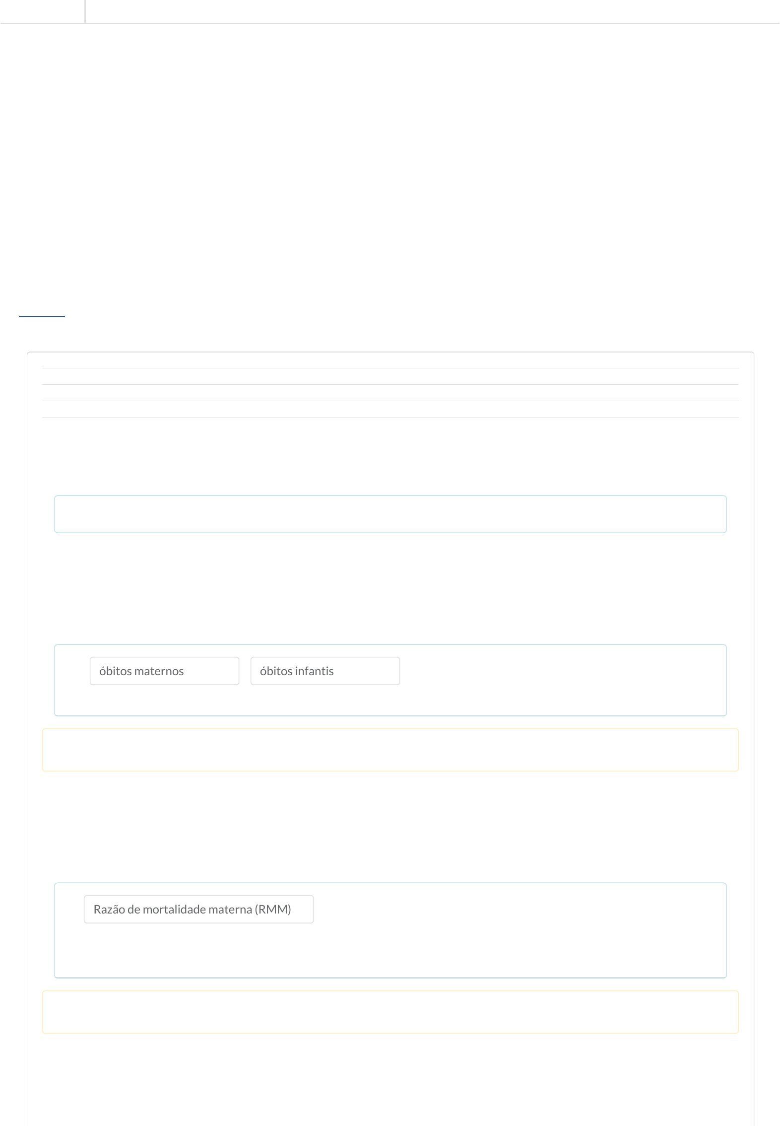 VOLTAR PMM - E3_M09 - Saúde da Mulher Iniciado em Saturday, 26 Oct 2024, 06:59 Estado Finalizada Concluída em Saturday, 26 Oct 2024, 06:59 Tempo empregado 11 segundos Informação Questão 1 Completo Não avaliada Questão 2 Completo Não avaliada Complete a frase com as palavras corretas: Os e devem servir como alerta para a equipe de saúde, e são de investigação obrigatória. óbitos maternos óbitos infantis Sua resposta está correta. A é utilizada para estimar o risco de morte de mulheres ocorrido durante a gravidez, o aborto, o parto ou até 42 dias após o parto, atribuída a causas relacionadas ou agravadas pela gravidez, pelo aborto, pelo parto ou pelo puerpério ou por medidas tomadas em relação a elas. Razão de mortalidade materna (RMM) Sua resposta está correta. BRASIL Acesso à informação https://unasus.ufam.edu.br/unasus/course/view.php?id=30 http://brasil.gov.br/ http://brasil.gov.br/barra#acesso-informacao http://brasil.gov.br/barra#acesso-informacao Questão 3 Completo Não avaliada A estima o risco de morte dos nascidos vivos durante o seu primeiro ano de vida. Mortalidade infantil Sua resposta está correta. ◄ Indicadores de saúde e estatísticas vitais Seguir para... Atividade 3.2 ► BRASIL Acesso à informação https://unasus.ufam.edu.br/unasus/mod/ppuunasus/view.php?id=1135&forceview=1 https://unasus.ufam.edu.br/unasus/mod/quiz/view.php?id=1137&forceview=1 http://brasil.gov.br/ http://brasil.gov.br/barra#acesso-informacao http://brasil.gov.br/barra#acesso-informacao