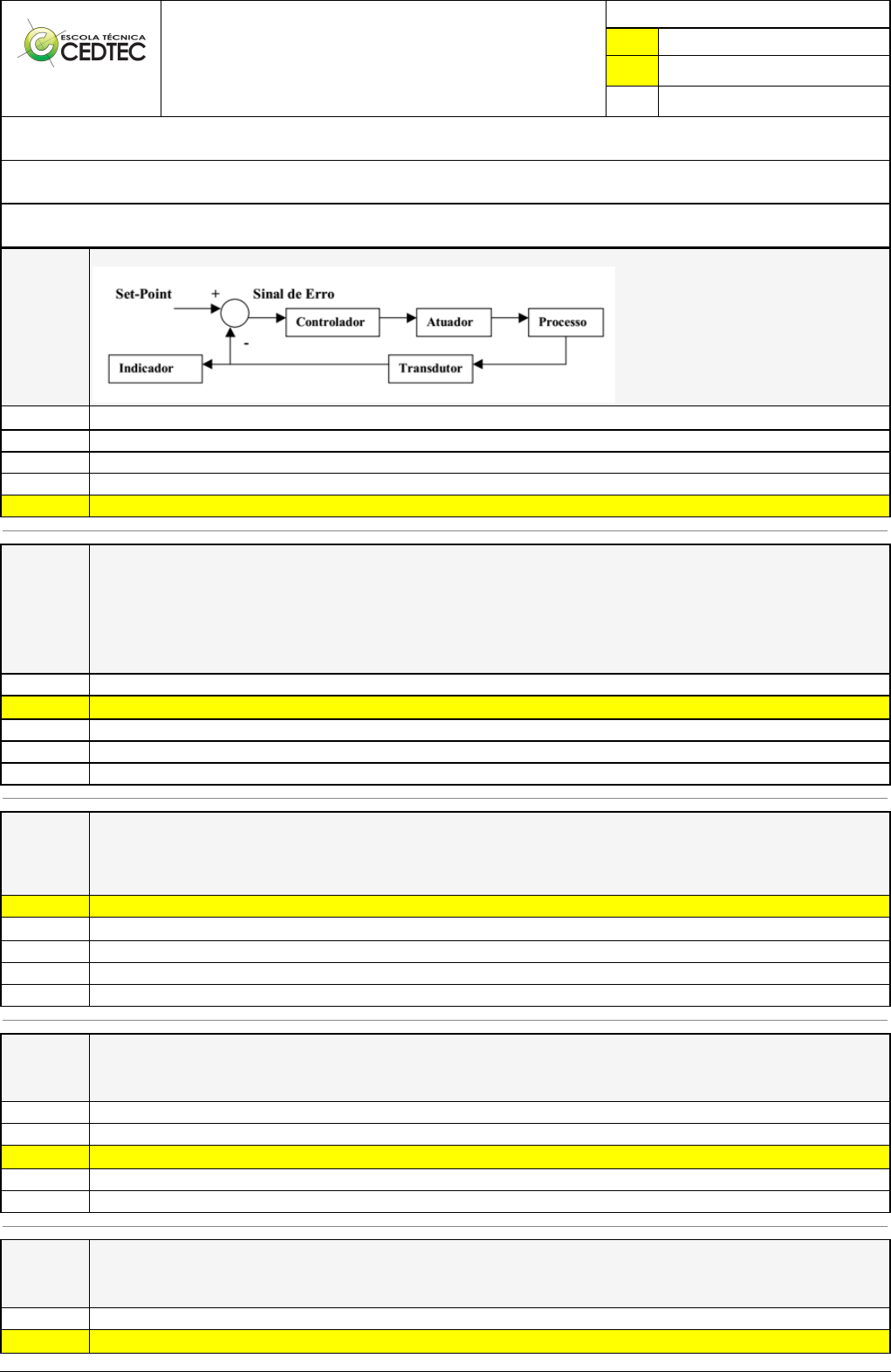 Pincel Atômico - 26/10/2024 10:25:29 1/5 DYEGO MENEZES DA LUZ RODRIGUES Avaliação Presencial (EAD) Atividade finalizada em 04/09/2024 09:47:41 (2502264 / 1) LEGENDA Resposta correta na questão # Resposta correta - Questão Anulada X Resposta selecionada pelo Aluno Disciplina: CONTROLE DE PROCESSOS [1029183] - Avaliação com 20 questões, com o peso total de 51,00 pontos [capítulos - Todos] Turma: Curso Técnico: Automação Industrial - Grupo: EAD - 02/24 - EAD AUT [113128] Aluno(a): 91566128 - DYEGO MENEZES DA LUZ RODRIGUES - Respondeu 12 questões corretas, obtendo um total de 30,60 pontos como nota [350091_1916 18] Questão 001 Com base na figura abaixo, o sistema de controle é classificado em malha fechada porque: X A ação de controle deve ser independente das informações da saída. O indicador e o transdutor devem ser extremamente obrigatórios para o sistema. O controlador deve gerar o sinal para o atuador, com base no sinal piloto, sem obter nenhuma informação sobre o andamento do processo. O indicador, no caso da malha fechada, deve ser um item extremamente obrigatório. A ação de controle deve ser dependente das informações da saída. [350091_1878 ] Questão 002 Um controlador P + I é sensibilizado em um determinado instante por um desvio de 10%. Considerando que este controlador se encontra em uma bancada de teste (malha aberta), calcular a nova saída, aproximadamente 5 segundos após ter sido introduzido o desvio, sabendo-se que: Faixa Proporcional = 60% Ganho Integral = 2 rpm (repetições por minuto) Ação do Controlador = Reversa Saída Anterior So = 12 mA VP > SV 75% X 30% 40% 70% 50% [350091_8086 ] Questão 003 Sobre Faixa proporcional, podemos afirmar que: I - Quanto maior a faixa proporcional, maior será o movimento da válvula em relação ao mesmo desvio e, portanto, mais eficiente será a ação proporcional II - Se a faixa proporcional for igual a zero, a ação proporcional deixa atuar, passando então a ser um controle de ação liga-desliga III – A relação entre FP e KP é: FP= 100/Kp Afirmativas II e III estão corretas X Somente a afirmativa I está correta Afirmativas I e II estão corretas Somente a afirmativa II está correta; Todas afirmativas estão corretas [350091_6443 6] Questão 004 Em problemas de controle de processos, quanto à variável de temperatura, as ações de controle utilizadas são? Proporcional (P). Integral e Derivativa (ID). X Proporcional, Integrativa e Derivativa (PID). Proporcional e Derivativa (PD). Proporcional e Integral (PI). [350091_8071 ] Questão 005 Qual definição de Set point ? Variável de saída no controlador que define o valor desejado da variável controlada X Variável de entrada no controlador que define o valor desejado da variável controlada Pincel Atômico - 26/10/2024 10:25:29 2/5 Variável de entrada no transmissor que define o valor desejado da variável manipulada Variável de saída no transmissor que define o valor desejado da variável controlada Variável de entrada no transmissor que define o valor desejado da variável controlada [350091_6445 4] Questão 006 Informe se é verdadeiro (V) ou falso (F) o que se afirma a seguir, em relação ao controlador PID, e assinale a alternativa com a sequência correta: ( ) Kp é chamado de ganho proporcional. ( ) Td é chamado de tempo descritivo. ( ) Ti é chamado de tempo integral. ( ) Existem dois métodos de Ziegler-Nichols para determinação de Kp, Ti e Td. F – F – F – V. V – V – F – F F – F – V – F. V – V – V – F. X V – F – V – V. [350091_6444 7] Questão 007 Em um sistema de controle em malha fechada, a planta é o elemento que possui a(s) variável(eis): Medida(s). Erro. X A ser(em) controlada(s). De referência. Manipulada(s). [350091_8072 ] Questão 008 Qual definição de Variável manipulada: Variável sempre operada pelo operador X Variável sobre a qual se age para corrigir as variações da variável controlada Variável fixa no processo quando o controle está em automático Variável sobre a qual se age para corrigir os erros de off set Variável de entrada no controlador que define o valor desejado da variável controlada [350091_6444 9] Questão 009 Historicamente, os CLPs, Controladores Lógicos Programáveis, podem ser classificados em categorias. Em relação aos de quinta geração, assinale a alternativa correta: Foi quando apareceram as linguagens de programação de nível médio. Possuem uma entrada introduzida para comunicação serial, e a programação passa a ser feita por meio de microcomputadores. Eram os CLPs em que era necessário conhecer o hardware do equipamento, ou seja, a eletrônica do projeto do CLP. X Vêm como padrões de protocolo de comunicação para facilitar a interface com equipamentos de outros fabricantes, e também como Sistemas Supervisórios e Redes Internas de comunicação. Passam a ter uma entrada de programação que era feita por meio de um teclado, ou programador portátil, conectado a este. [350091_1916 27] Questão 010 Tem-se um controlador de malha fechada, usando controle PID (Proporcional + Integral + Derivativo) para estabilizar a temperatura em um sistema de estufa. Num determinado momento, o operador do sistema, percebendo que o valor da temperatura real estava distante do valor de referência ajustado (Set Point), atuou em um dos controles do controlador e observou que, depois de sua interferência, o valor da temperatura não variou, até que, algum tempo depois, o sistema entrou em oscilação com a temperatura variando no entorno de seu valor anterior, sem convergir a nenhum valor. O operador então retornou o controle atuado à sua posição original e, depois do sistema estabilizado, atuou em um segundo controle. Após esta segunda tentativa, ele observou que a temperatura oscilou em torno do Set Point, porém, desta vez, convergiu a um valor tal que minimizou muito o erro em regime. É correto afirmar que na primeira tentativa o opera