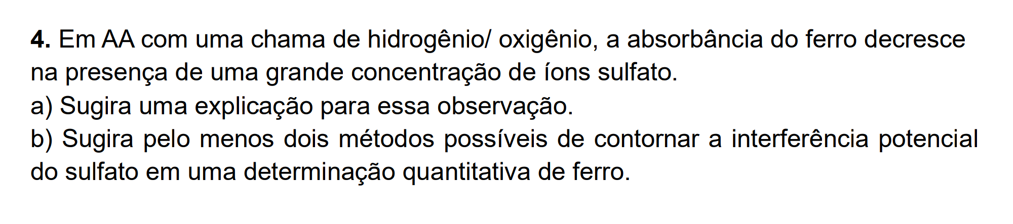 4. Em AA com uma chama de hidrogênio/ oxigênio, a absorbância do ferro decresce na presença de uma grande concentração de íons sulfato. a) Sugira uma explicação para essa observação. b) Sugira pelo menos dois métodos possíveis de contornar a interferência potencial do sulfato em uma determinação quantitativa de ferro.